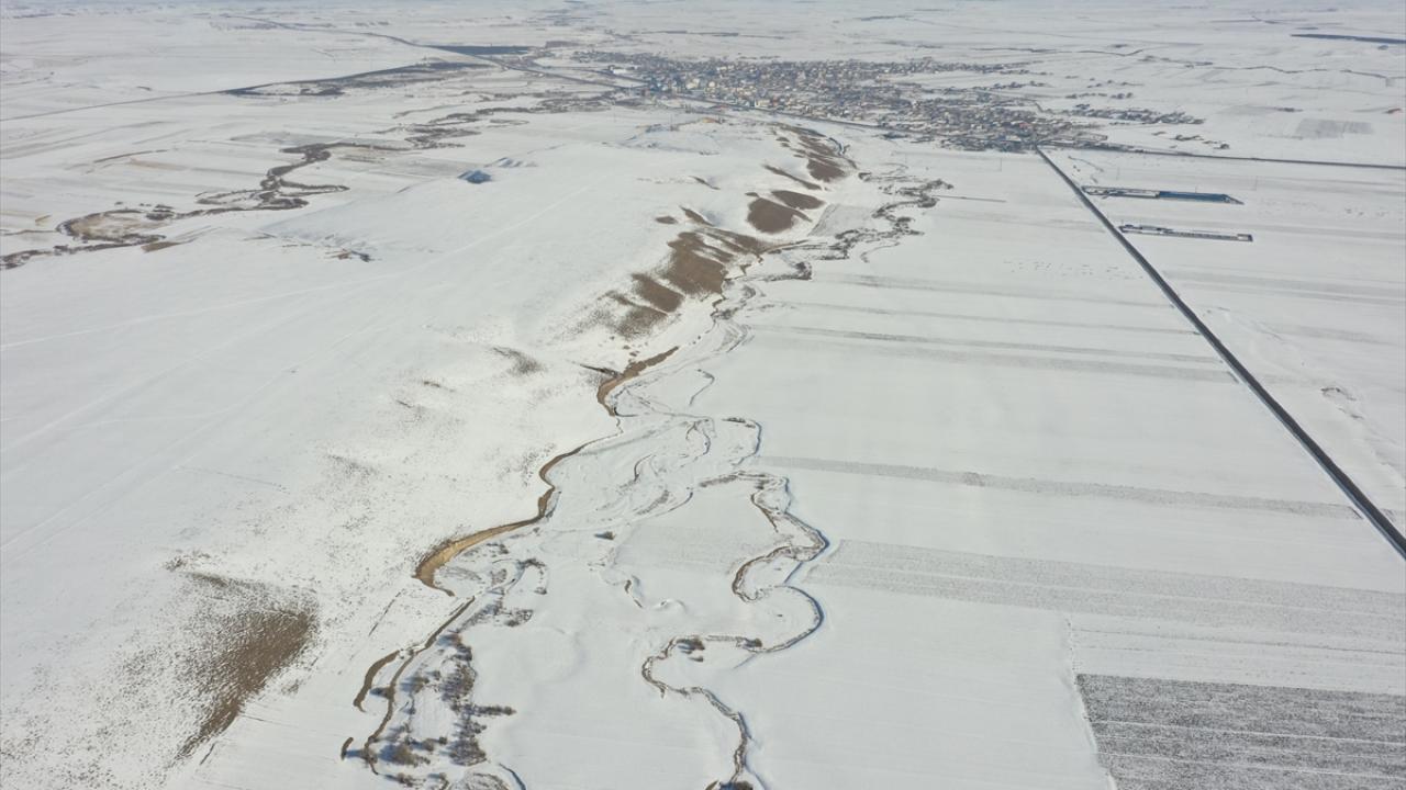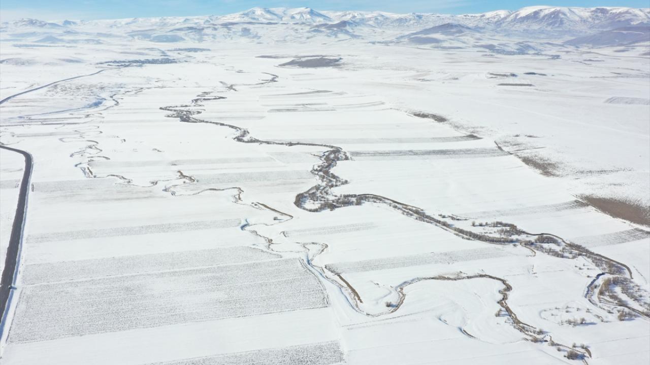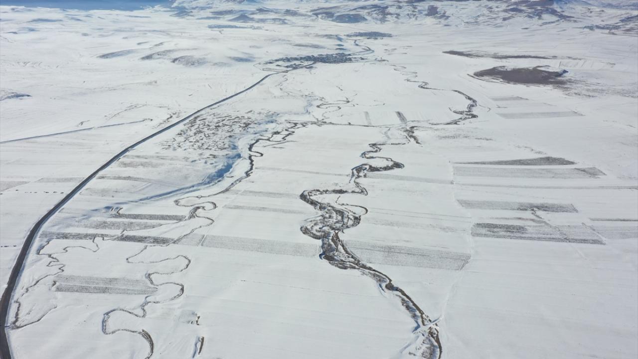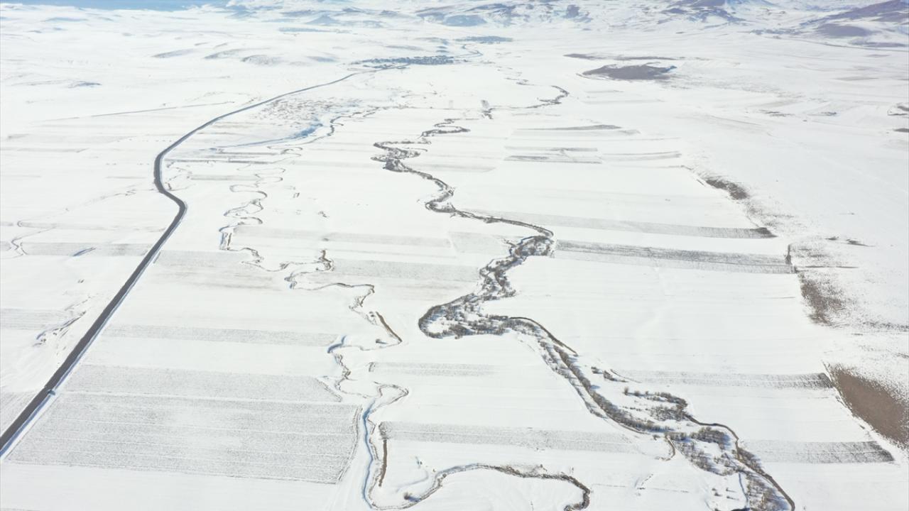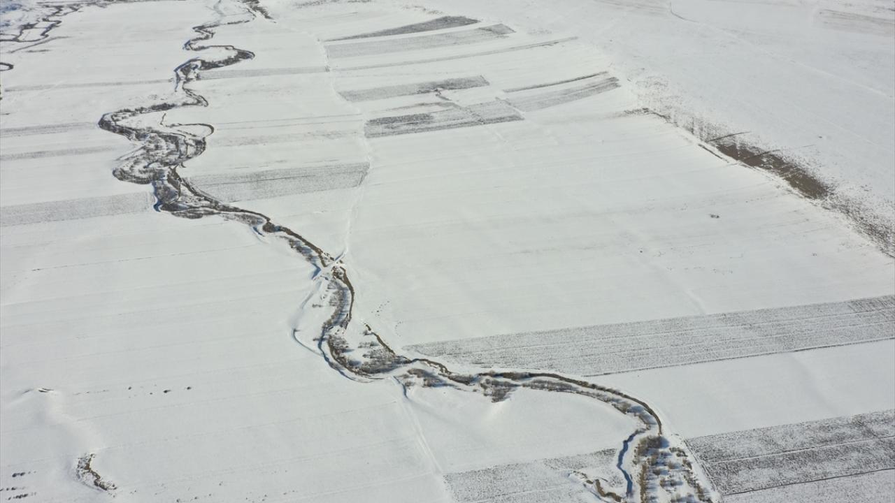 Beyazla kaplanan arazilerde görsel güzellik sunan menderesler dronla görüntülendi.