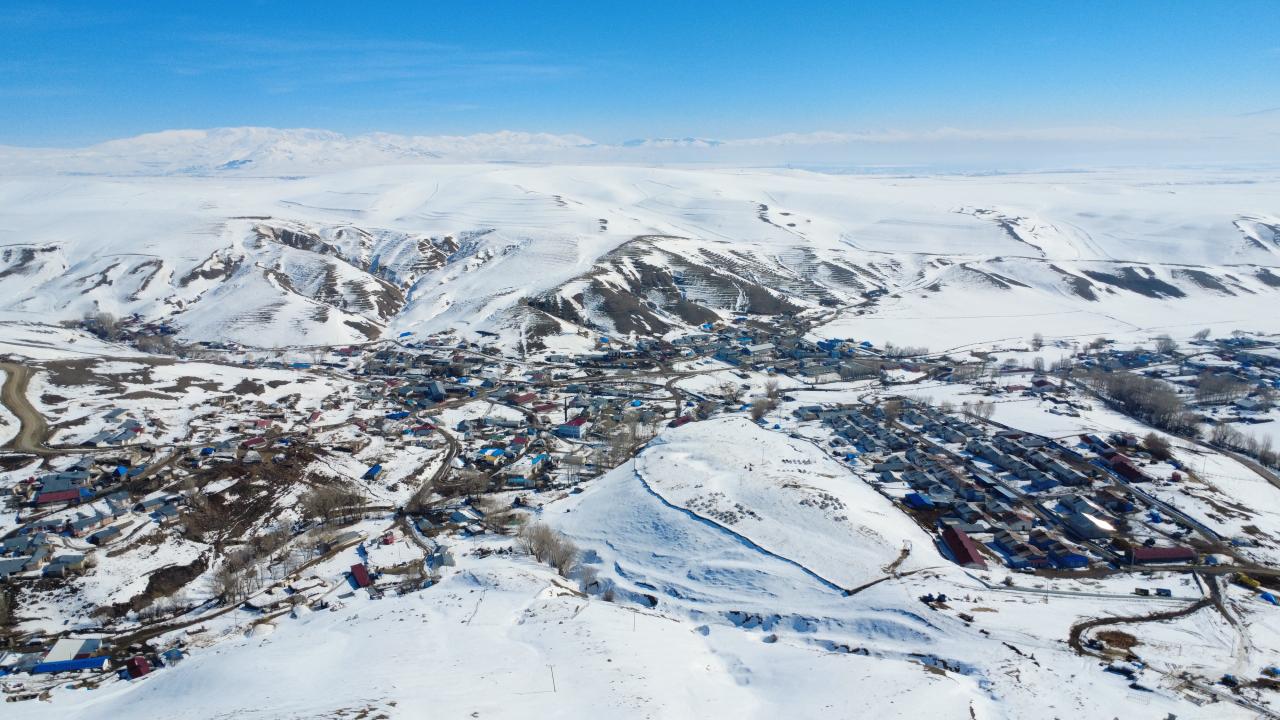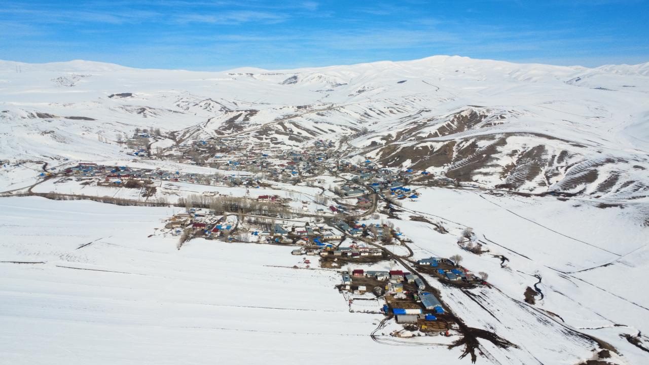 Yoğun kar yağışının ardından köyde evlerin çatıları, yollar ve geniş meralar karla kaplandı. Sınır hattına komşu konumda bulunan yerleşim yerinde, sınır boyunca uzanan tepeler ve bozkır araziler beyaz örtüyle bütünleşti.