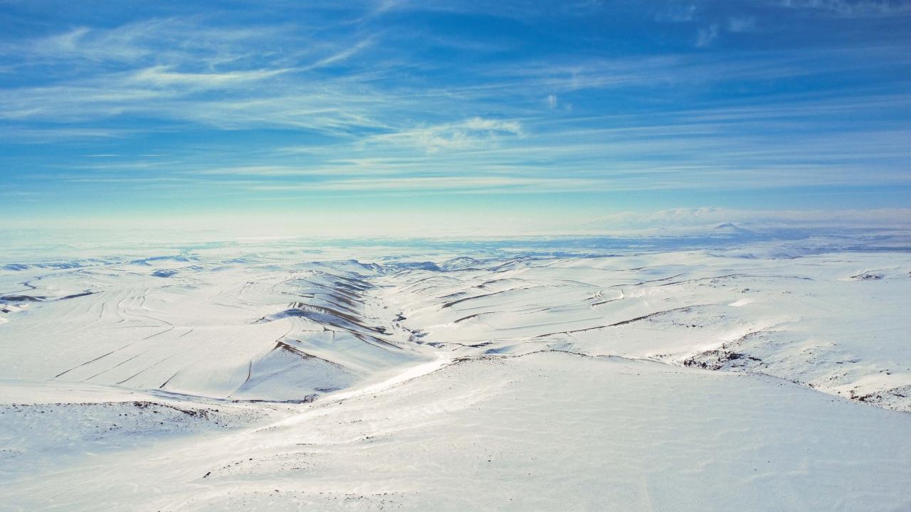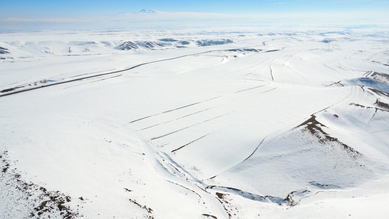 Arpaçay ilçesinde etkili olan kar yağışıyla köyler karla kaplandı. Karla güzel görüntülerin oluştuğu bölgeler ve Türkiye-Ermenistan sınırının sıfır noktasında bulunan Boyuntaş köyü dronla görüntülendi.