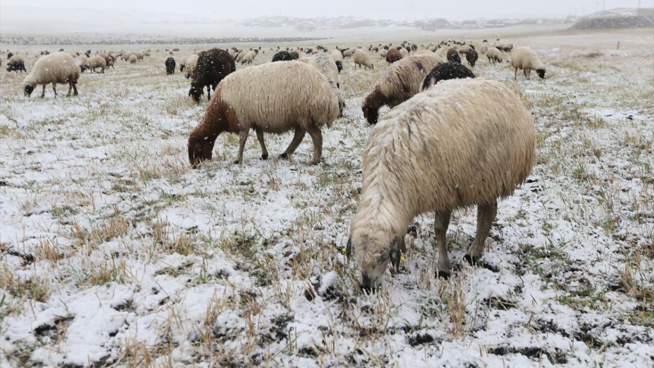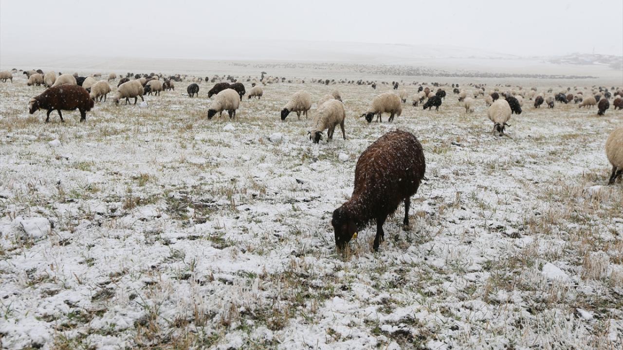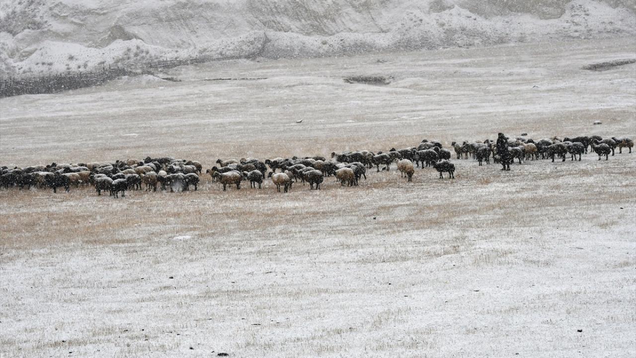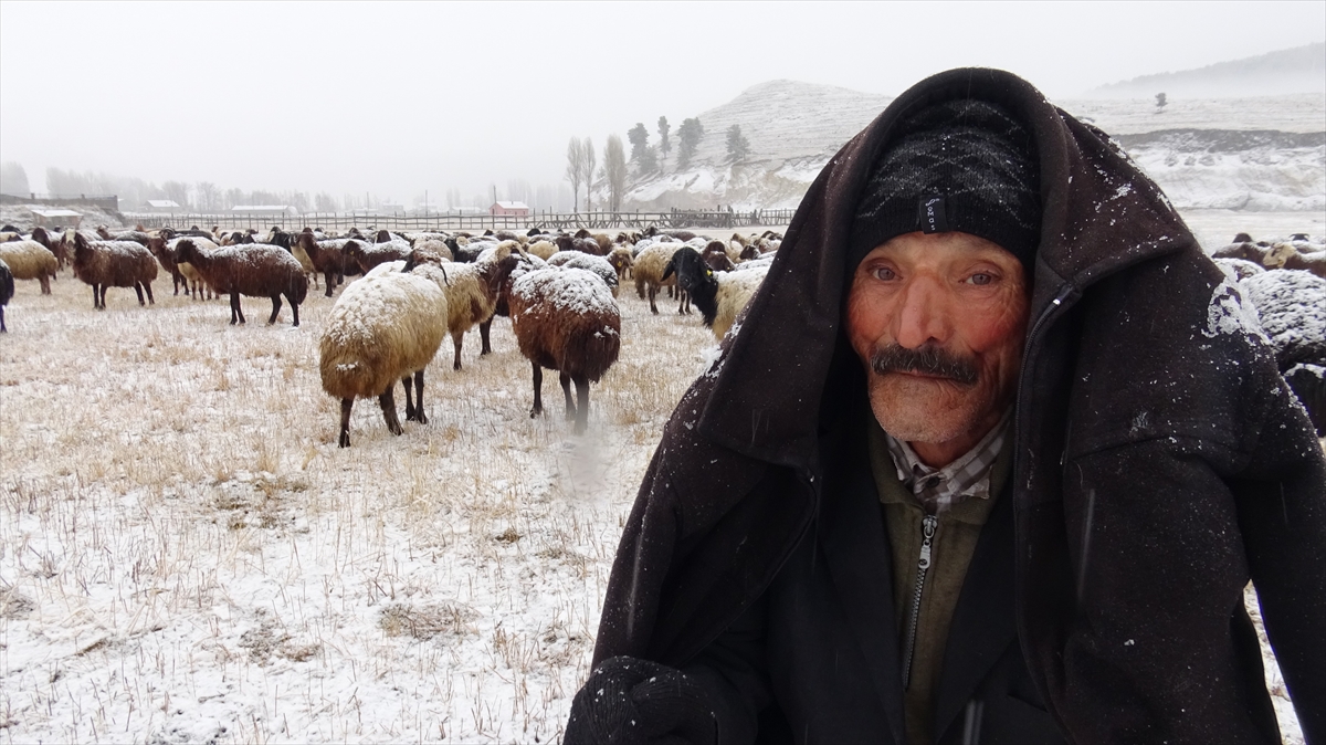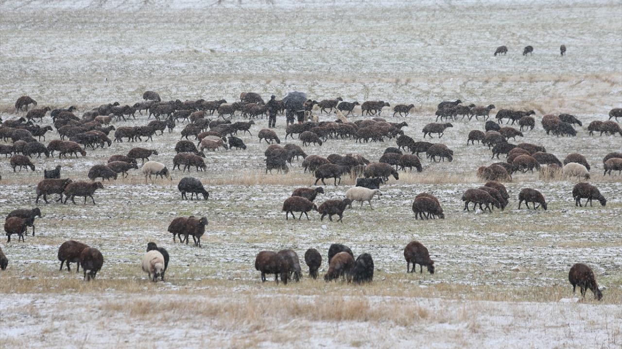 Kars`ta meralarda sürülerini otlatan besiciler, etkili olan kar nedeniyle zor anlar yaşadı.