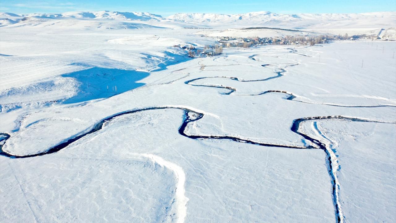 Tarımla hayvancılığa can suyu olan menderesler, karla kaplı haliyle dronla görüntülendi.