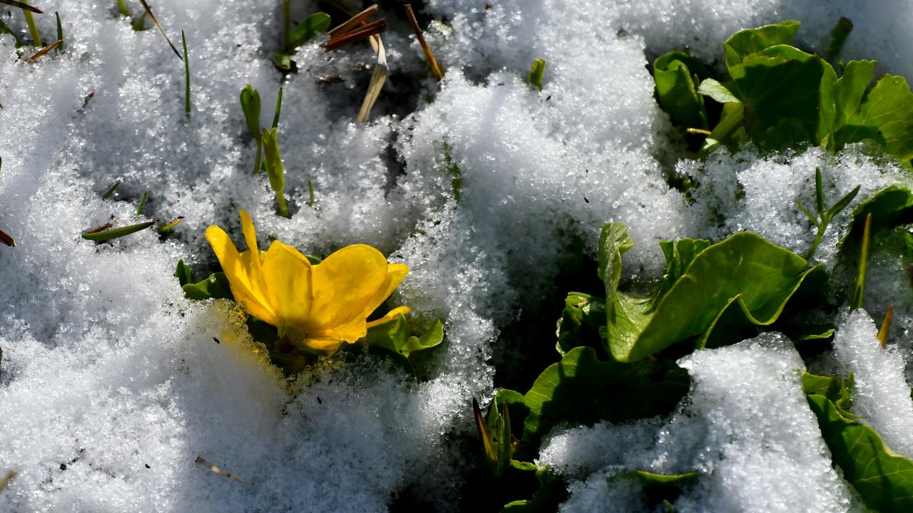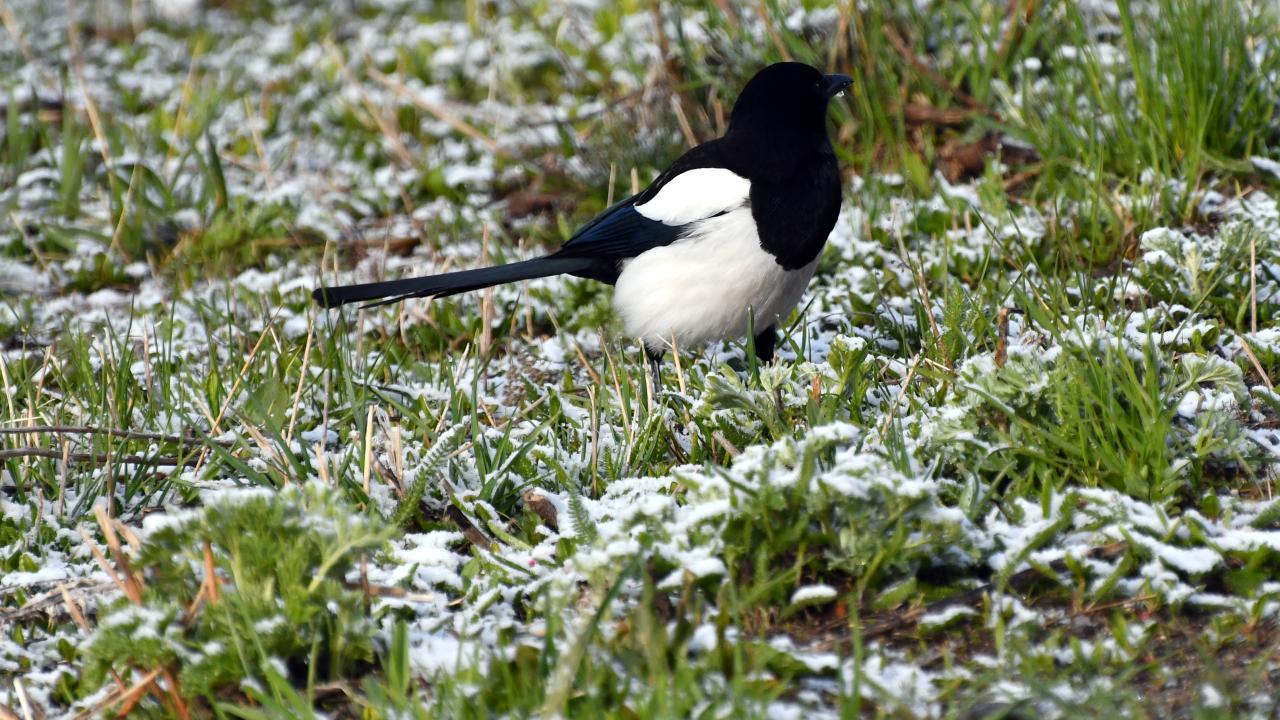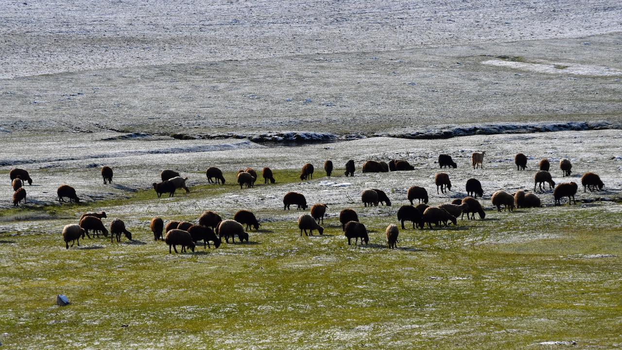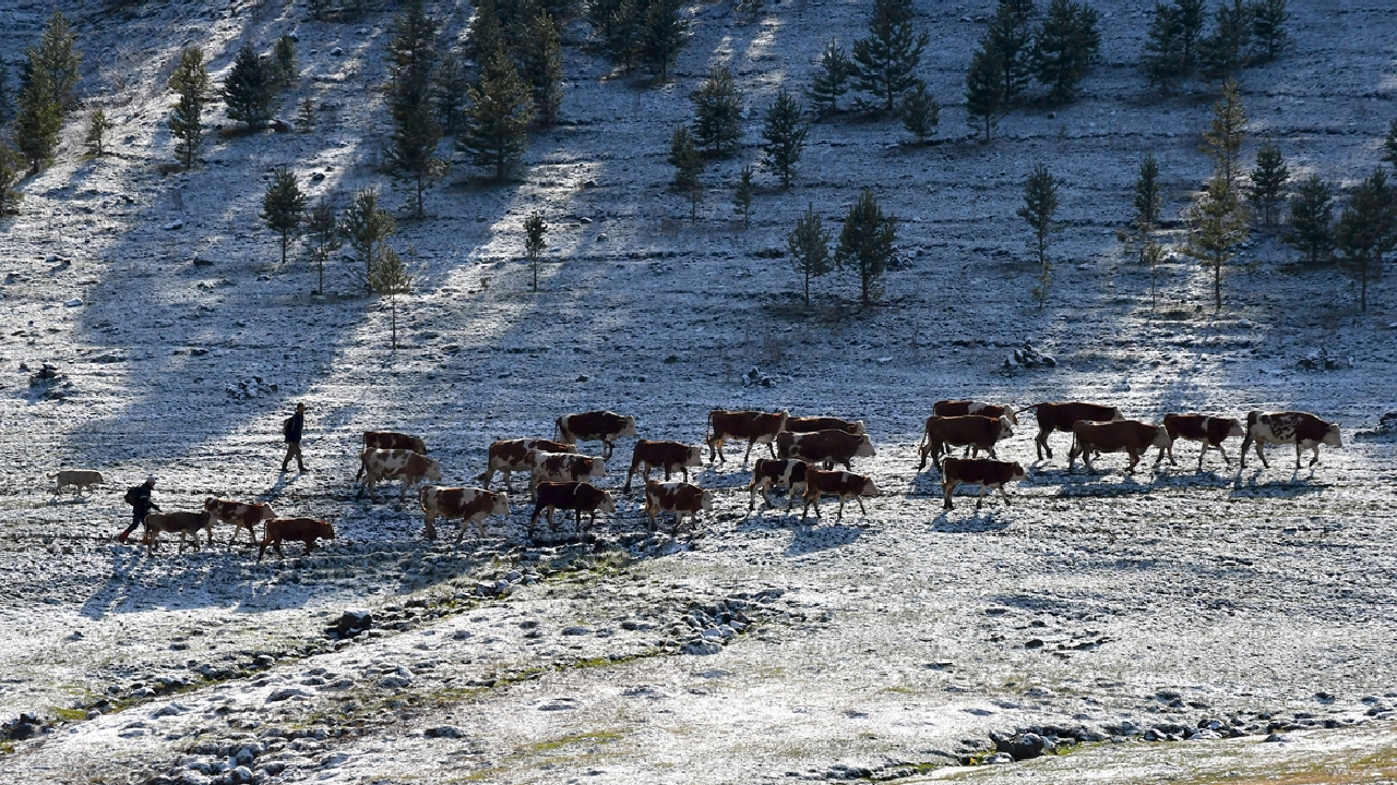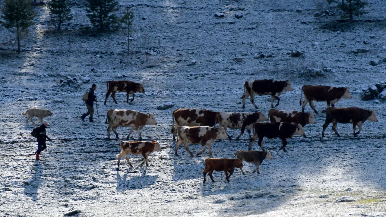 Besiciler, yeşillenen meralarda kar altında hayvanlarını otlatmaya çalıştı. Kuşlar da karlı arazilerde yiyecek ararken görüntülendi.
