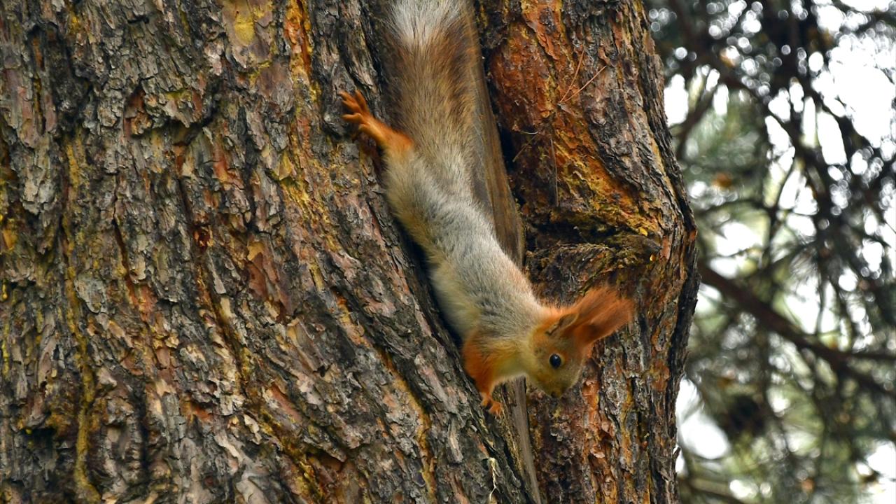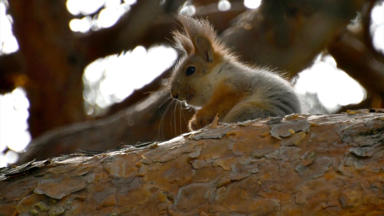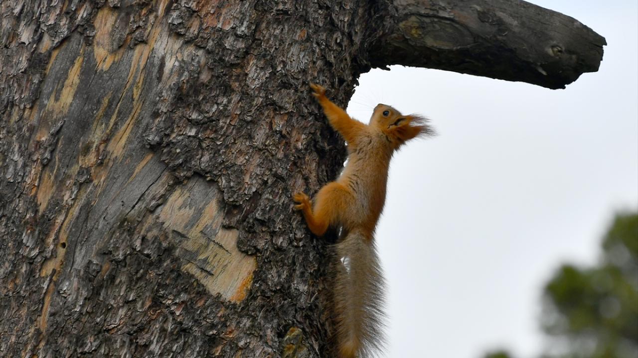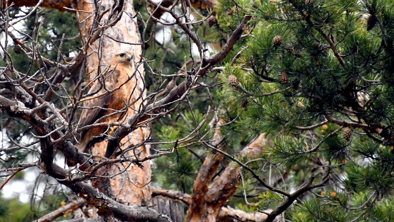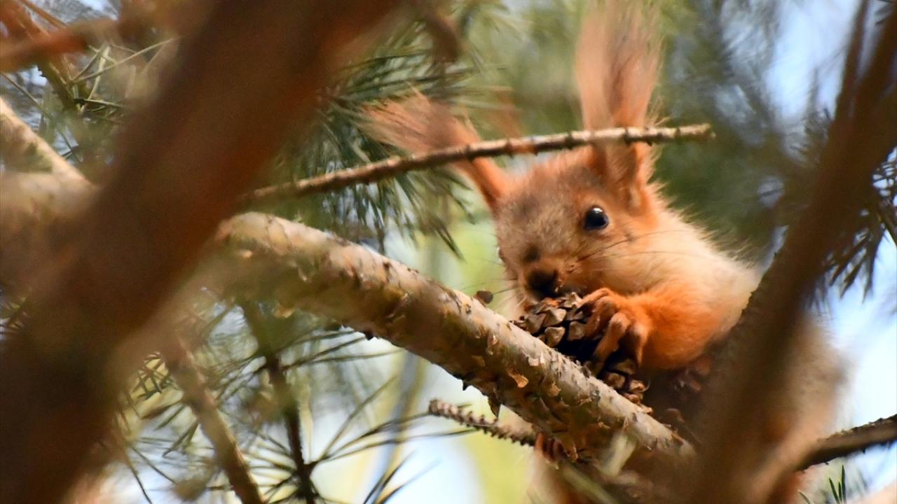Ağaç dallarında gezinen ve kozalak kemiren sincaplar ile avlarını izleyen kızıl şahinler objektife yansıdı.