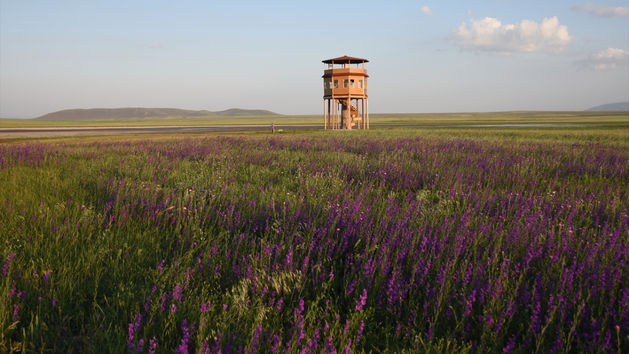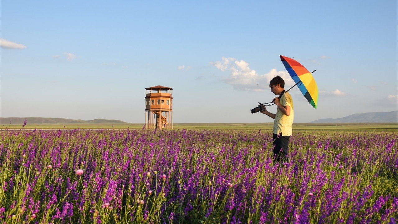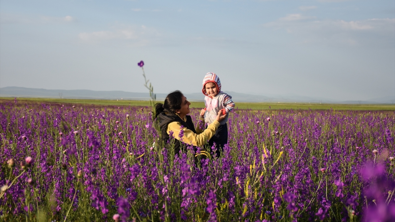 Kars'ın Arpaçay ilçesinde Kuyucuk Gölü yakınlarında açan mor çiçekler görsel şölen sunuyor.