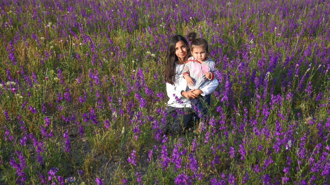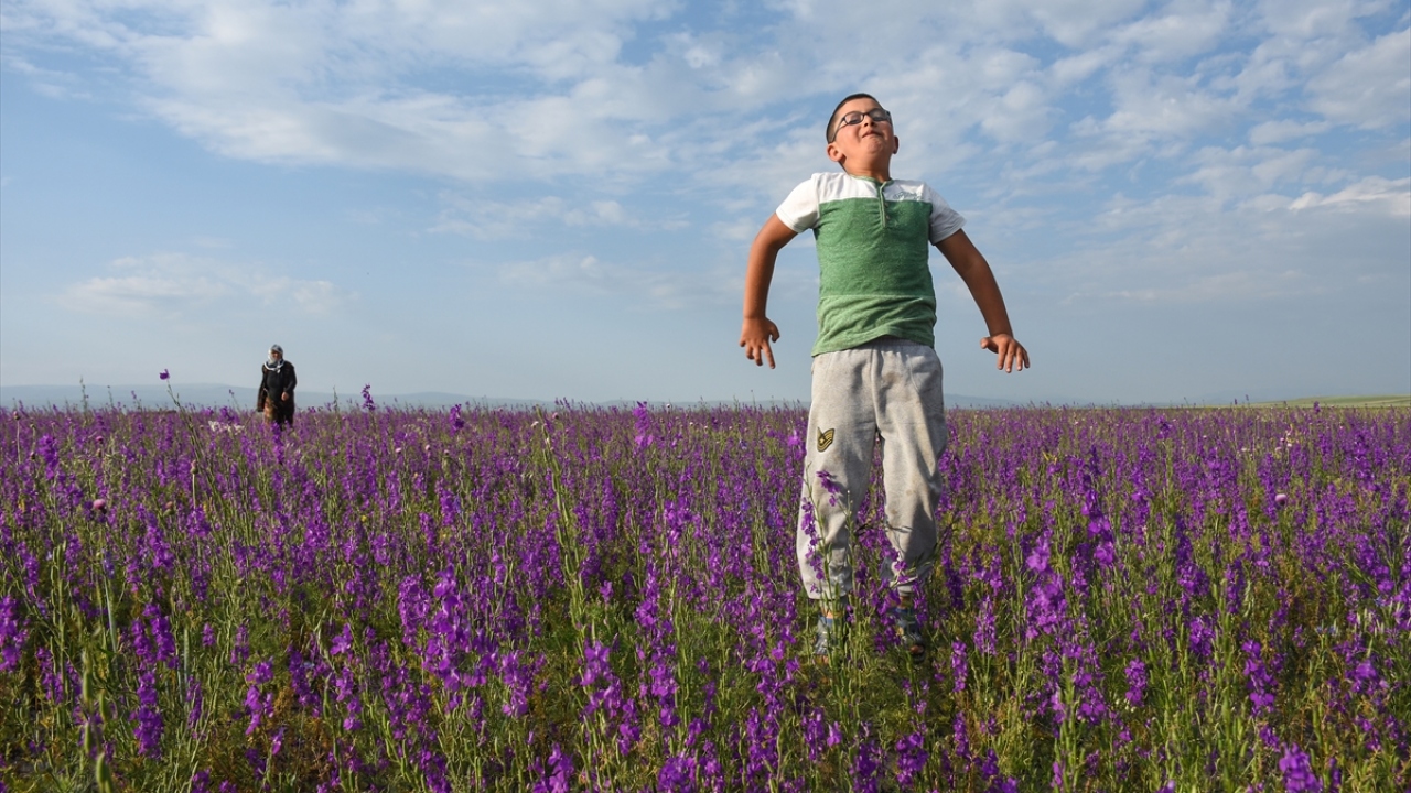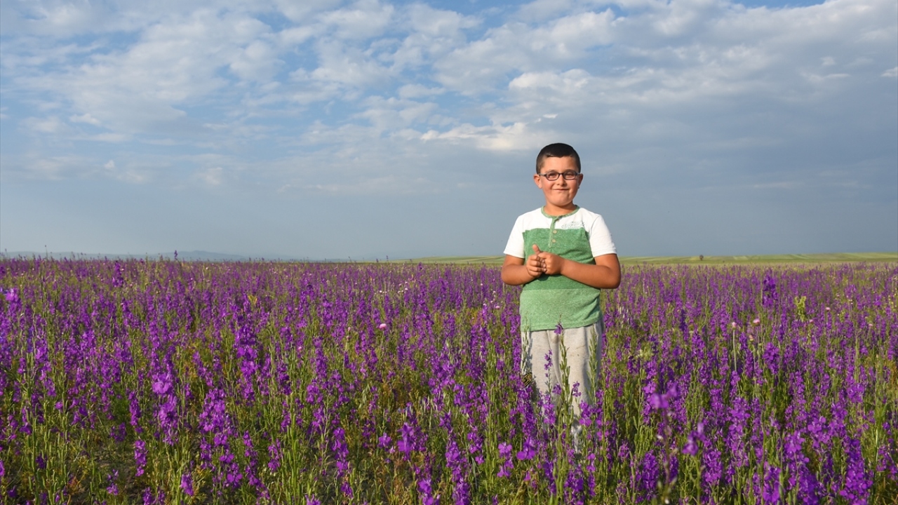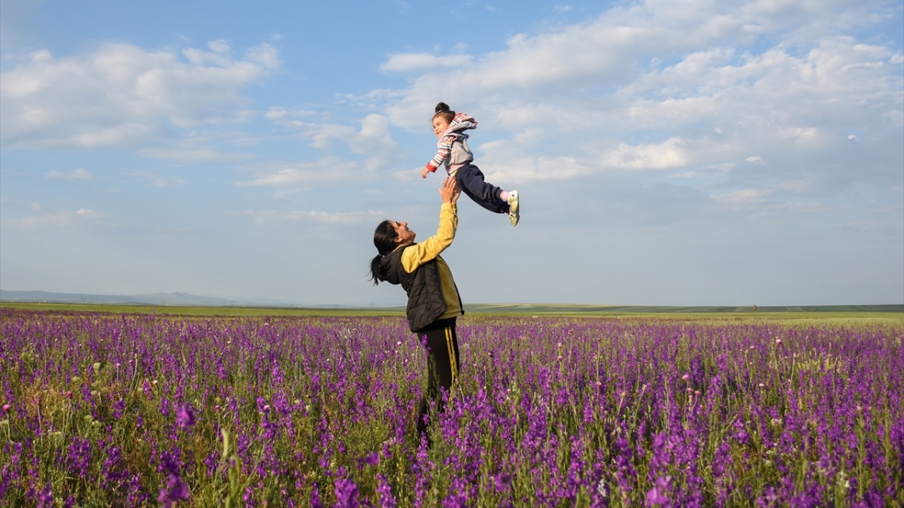 Kars'ın Arpaçay ilçesinde Kuyucuk Gölü yakınlarında açan mor çiçekler görsel şölen sunuyor.