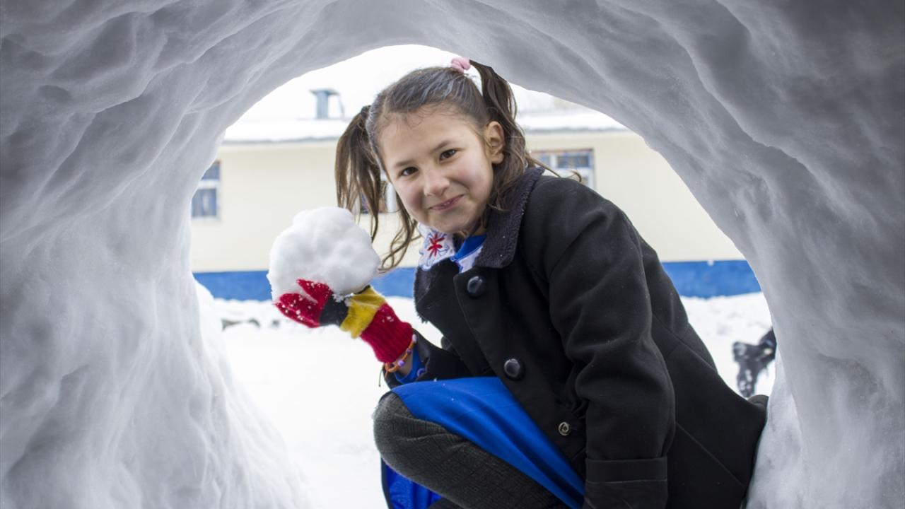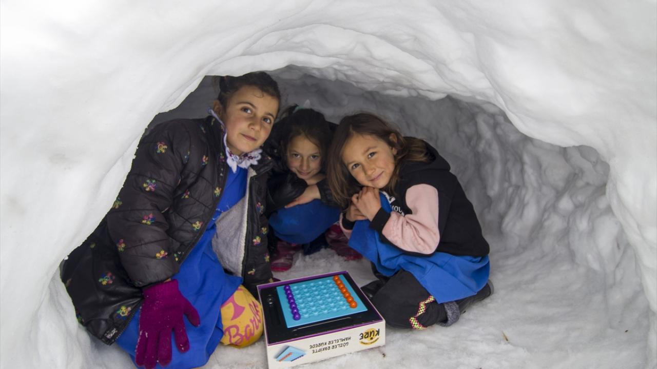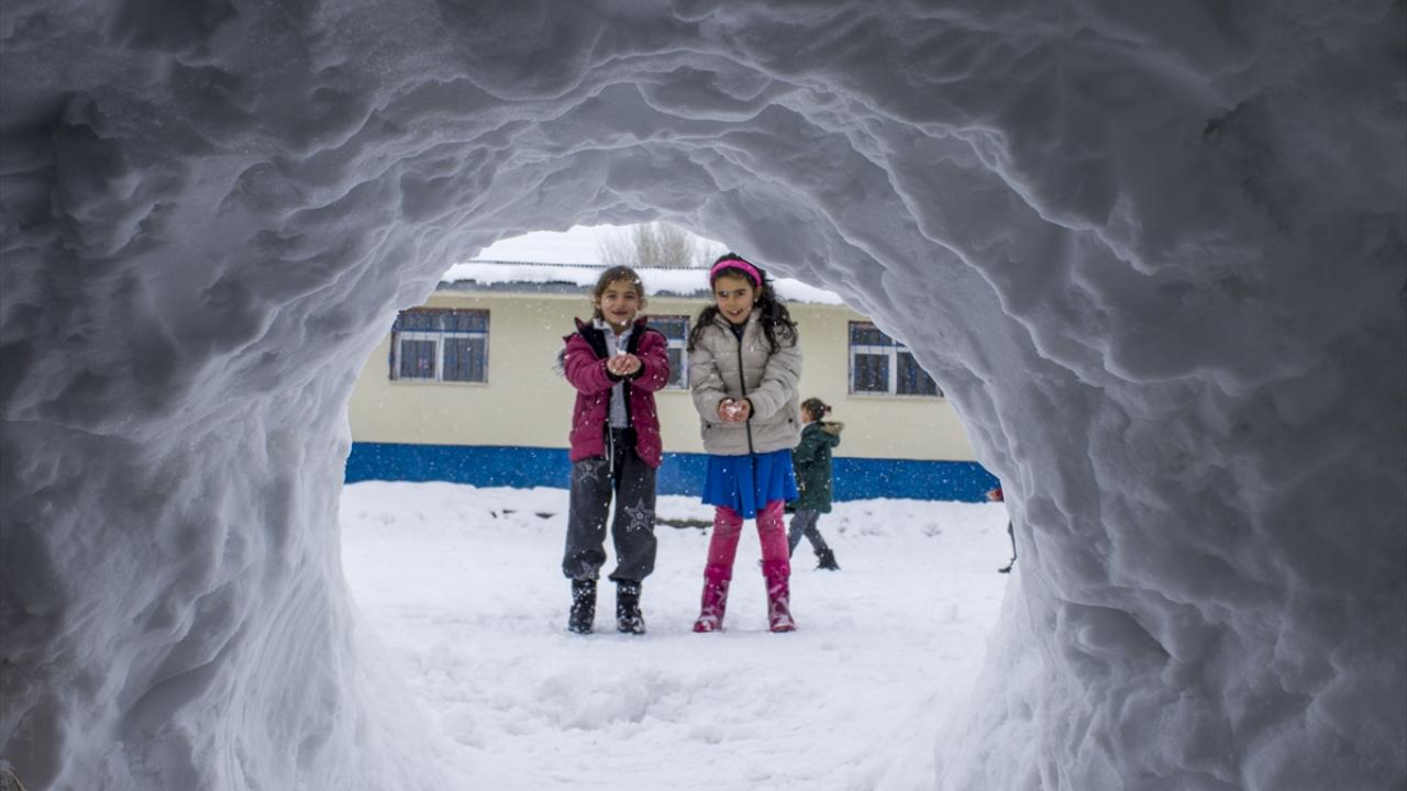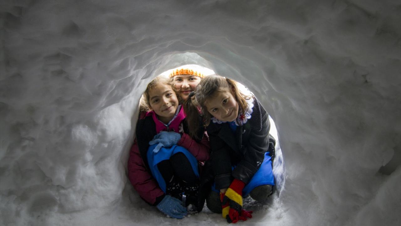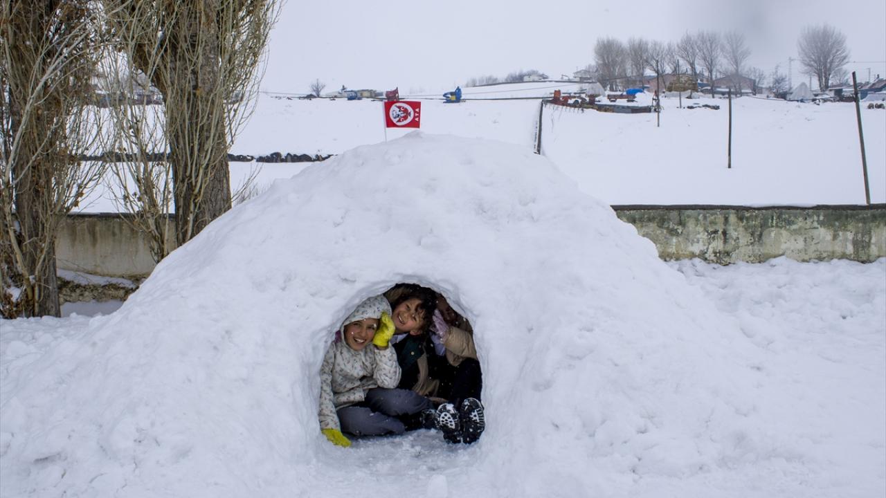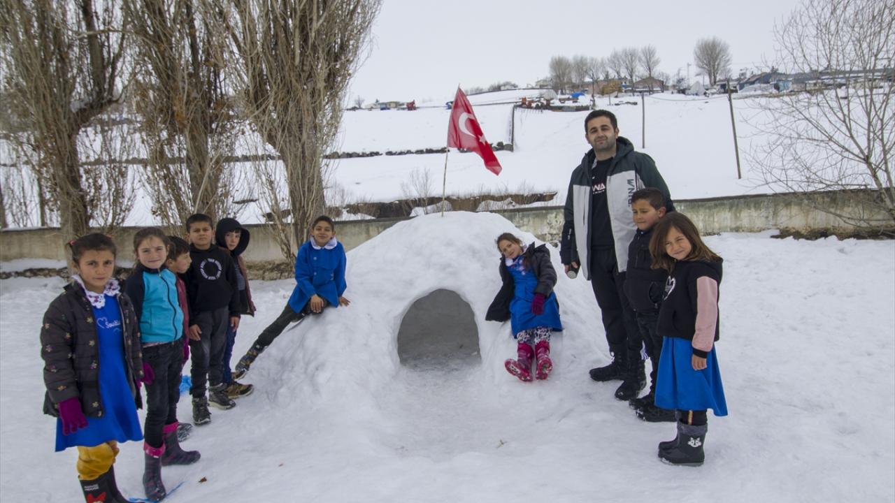 Boyuntaş köyünde kar yağışını eğlenceye dönüştüren öğrenciler, okul bahçesinde iglo ev yaptı, üzerine Türk bayrağı astı.