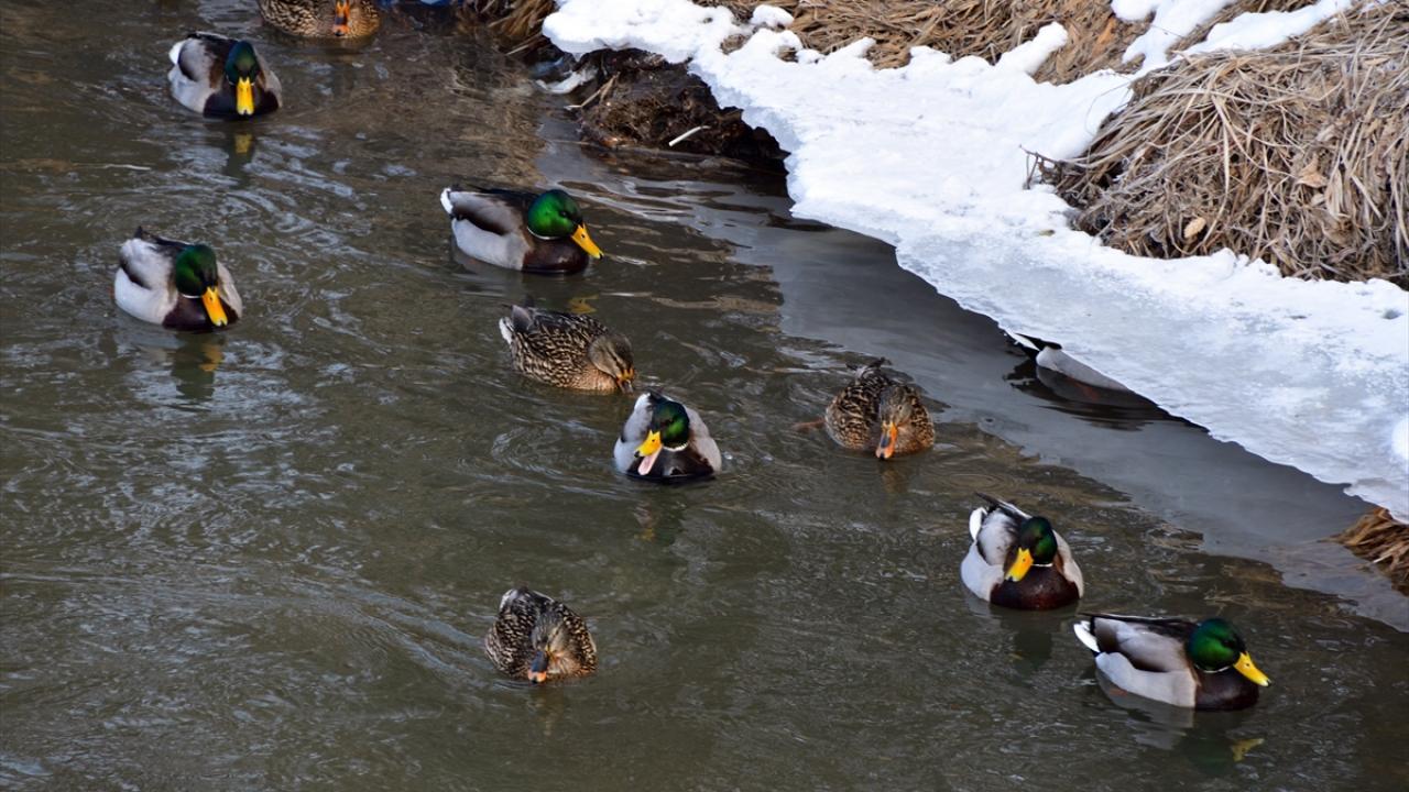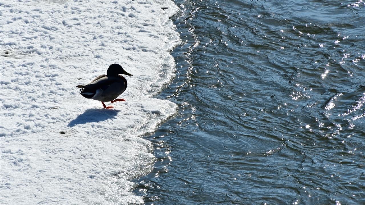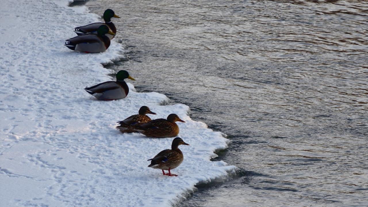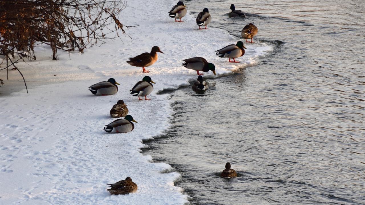 Sarıkamış ilçesindeki derelerde de buzların çözüldüğü bazı kısımlarda ördeklerin yüzdüğü anlar görüntülendi.