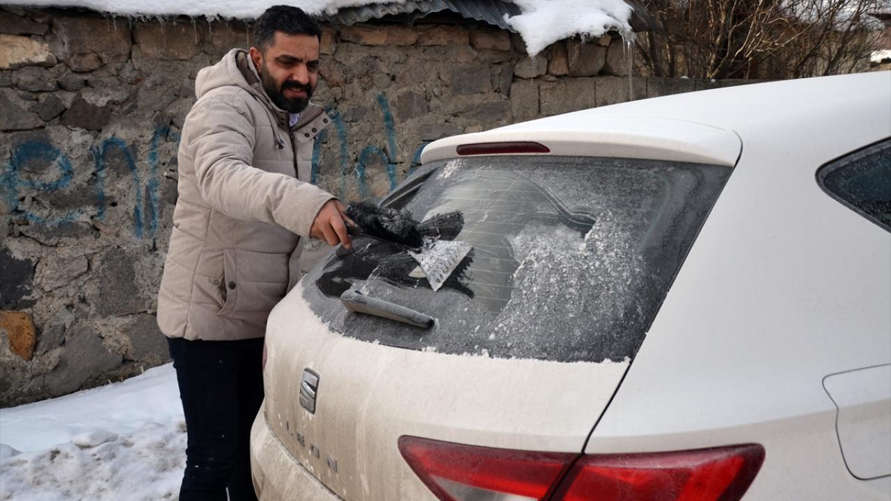 Kentin Sarıkamış ilçesinde vatandaşlar, soğuk hava nedeniyle camları kırağı tutan araçlarını temizlerken, bazı vatandaşlar da ilçede soğuktan etkilenen sokak hayvanlarına yem bıraktı.