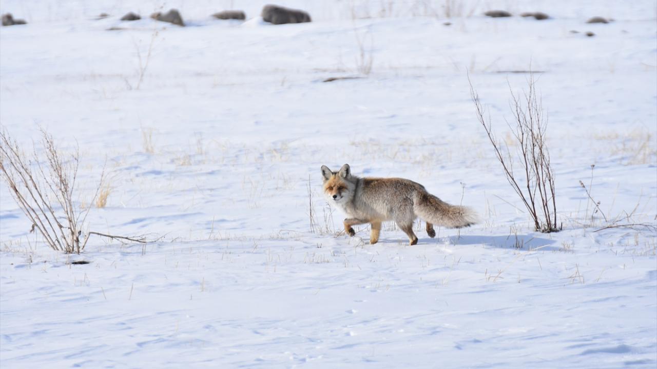 Karla kaplı olan ilçede beyaz örtü üstünde yiyecek arayan tilkiler olduğu da gözlendi.