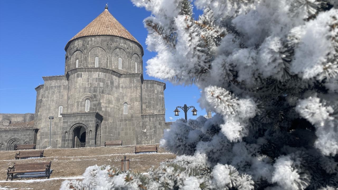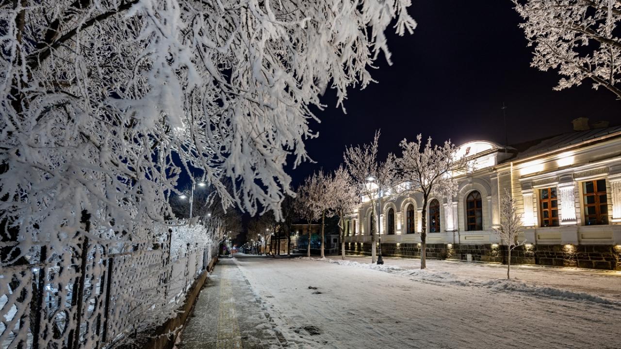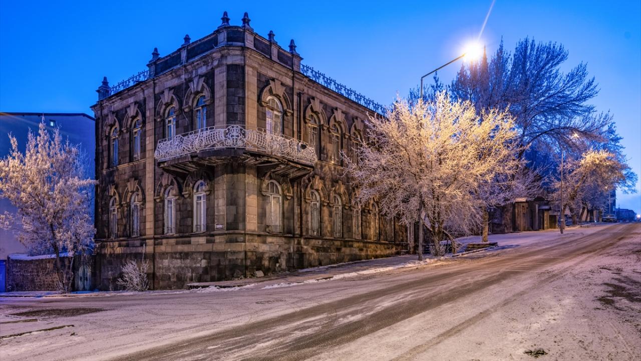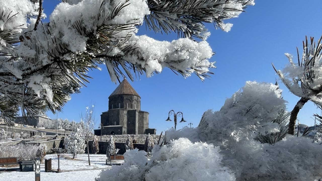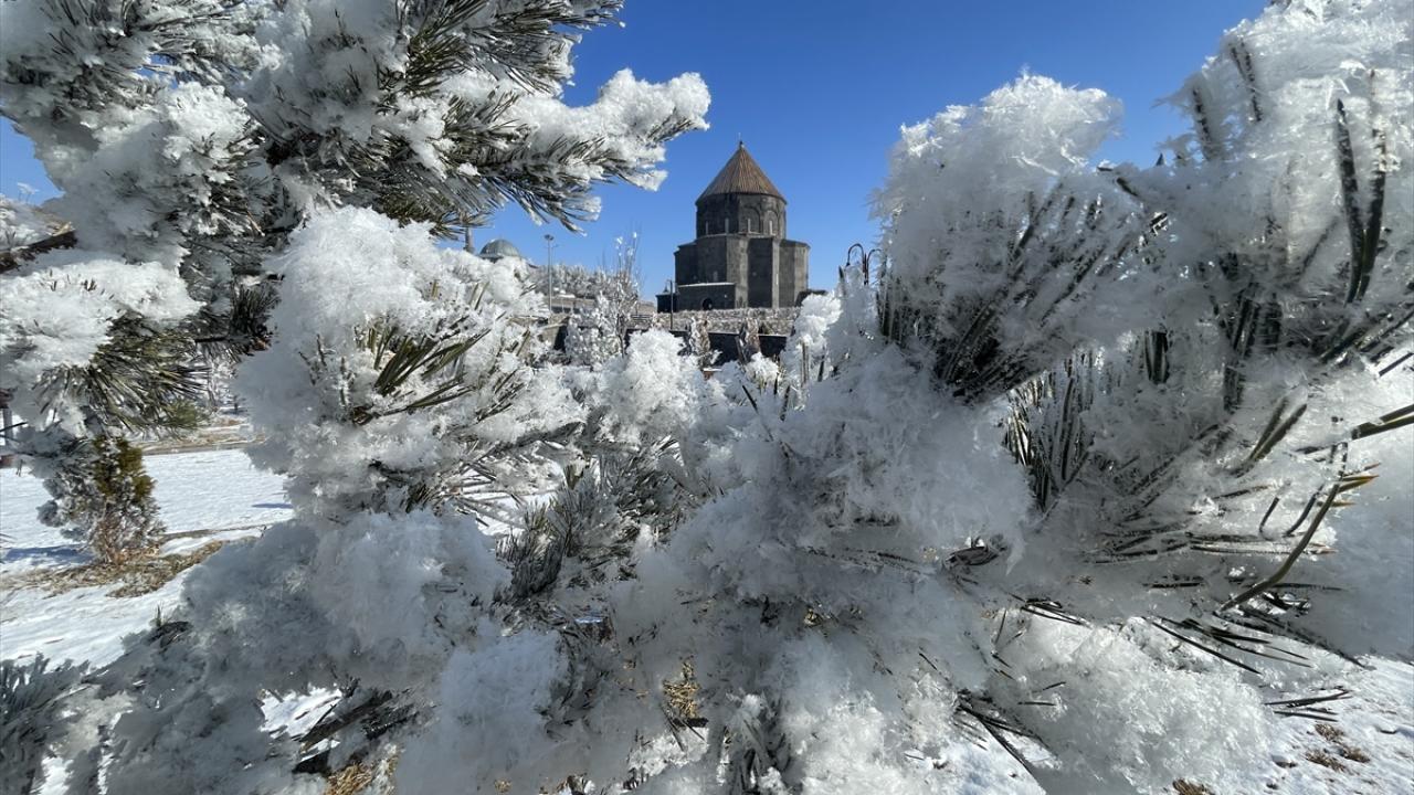 Soğuk havanın etkisiyle bitki ve ağaçlarda kırağı oluştu, Kars Kalesi eteğindeki tarihi yapılar kırağı tutan ağaçlarla güzel bir görüntü oluşturdu.