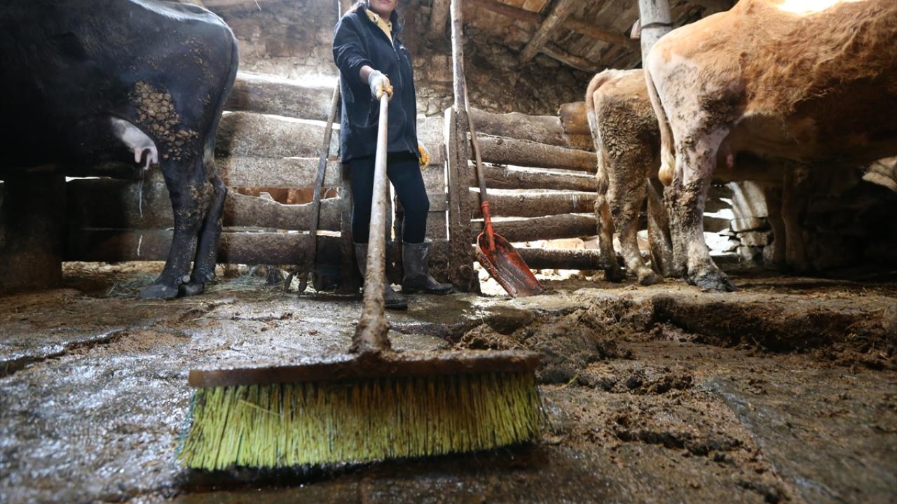 Hayvan sayısını 3 yılda 11`e çıkararak süt üretimine başlayan Erben, yaşadığı evin yanındaki ahırda hayvanların bakım ve beslemesini yapıyor.