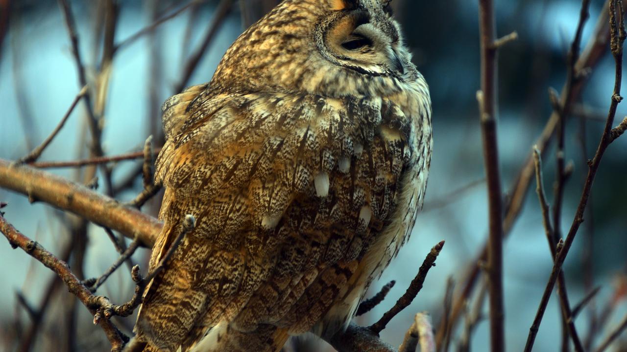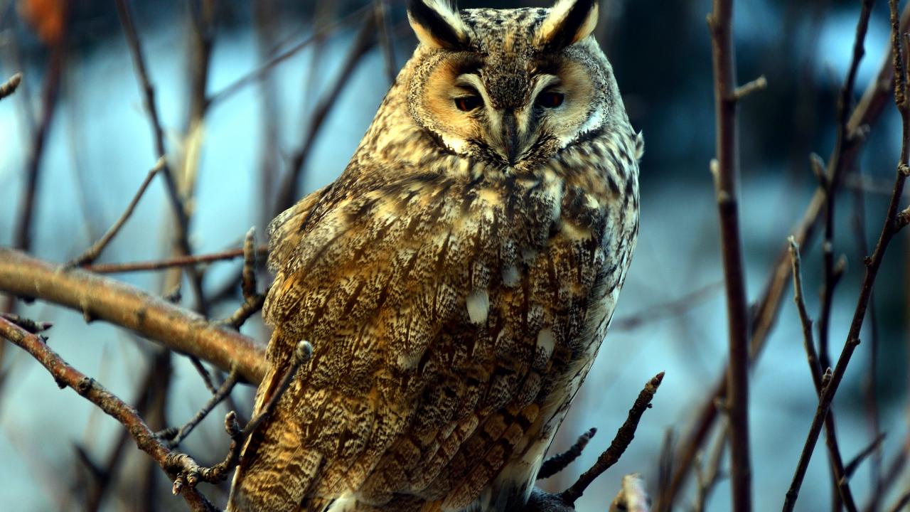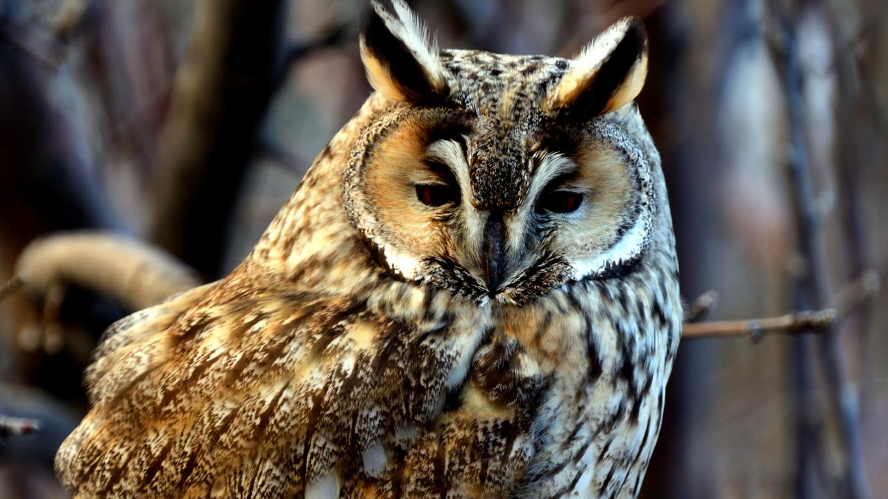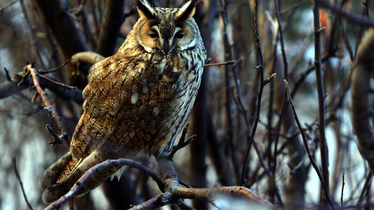 Sarıkamış`ta kulaklı orman baykuşu, sarıçam ormanlarında yiyecek ararken objektiflere yansıdı.