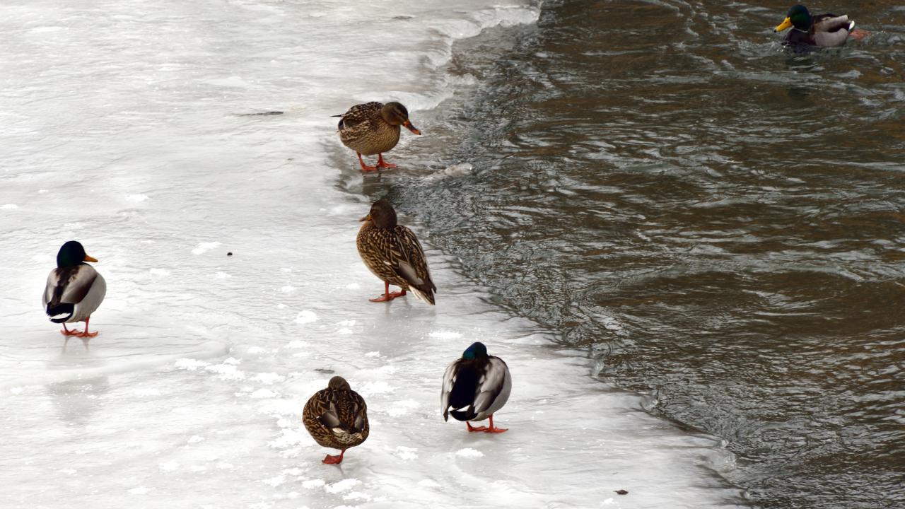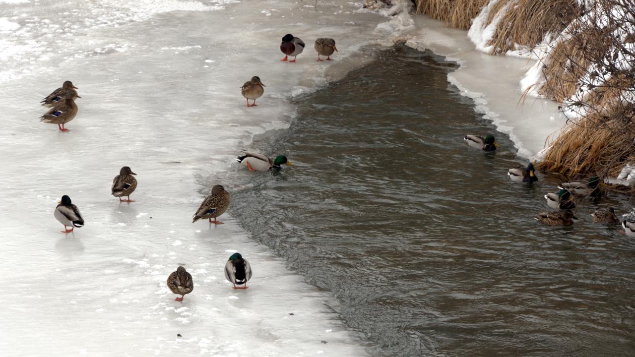 Yaban ördekleri de buz kaplı Kars Çayı`nda yiyecek ararken görüntülendi.