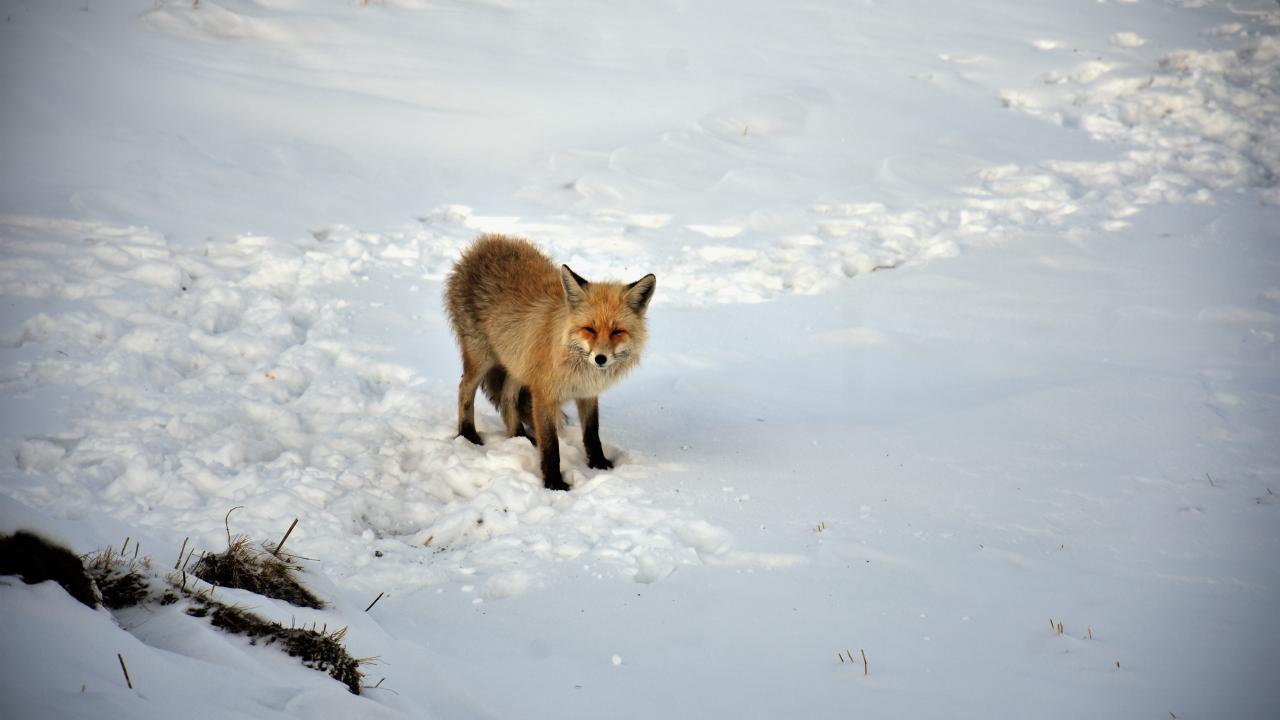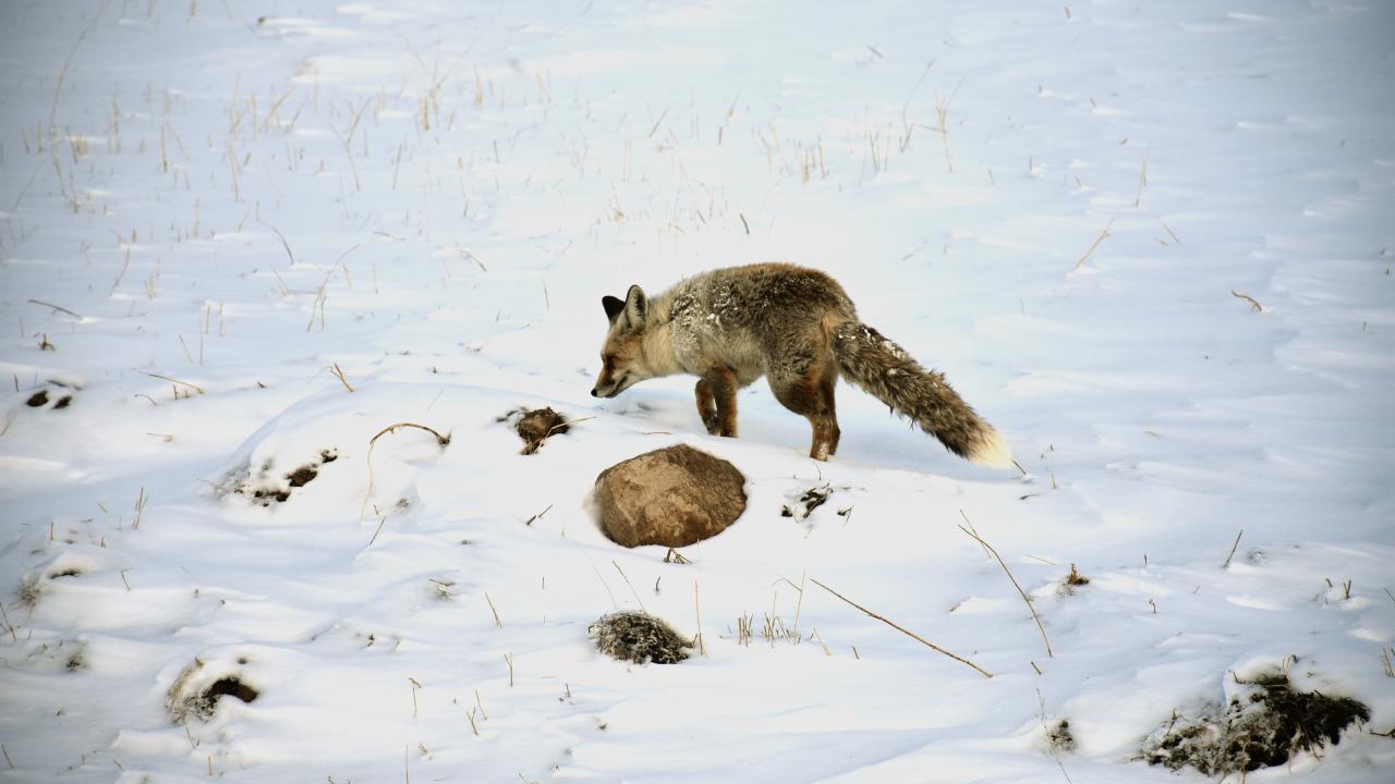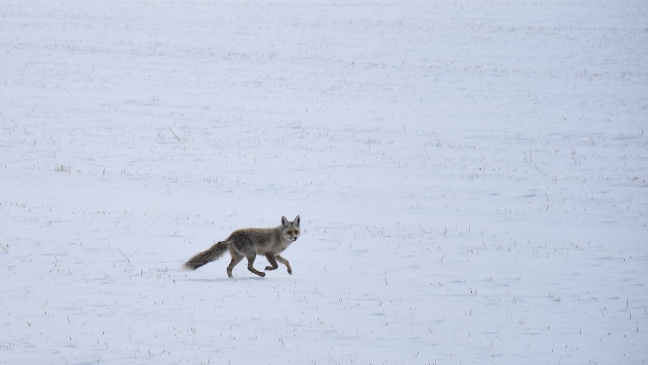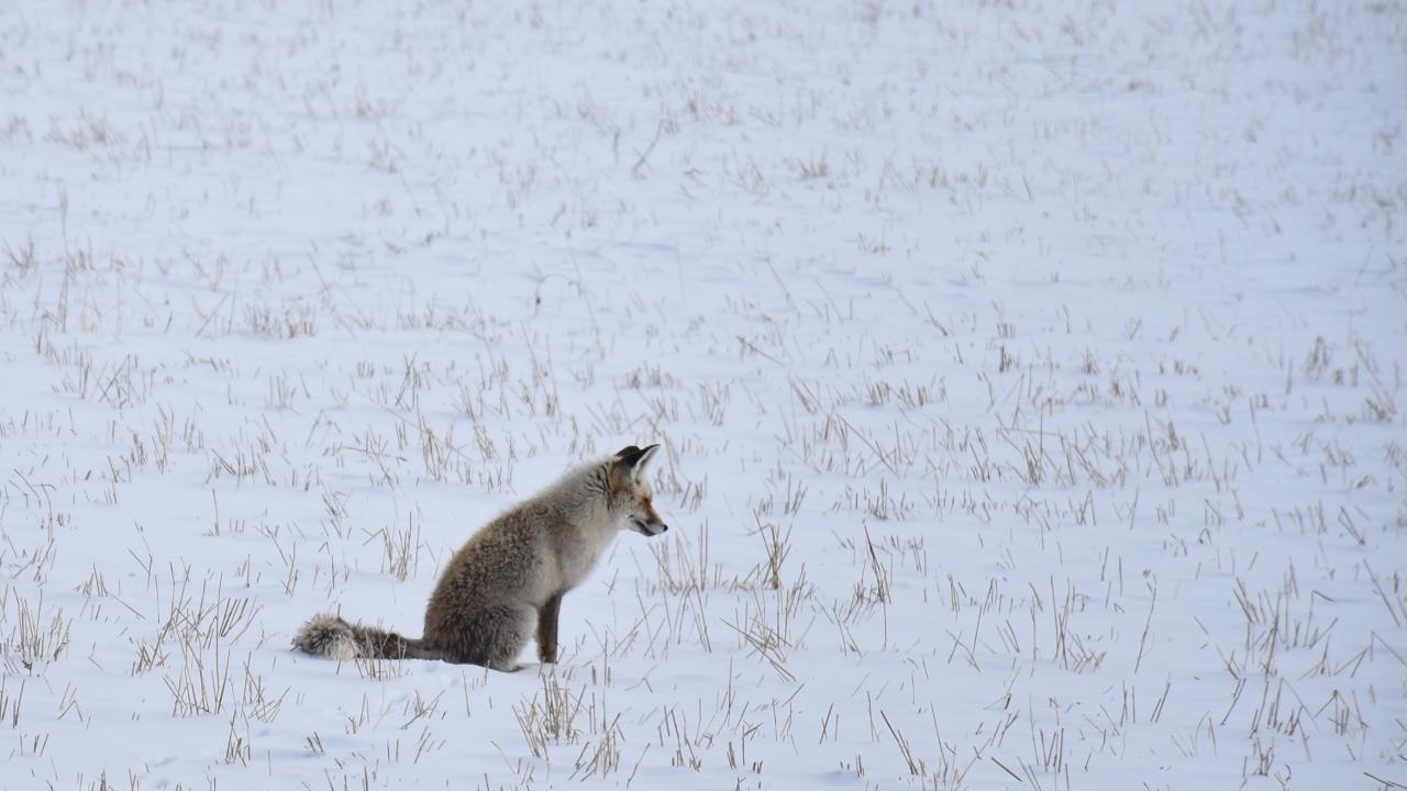 Selim ilçesine bağlı Kekeç köyü yakınlarında ise tilkiler karla kaplı arazide yiyecek aradı.