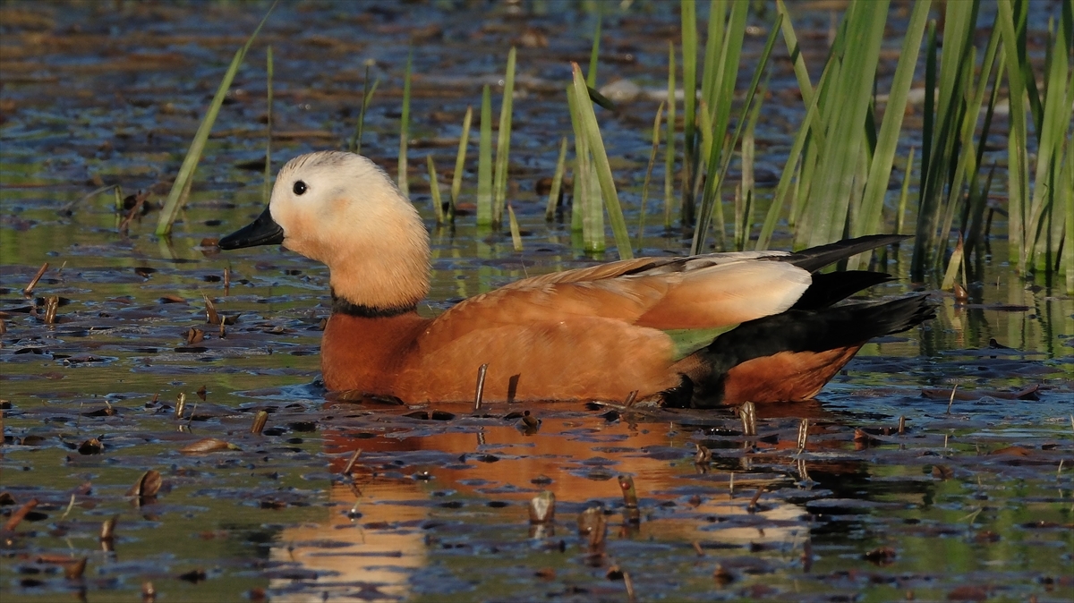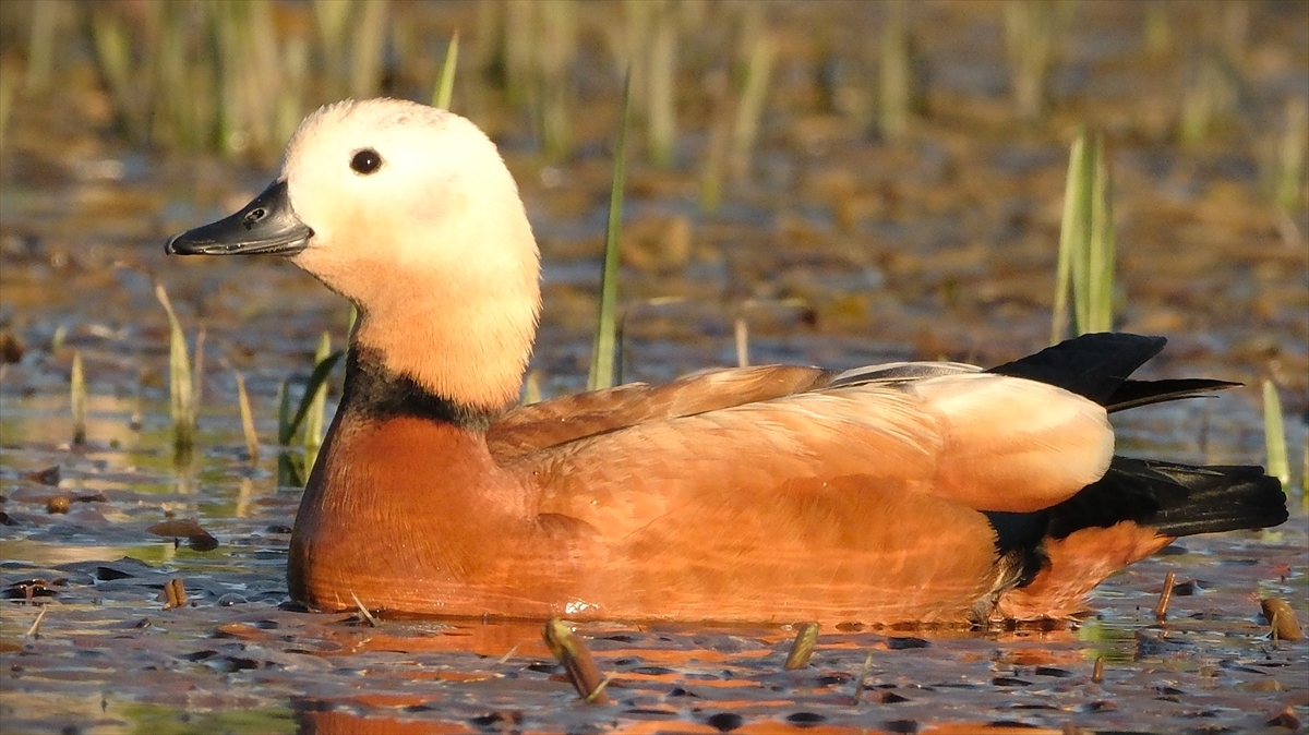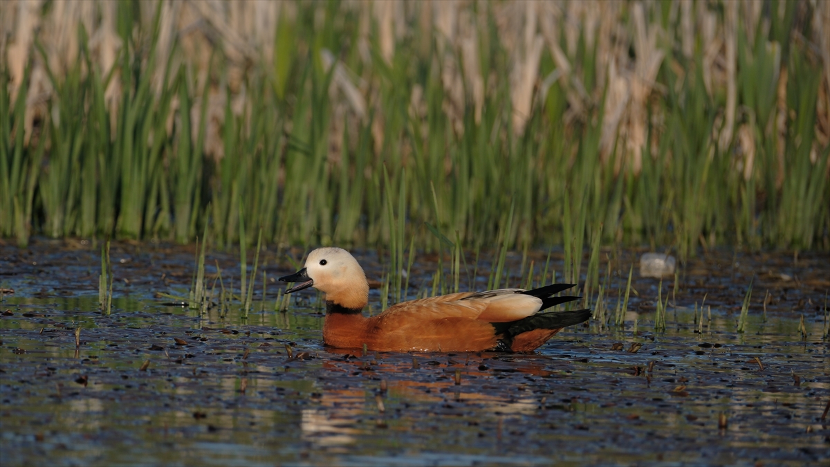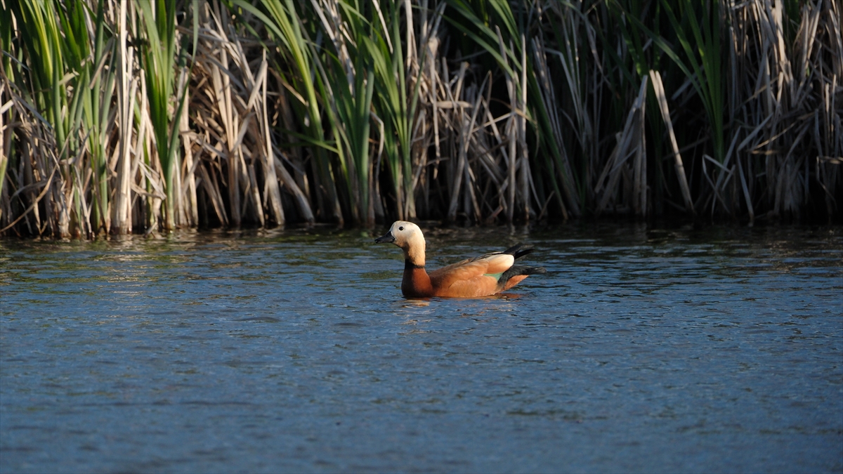Kars Çayı civarında bulunan sulak alanda yaşam süren angutlar, bölgeye güzellik katıyor.
