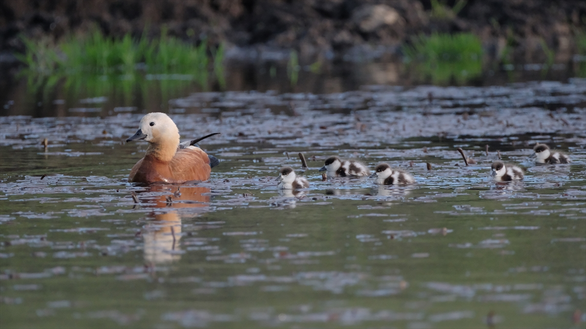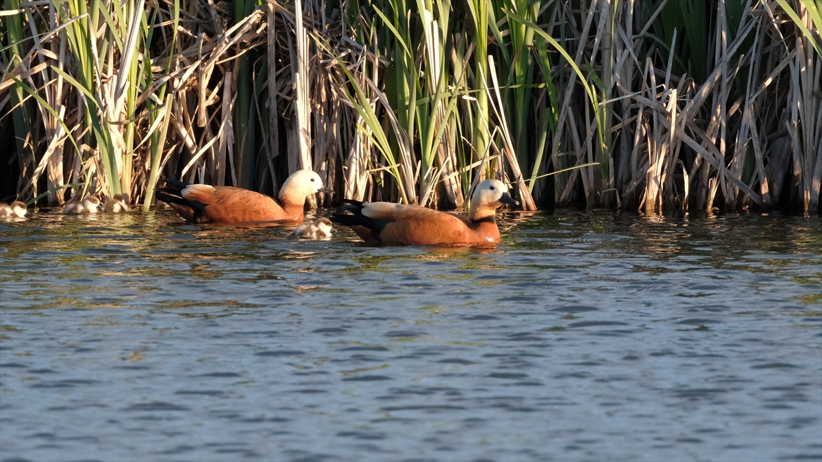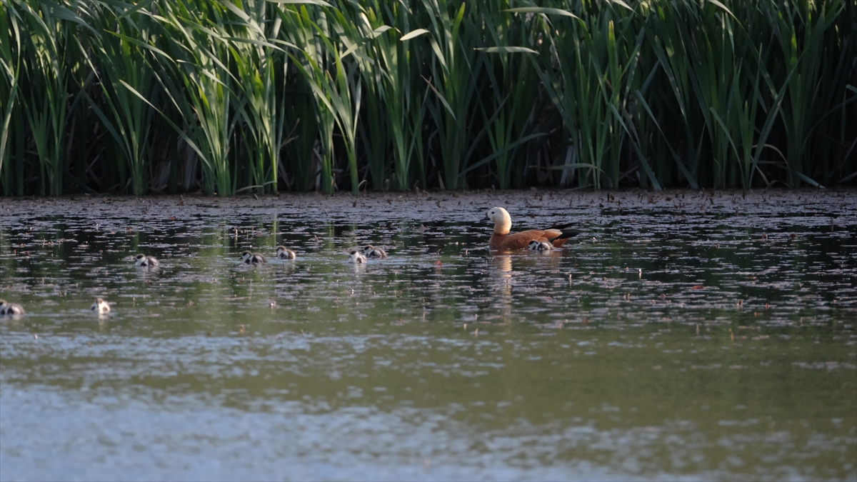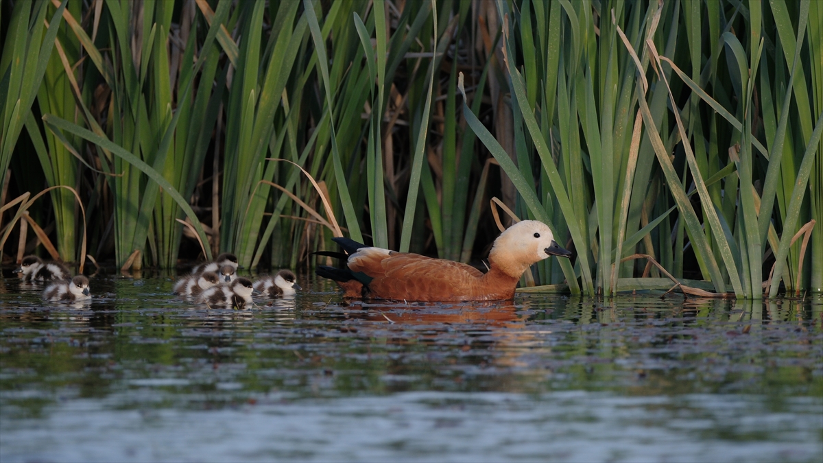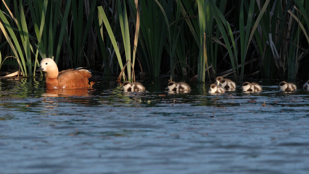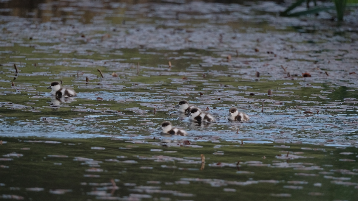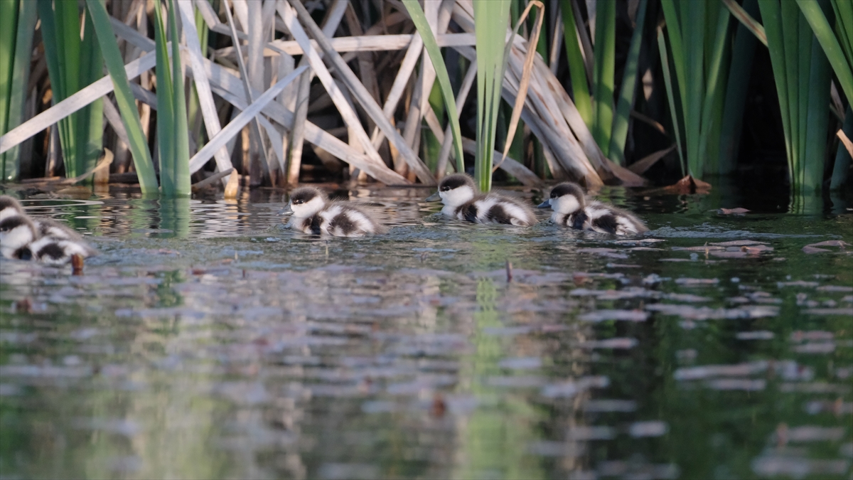 Sazlık alanda yumurtadan çıkan angut yavruları, anneleriyle suda yiyecek arayışına başladı.