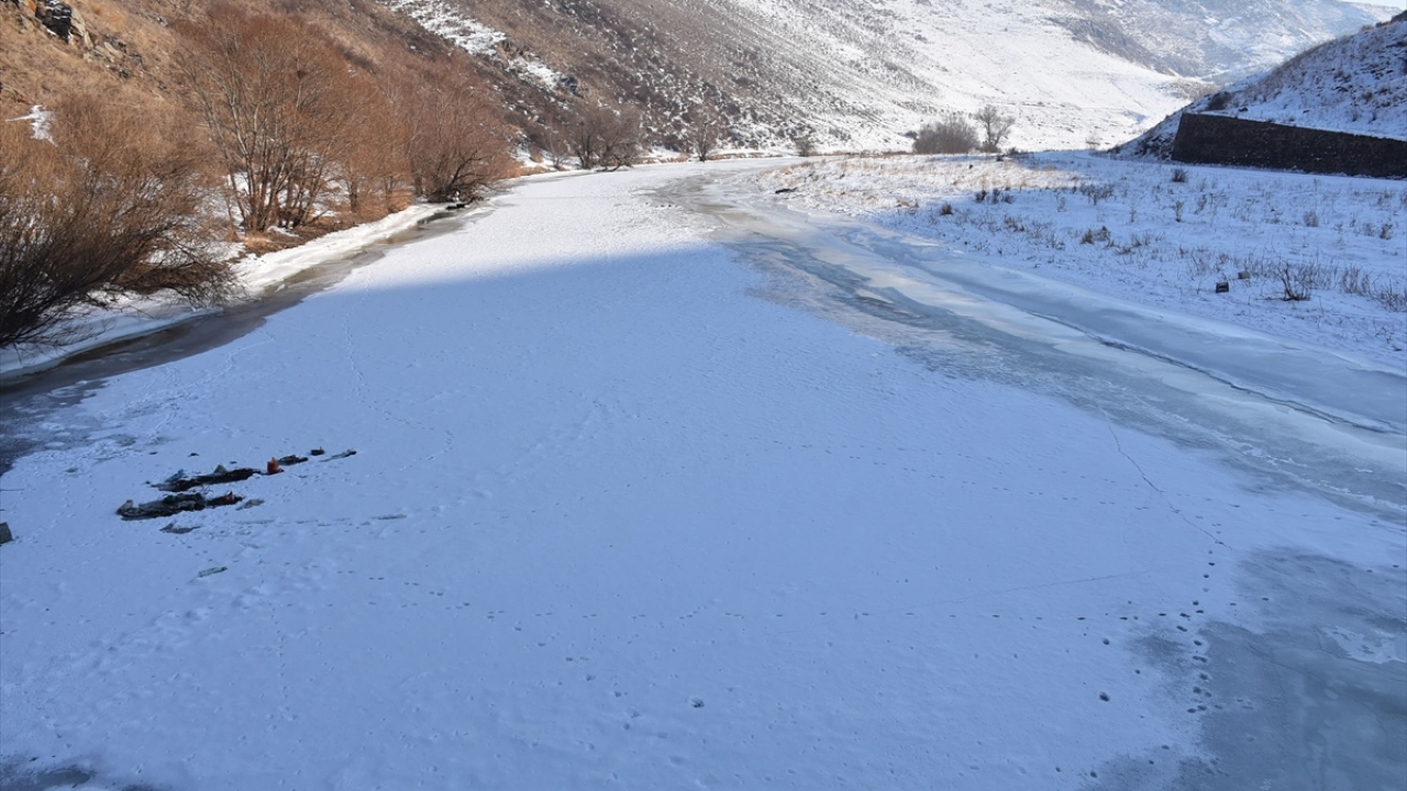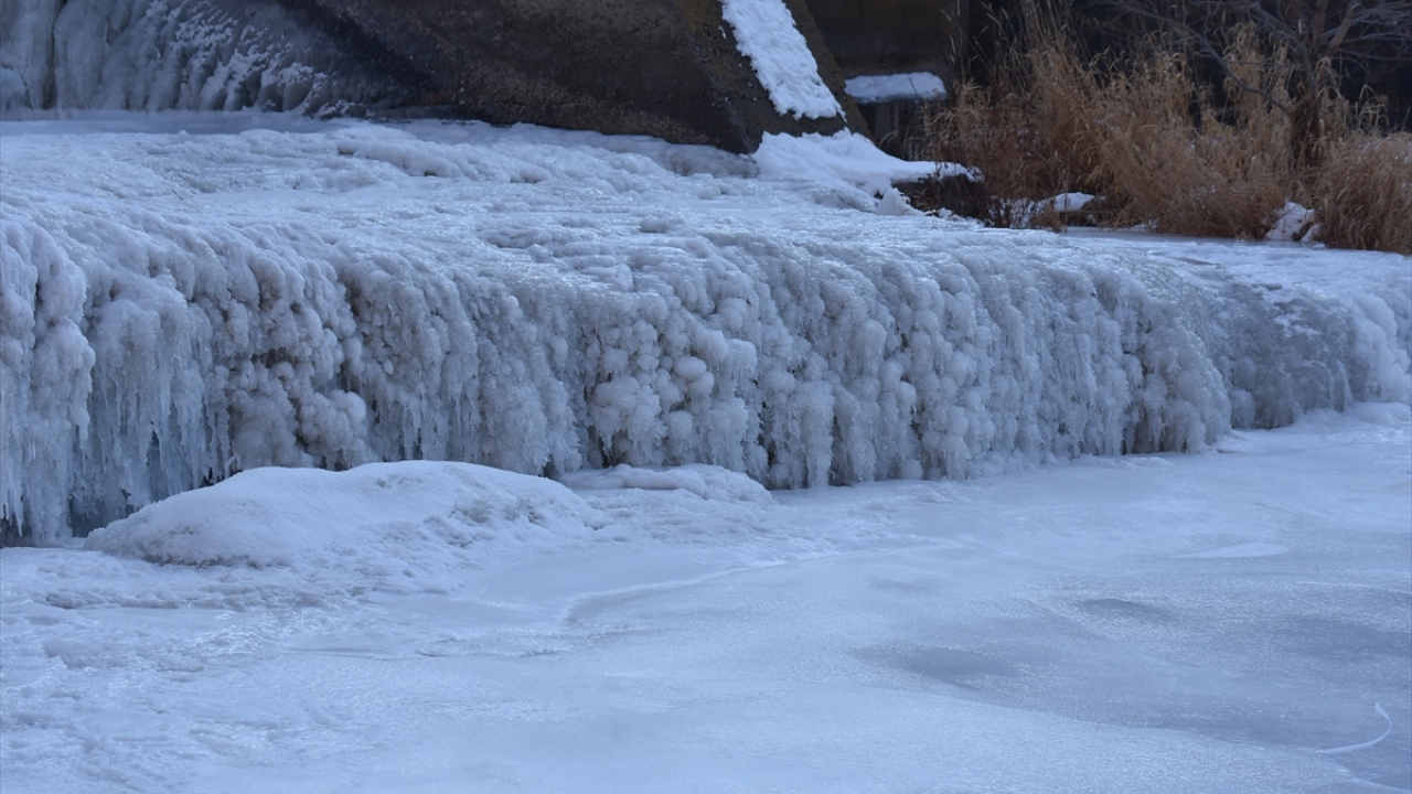 Soğuk hava nedeniyle Kars Kalesi arkasındaki Dereiçi mevkisinde bulunan ve kullanılmayan HES baraj gölünün yüzeyi ile baraja su sağlayan Kars Çayı buz tuttu.