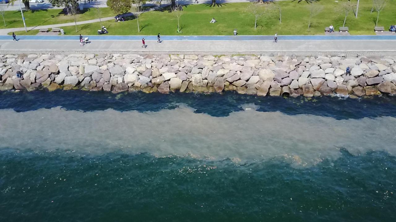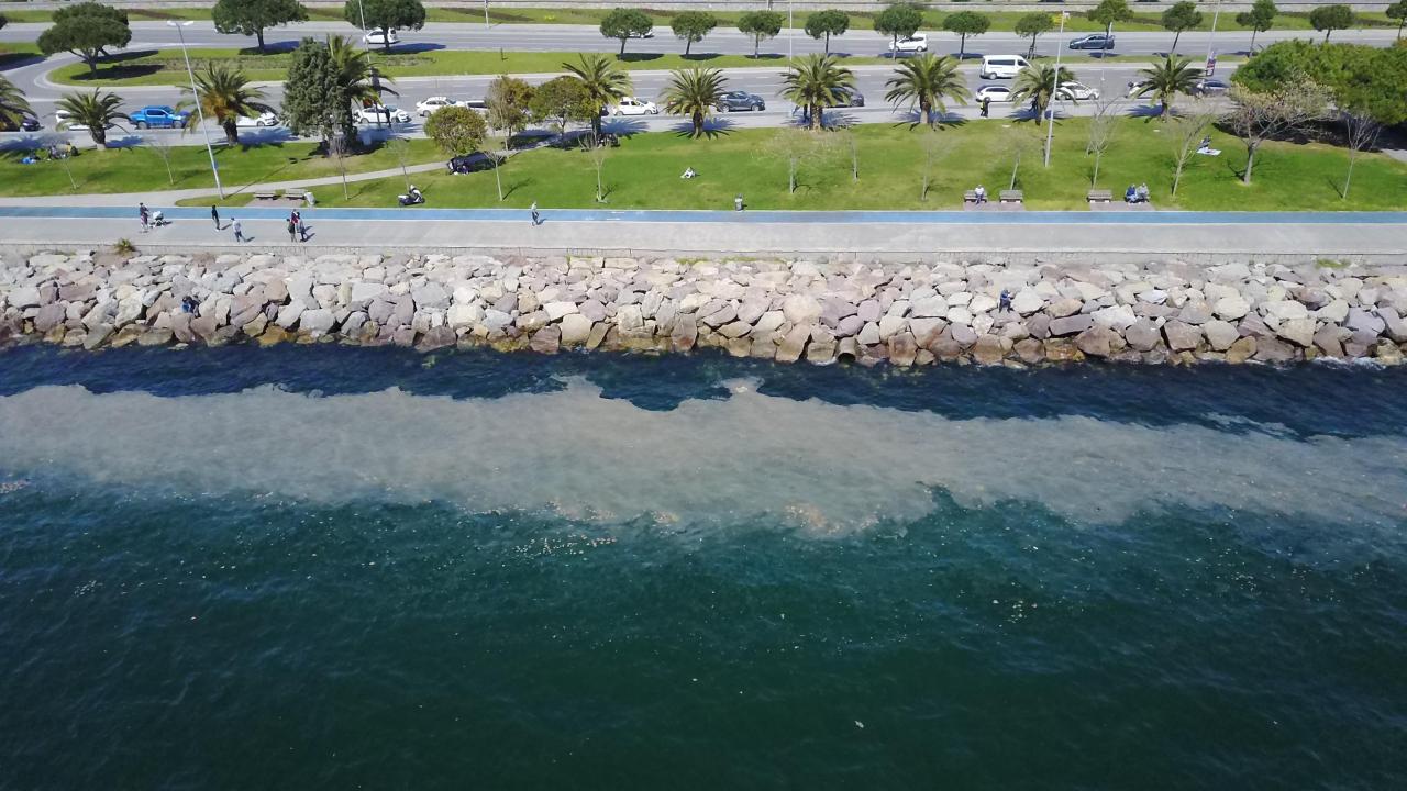 Sahili saran ve dibe çöktüğünde deniz canlıları için büyük tehlike oluşturan deniz salyası dron ile havadan görüntülendi.