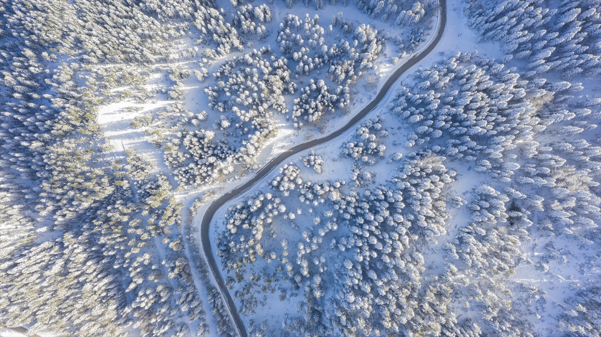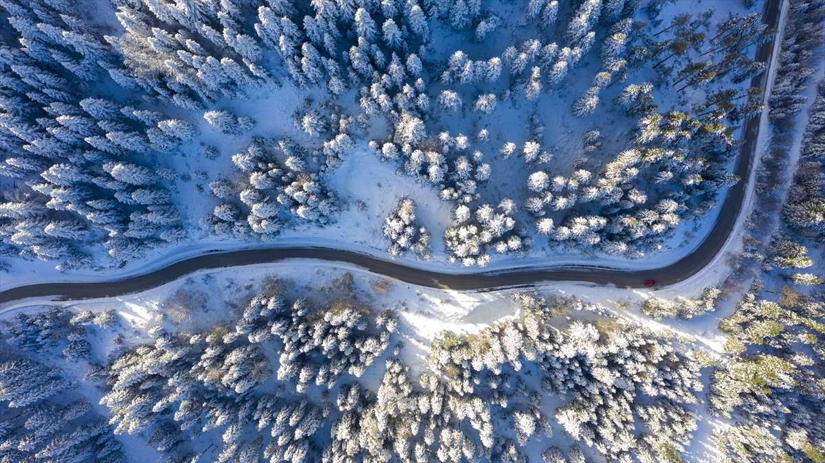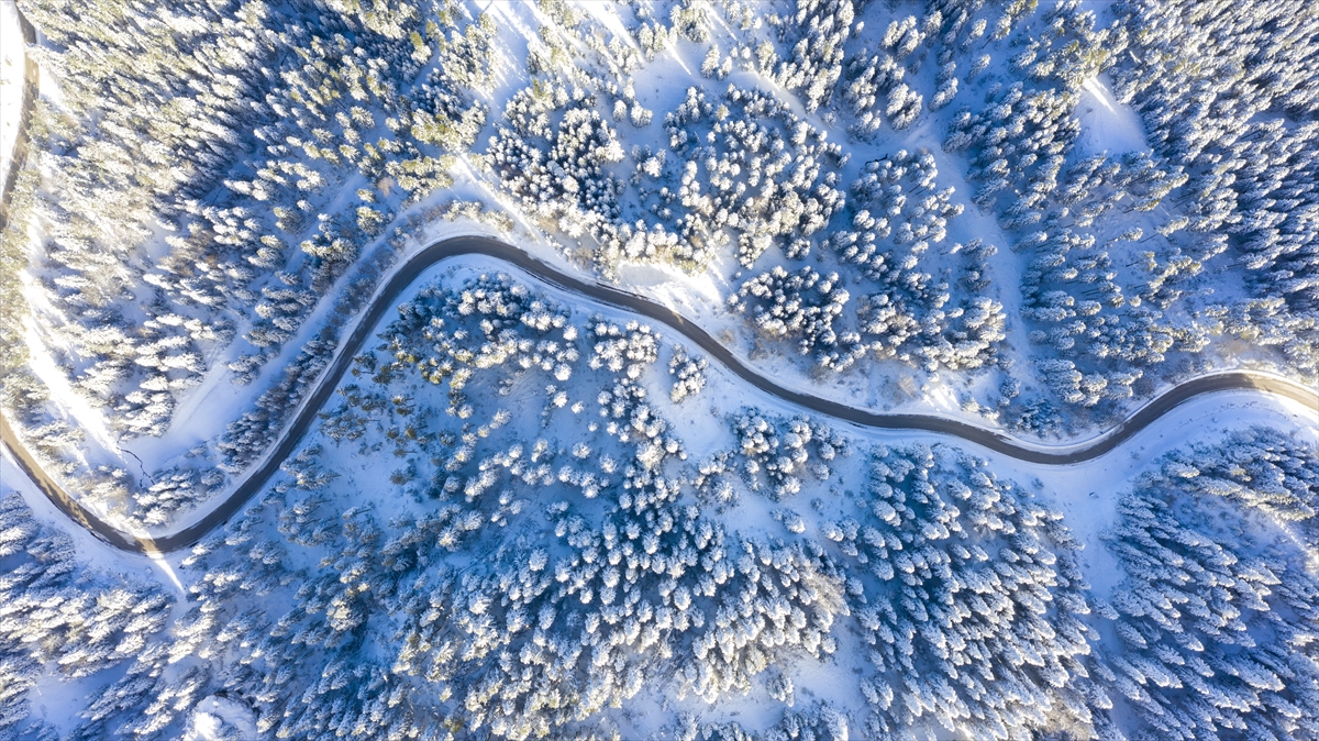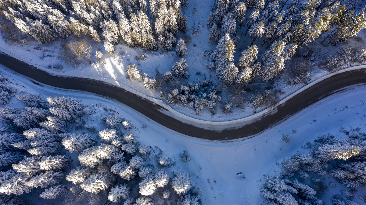 Sarıalan bölgesinde bulunan ağaçlar ile yol kenarlarındaki alanlarda oluşan kar manzarası, havadan görüntülendi.
