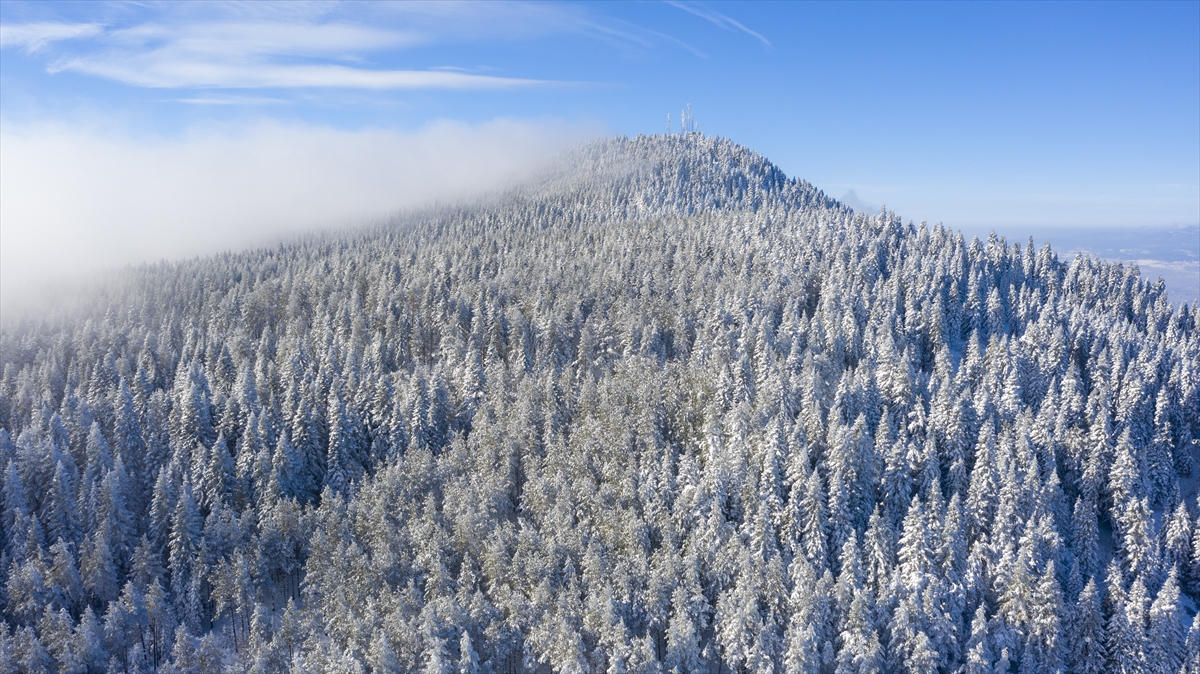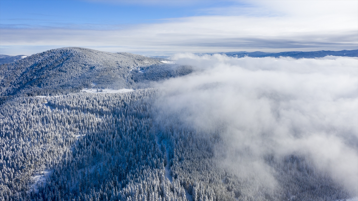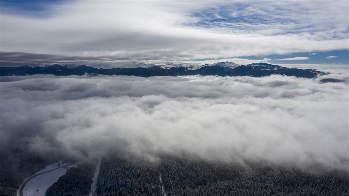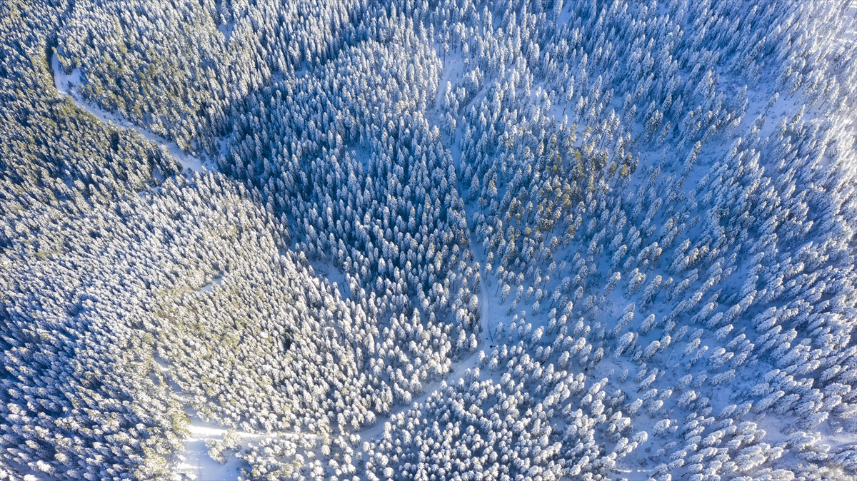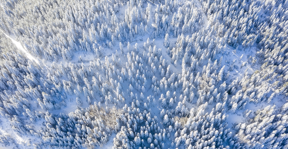 Sarıalan bölgesinde bulunan ağaçlar ile yol kenarlarındaki alanlarda oluşan kar manzarası, havadan görüntülendi.
