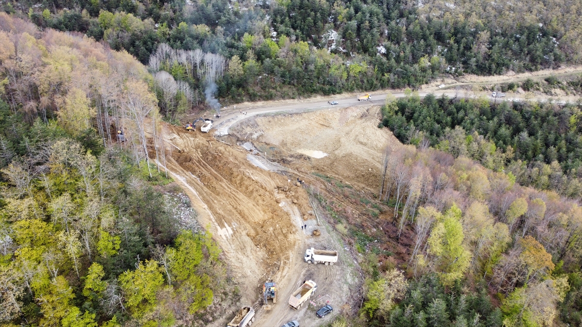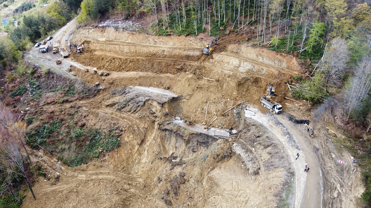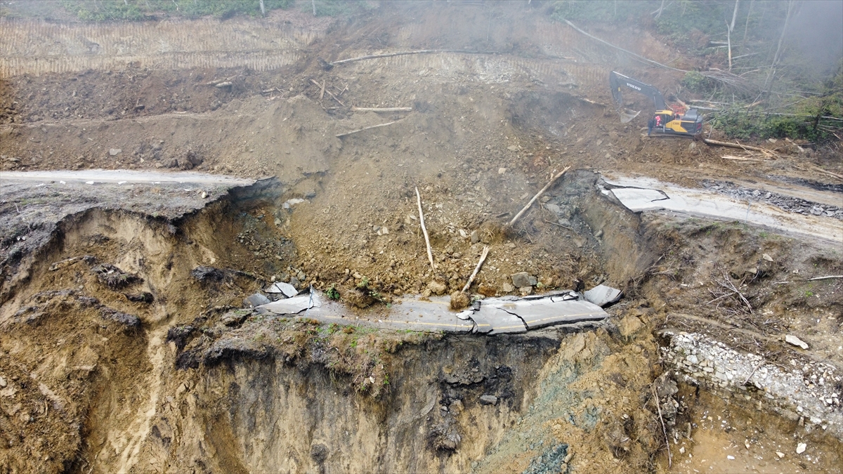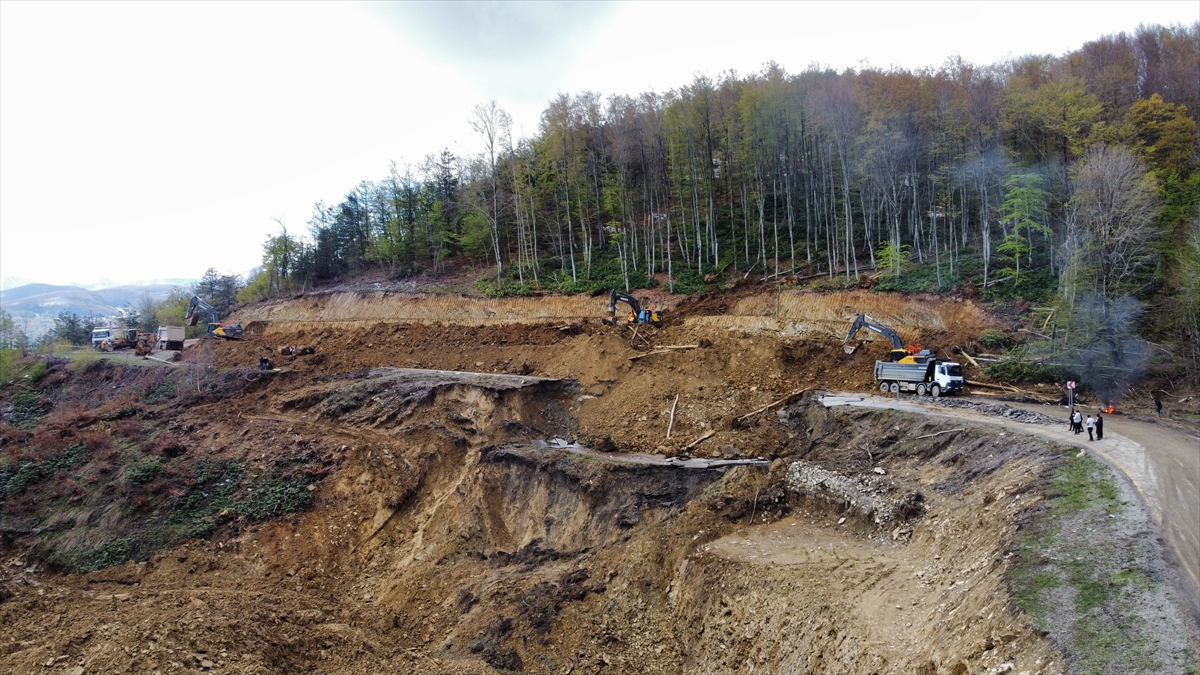 Kara yolunun çöken kısmı ve yürütülen çalışma dronla görüntülendi.