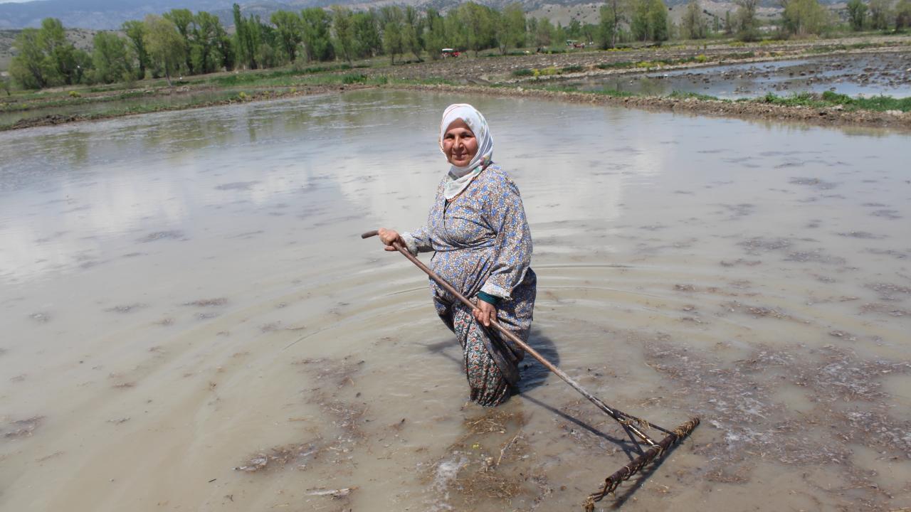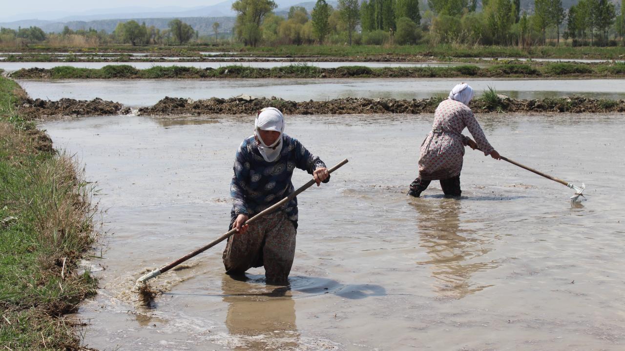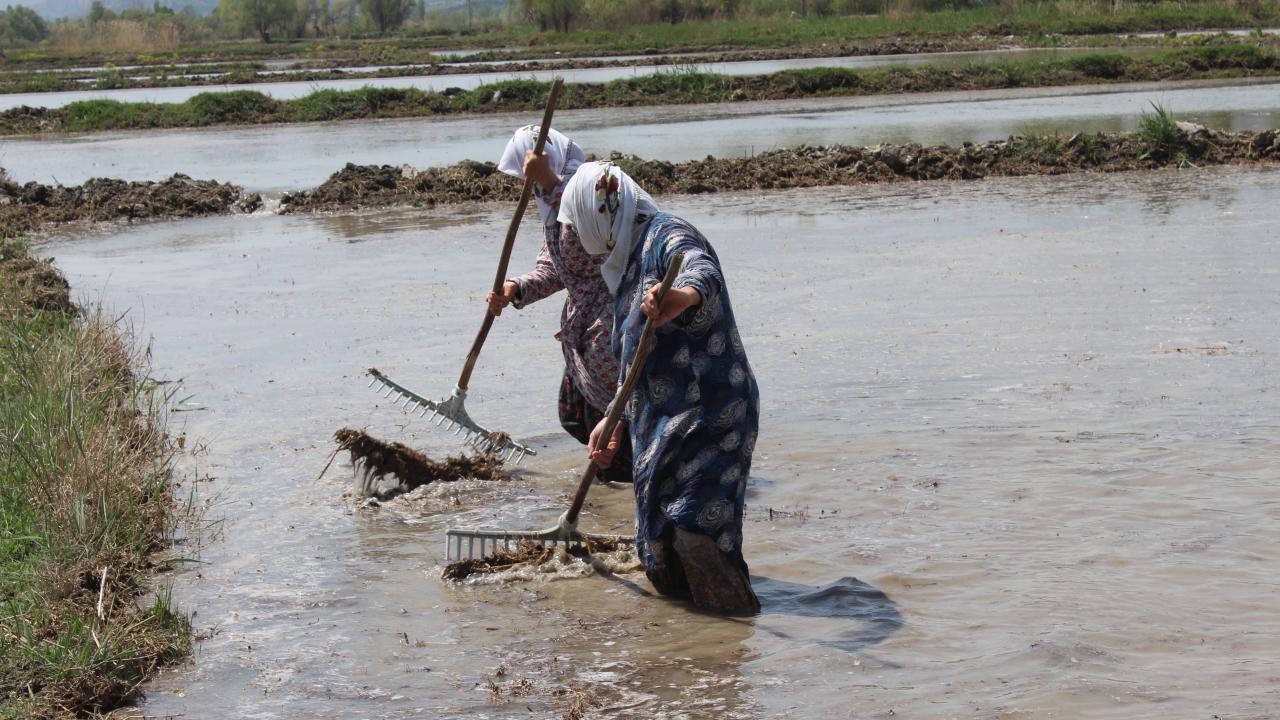 Bölgede çeltik ekiminde kadınlar da aktif rol alıyor. Suyla dolu tarlalarda dizlerine kadar çamurun içine giren kadınlar, tırmıklarla tarlaları temizliyor.