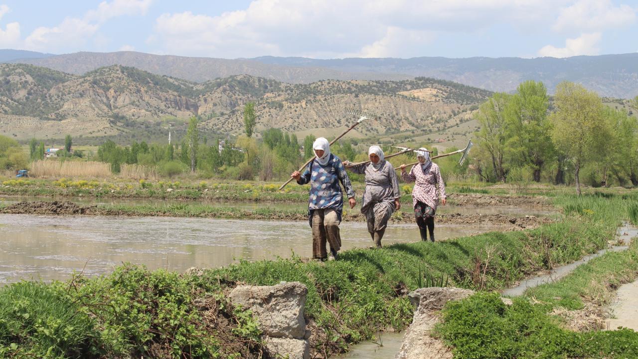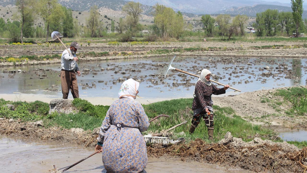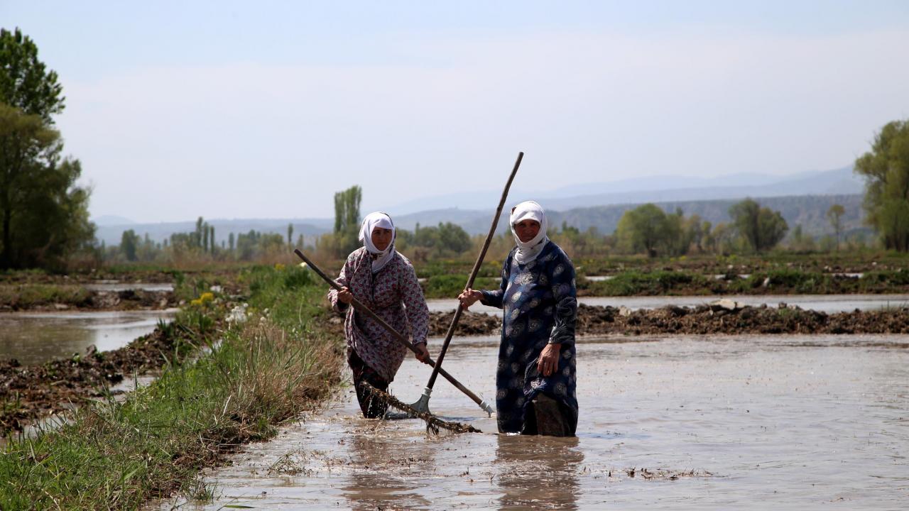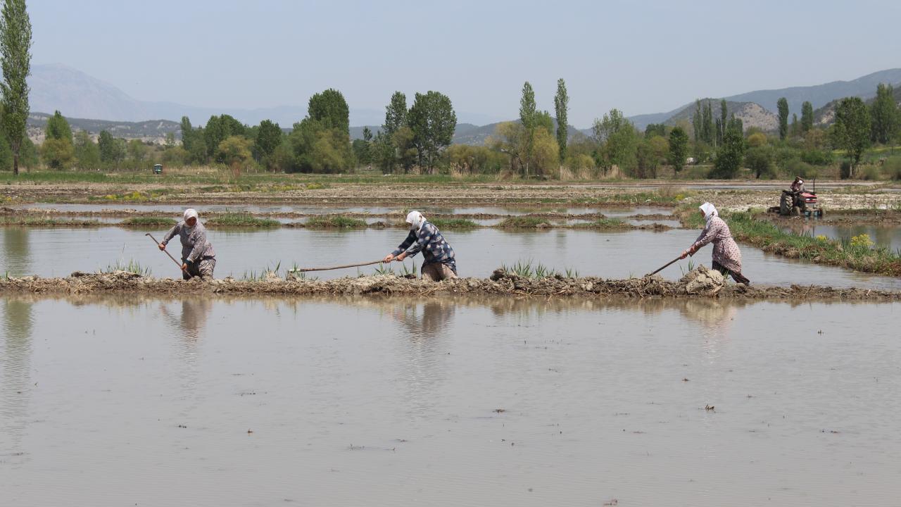 Bölgede çeltik ekiminde kadınlar da aktif rol alıyor. Suyla dolu tarlalarda dizlerine kadar çamurun içine giren kadınlar, tırmıklarla tarlaları temizliyor.