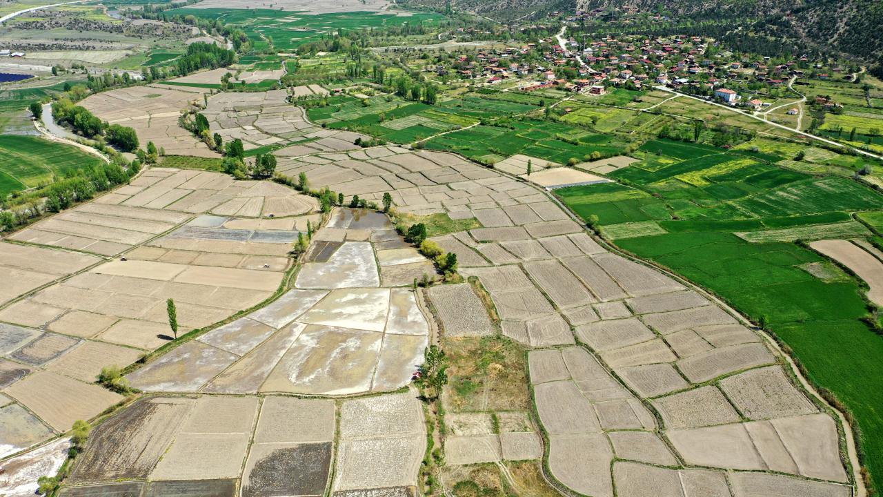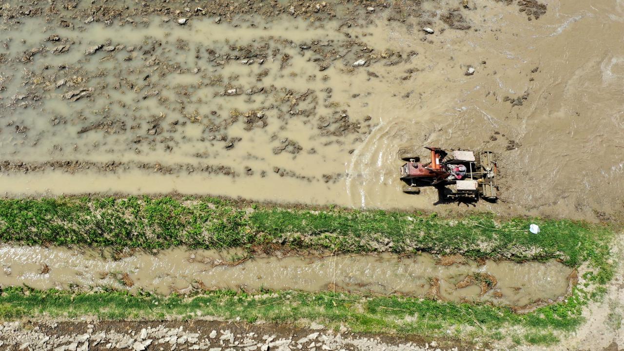 Suyu daha kolay kontrol edebilmek için çeltik tarlalarını kare şeklinde hazırlayan çiftçiler, pullukla sürdükten sonra yabancı otlardan arındırıyor.