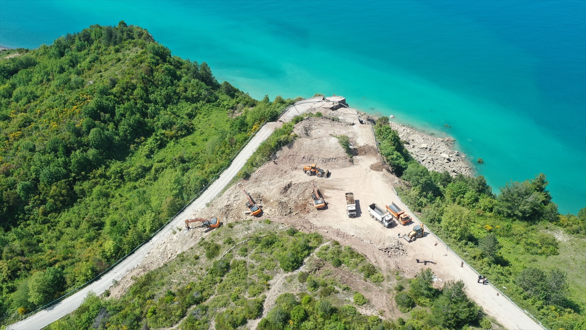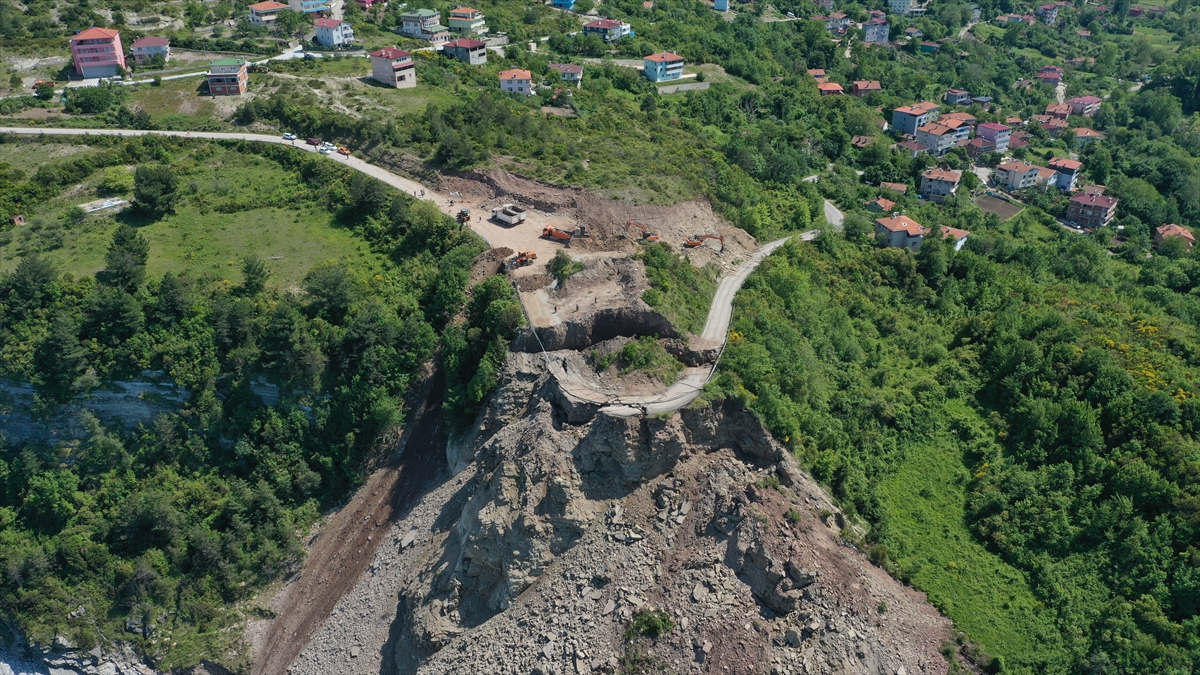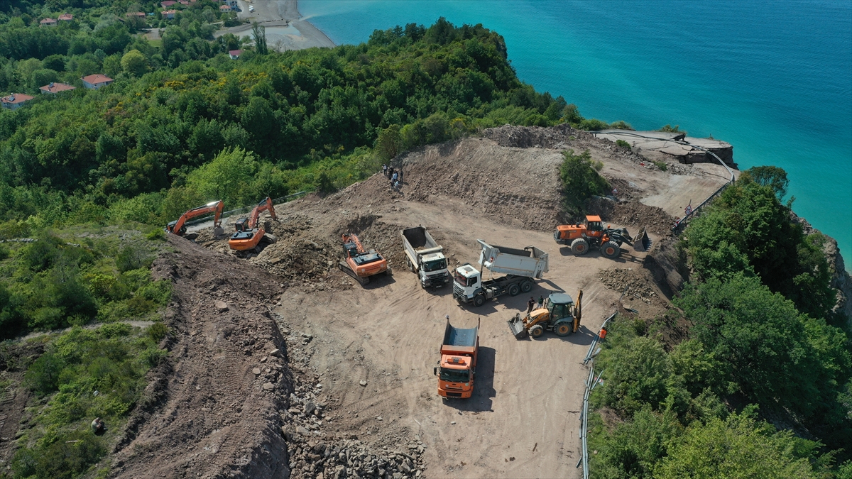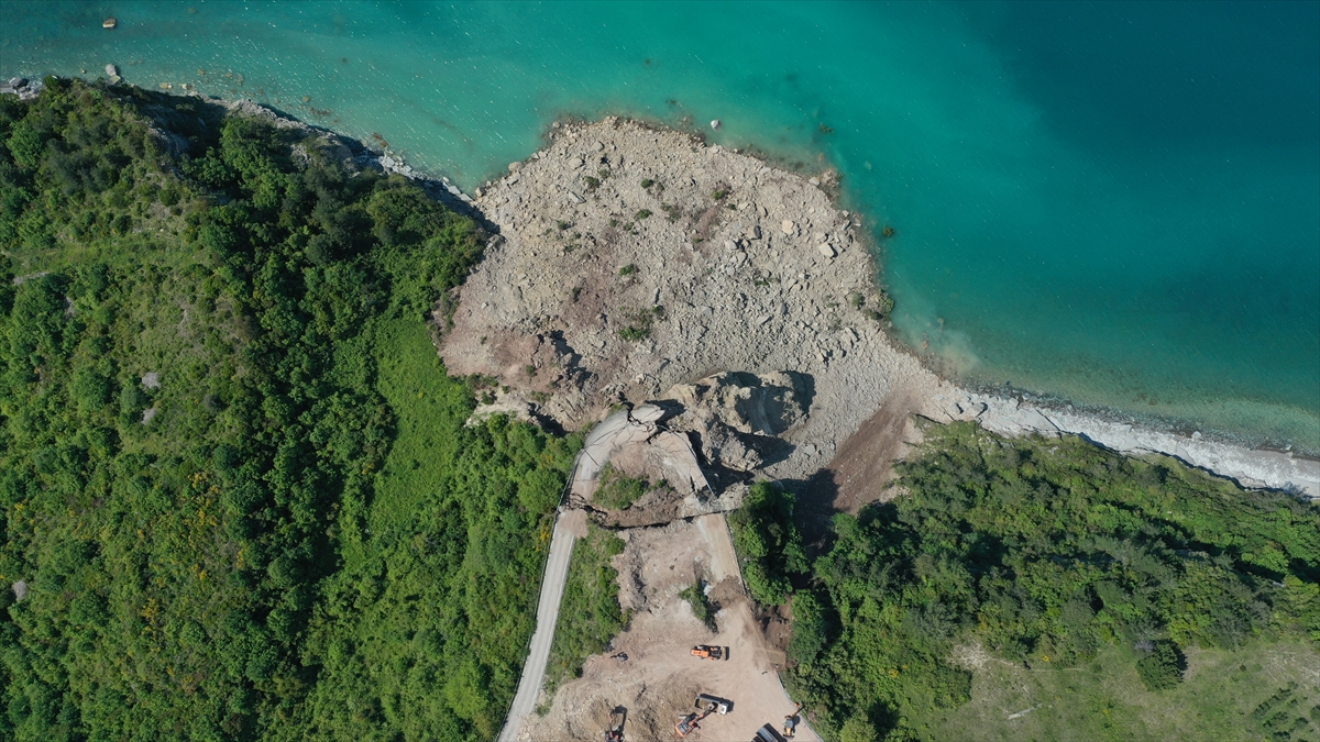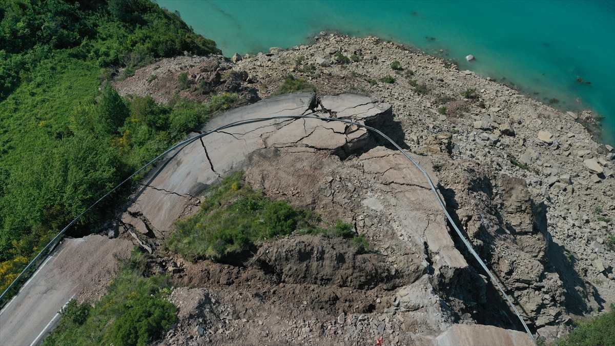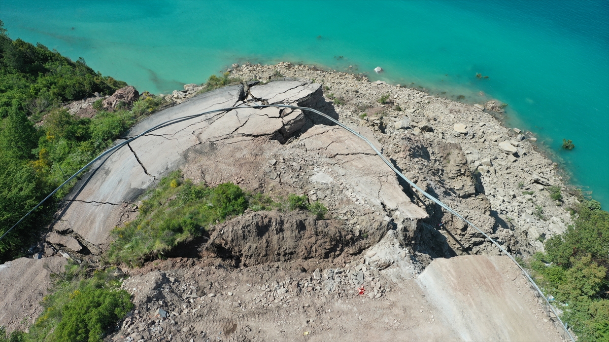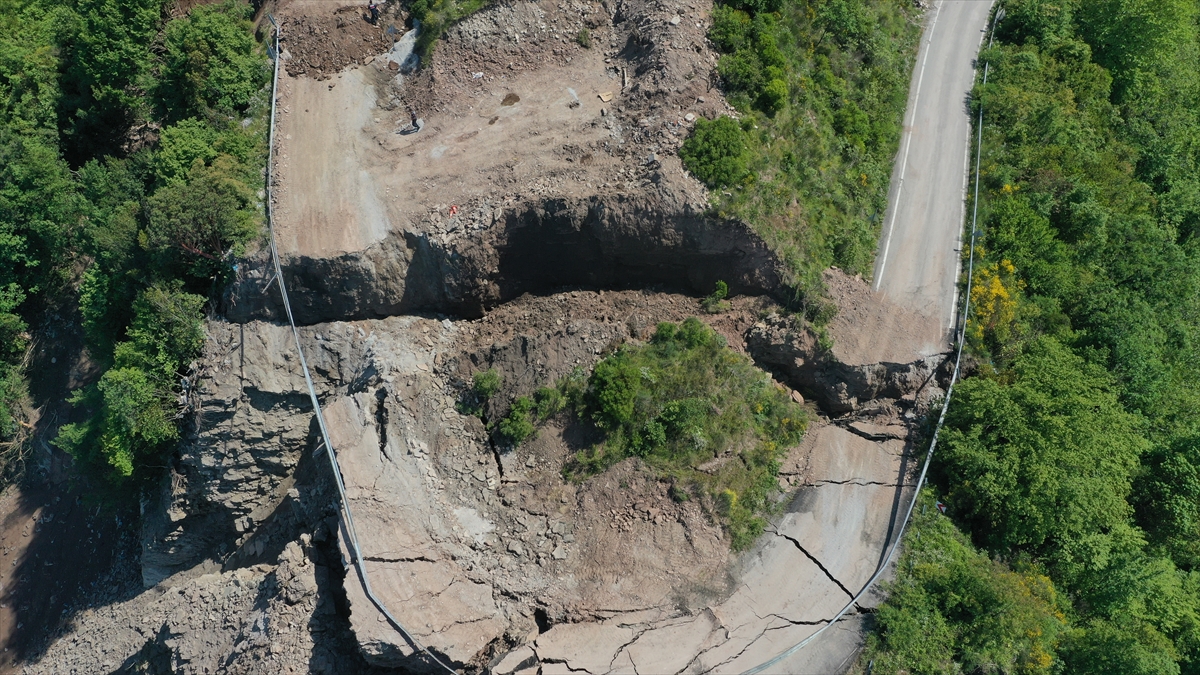 Heyelan nedeniyle kara yolunun denize doğru kayması dronla görüntülendi.