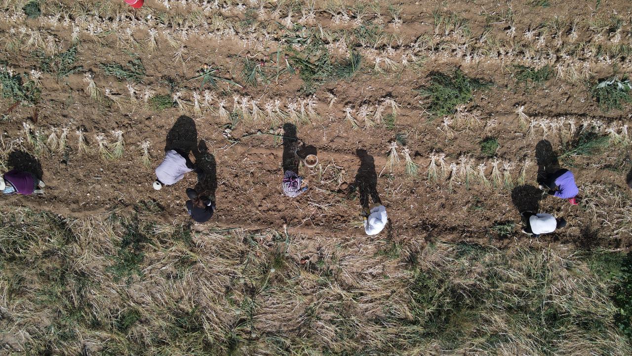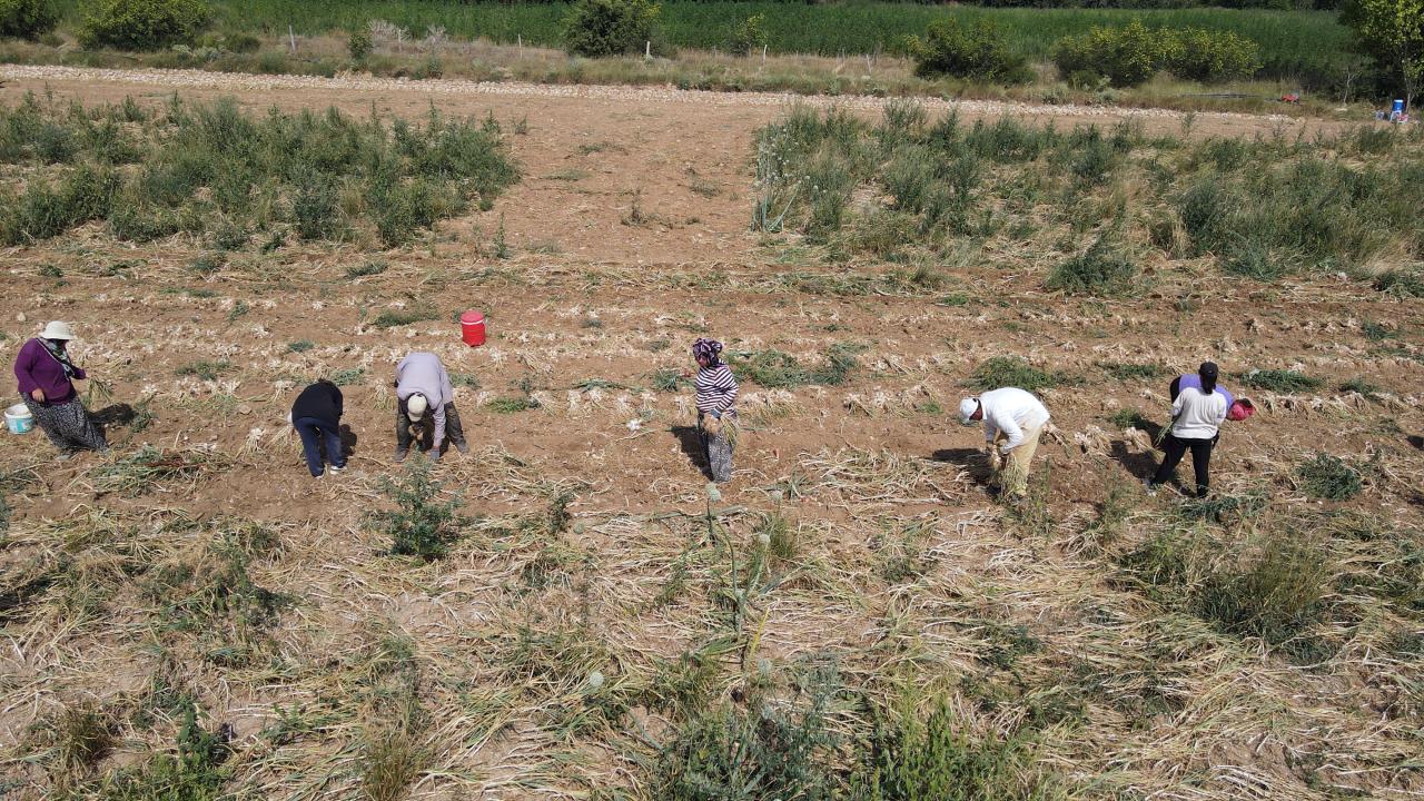 Sarımsak tarlalarında çalışan lise ve üniversite öğrencileri, gelir elde etme fırsatı buluyor.