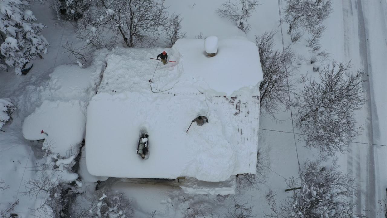 Çatılarda da çökme tehlikesine karşı kar küreme çalışması yapan vatandaşlar dron ile görüntülendi.