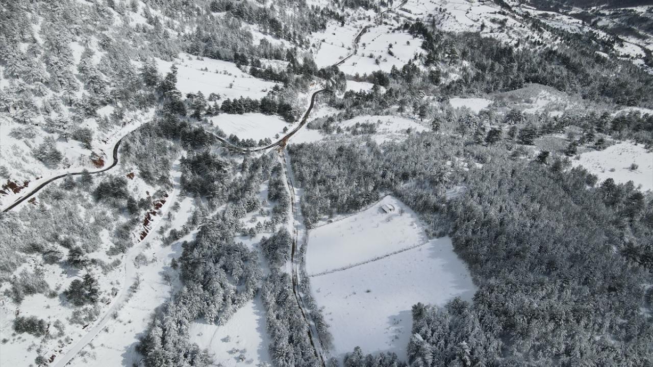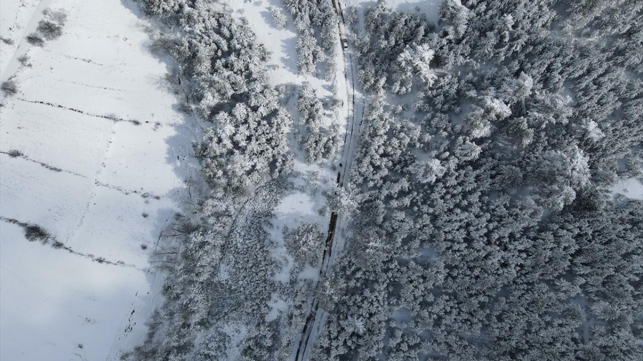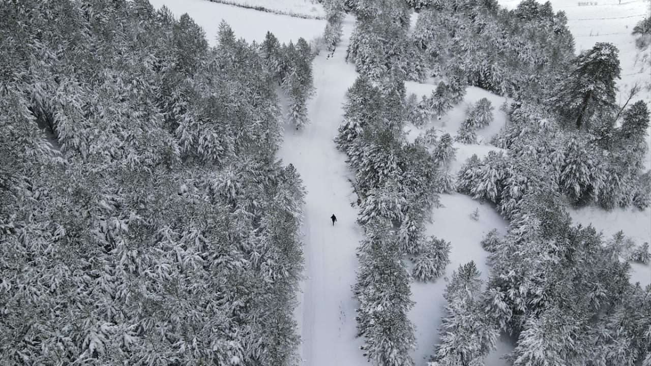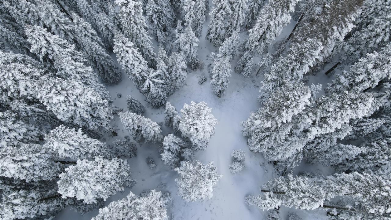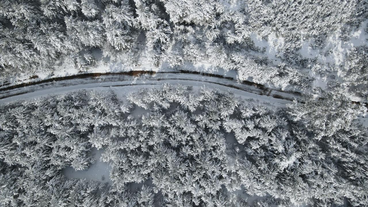 Ormanlık alanların beyaz örtüyle kaplanması dronla görüntülendi.