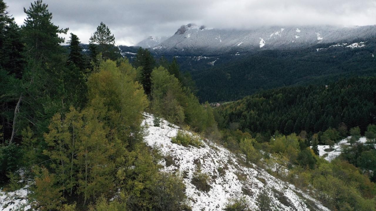Ormanların eteklerindeki sonbaharın renklerine bürünen ağaçlarla karla kaplı ağaçlar iki mevsimi bir araya getirdi.