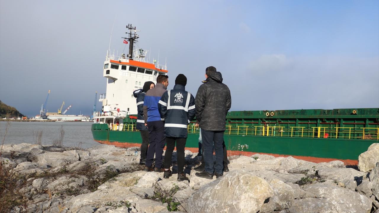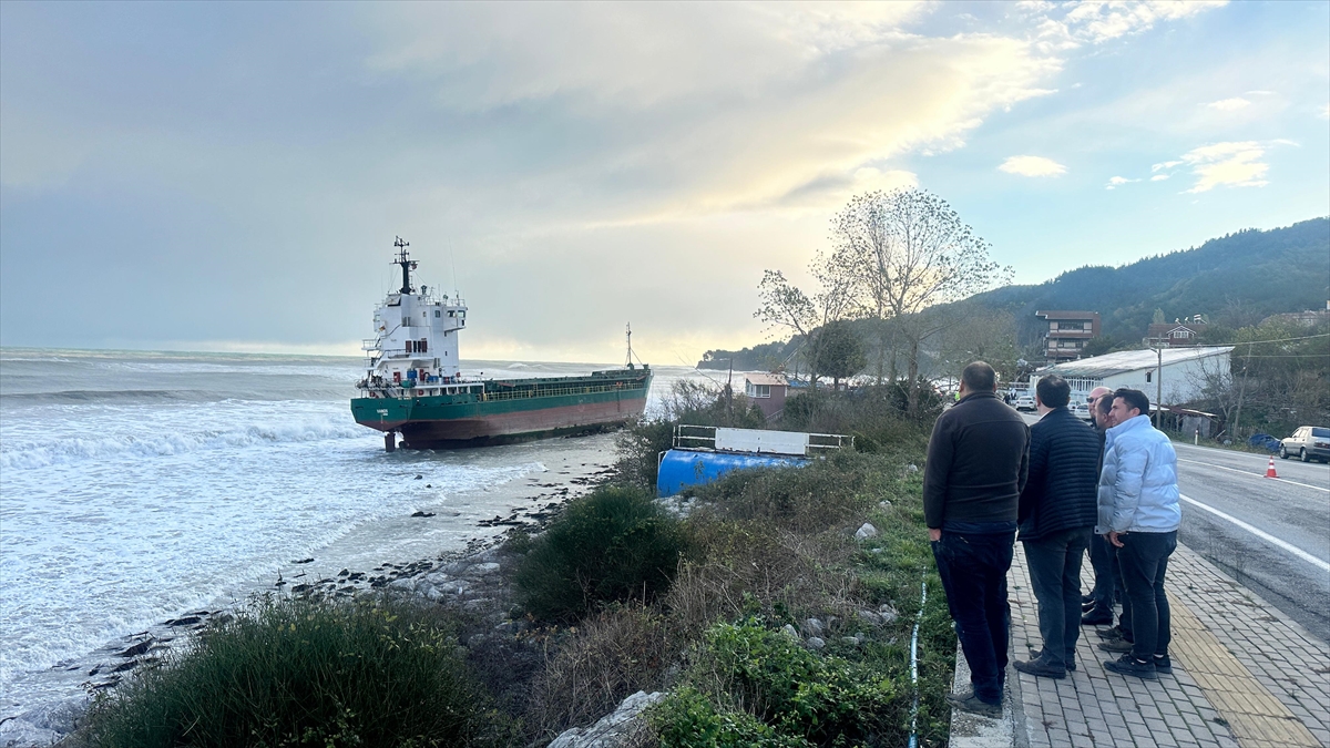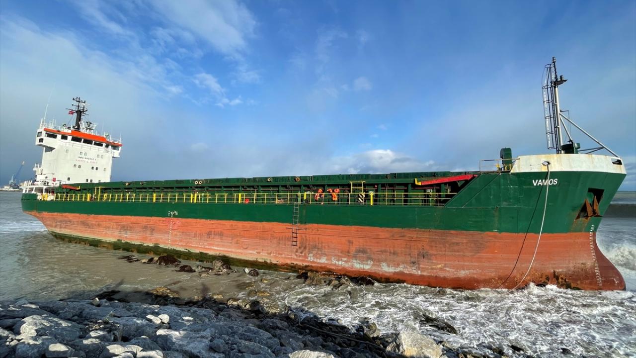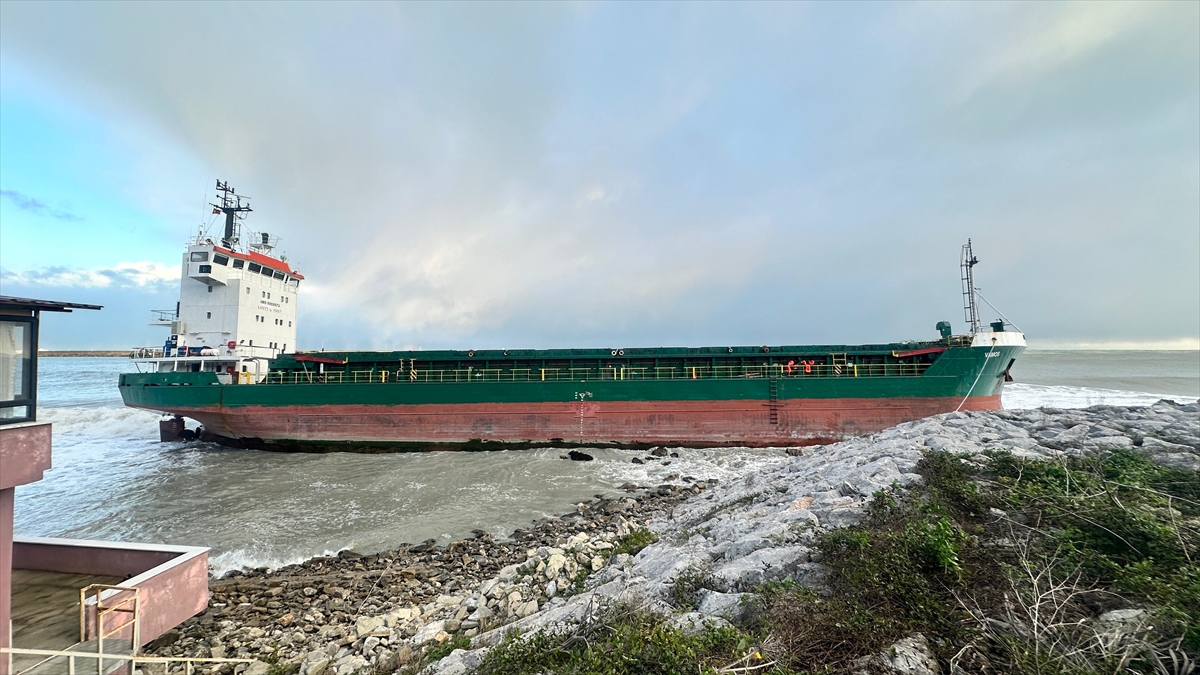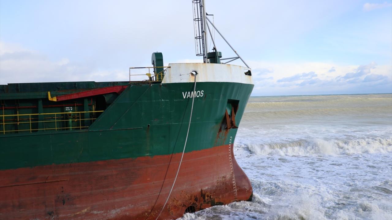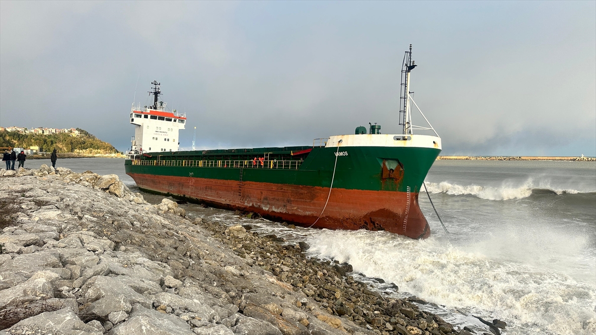 İnebolu ilçesinde fırtına nedeniyle Kamboçya bayraklı "Vamos" adlı kuru yük gemisi kıyıya sürüklendi.