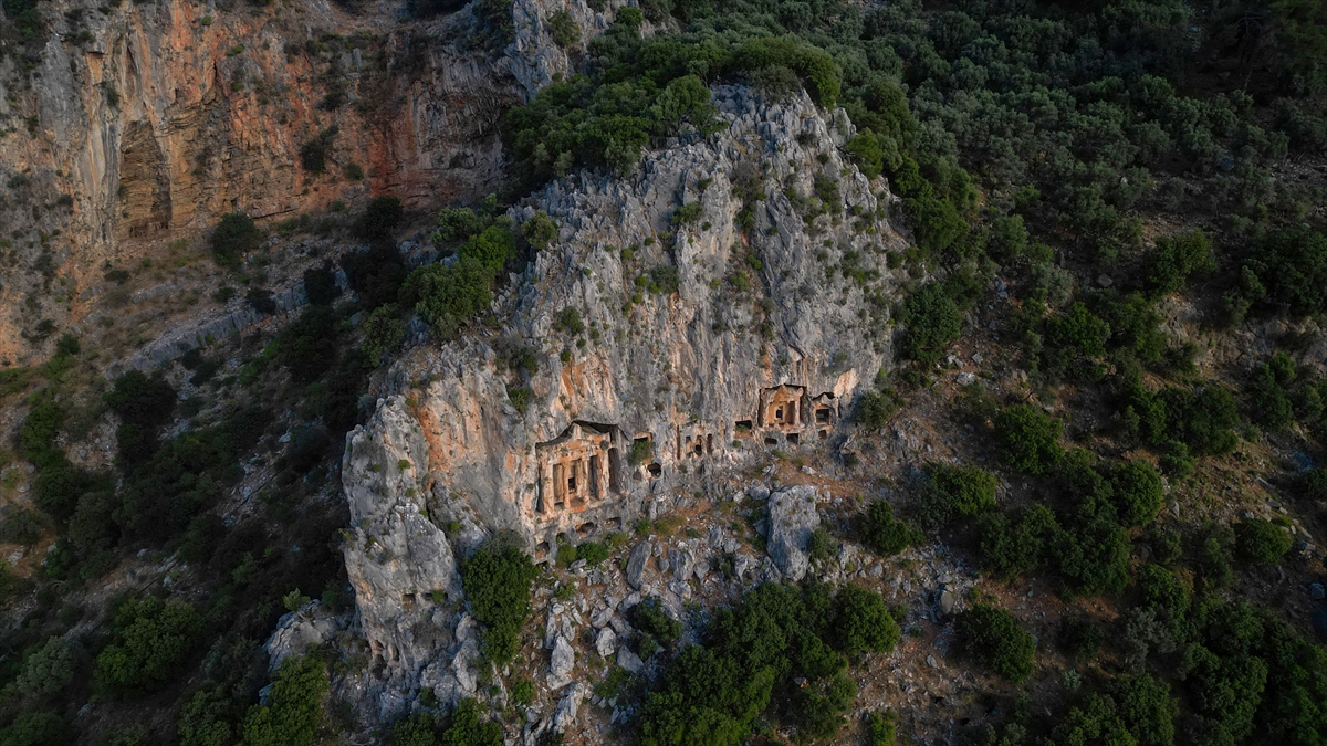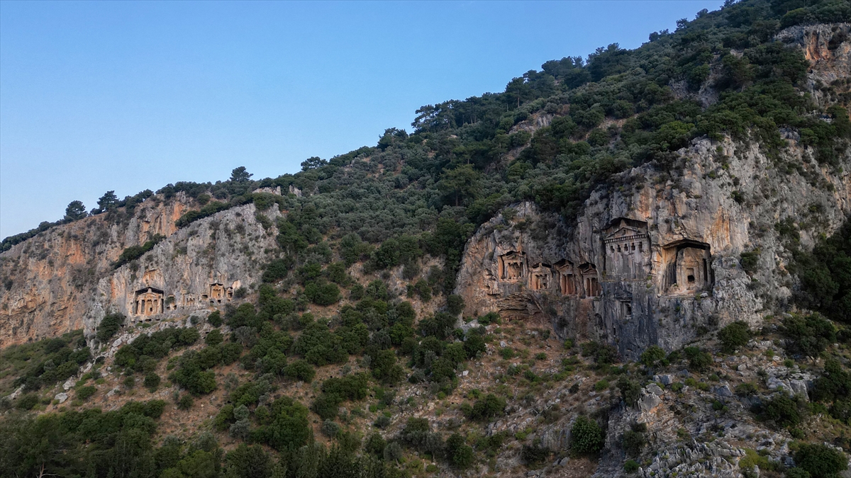 Antik kent ve kaya mezarları, Dalyan Mahallesi`nden de görülebiliyor.