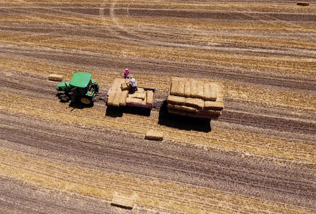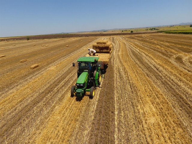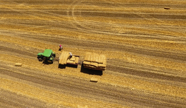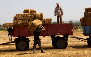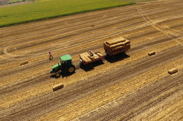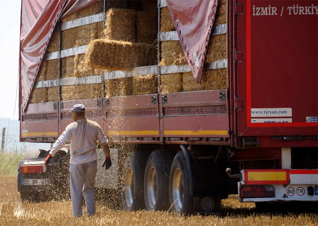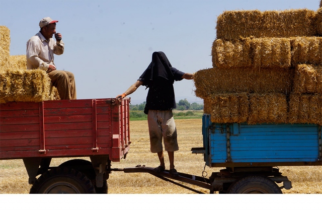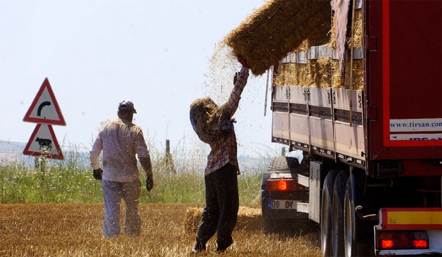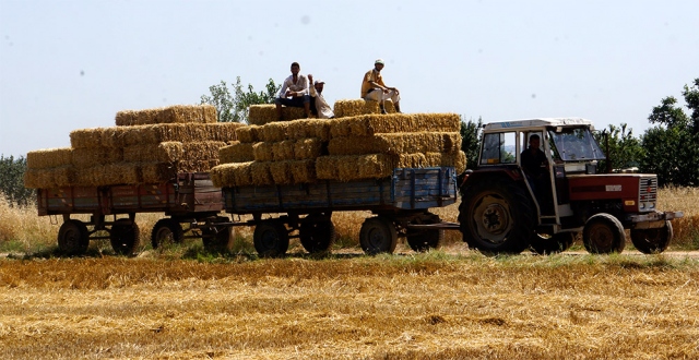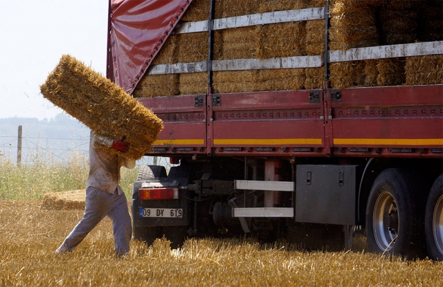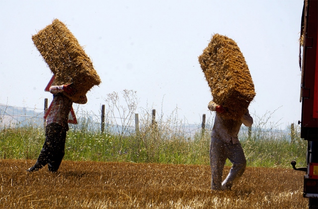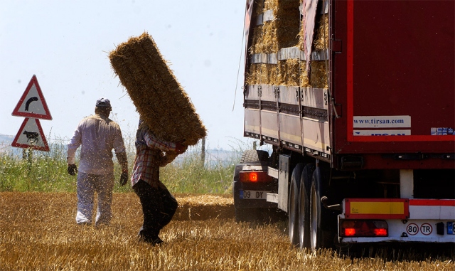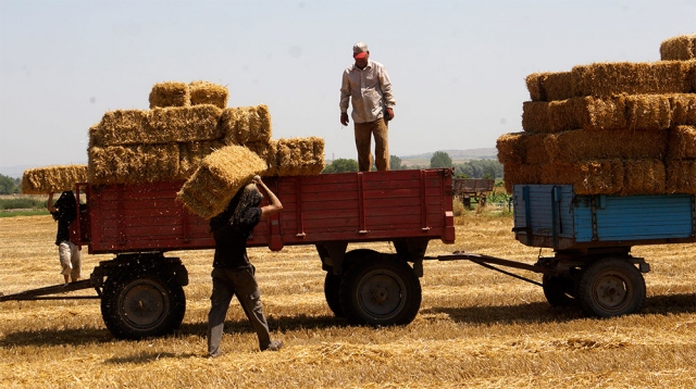 Saman balyası taşıyan sezonluk işçiler güneşin altında kavurucu sıcağa rağmen ekmek parası mücadelesi veriyor. İşçiler taşıdıkları her saman balyasına karşılık yaklaşık 1 lira 25 kuruş alıyor.
