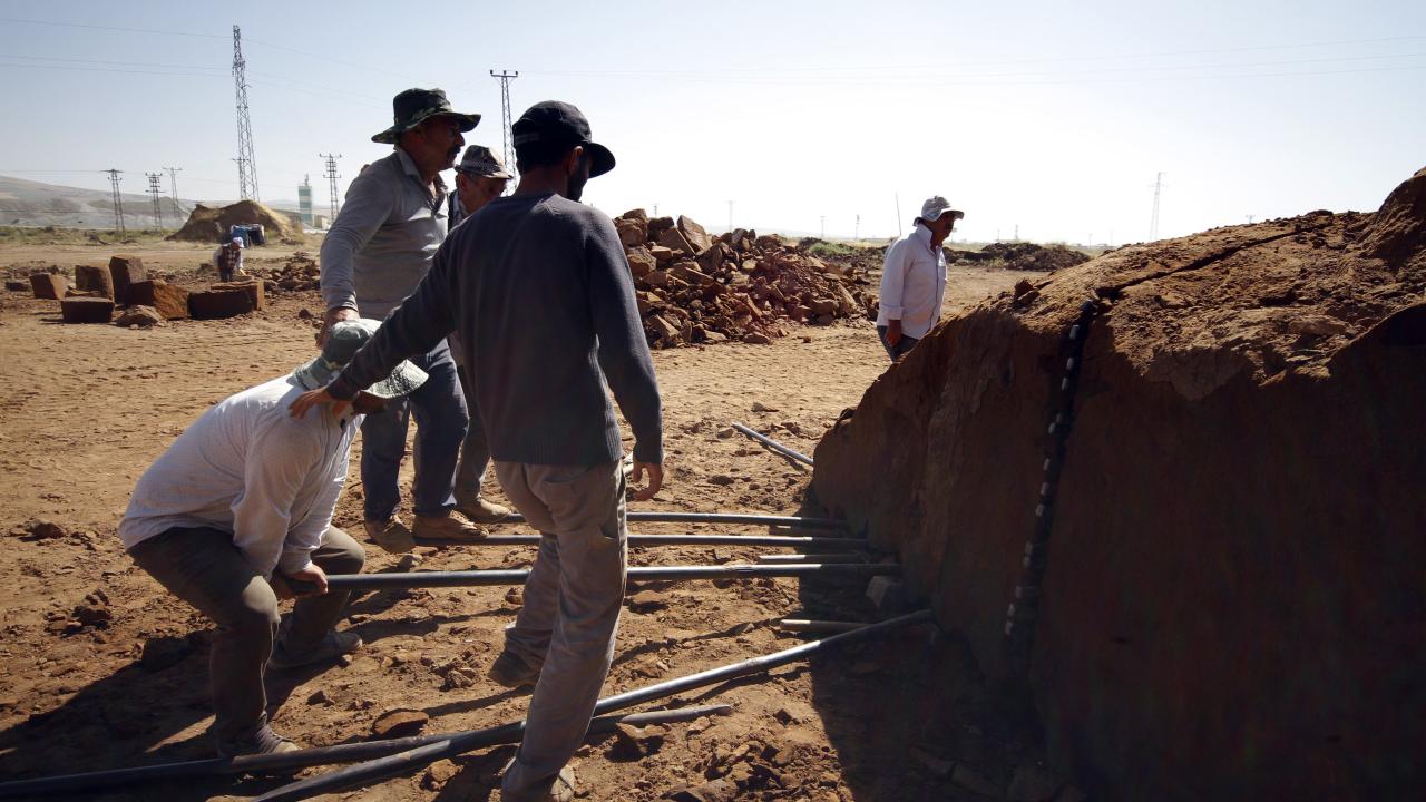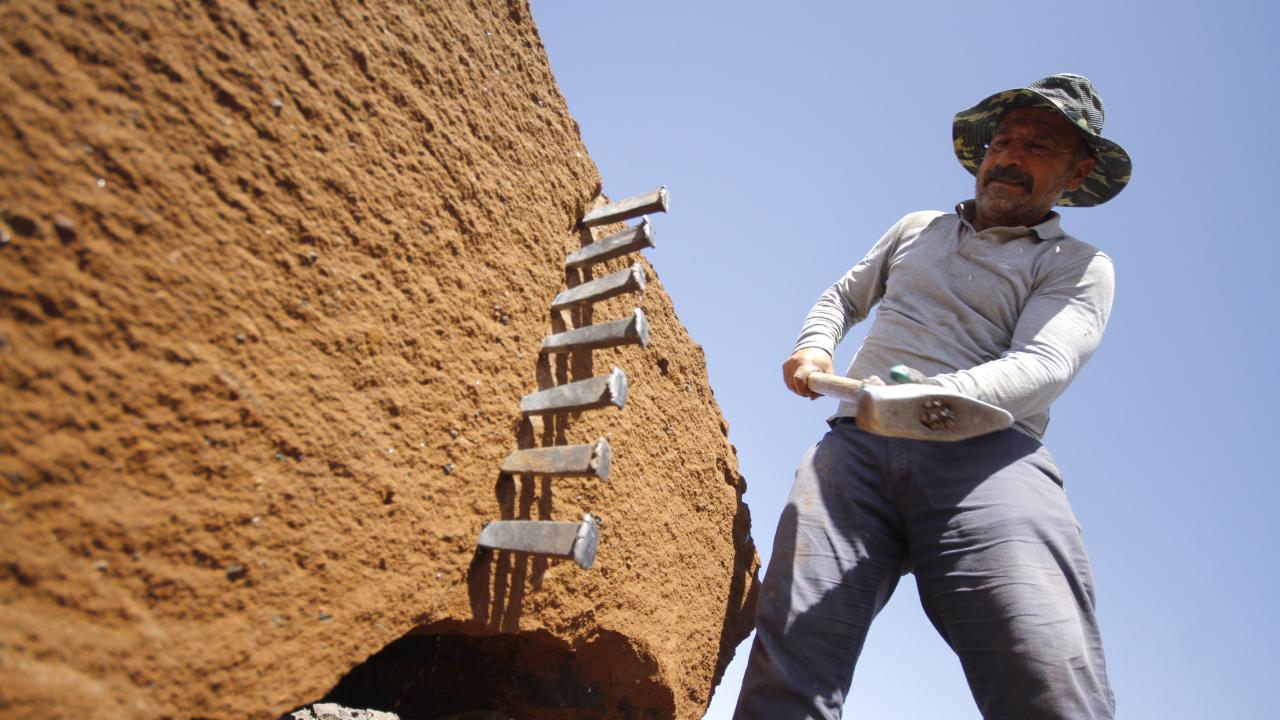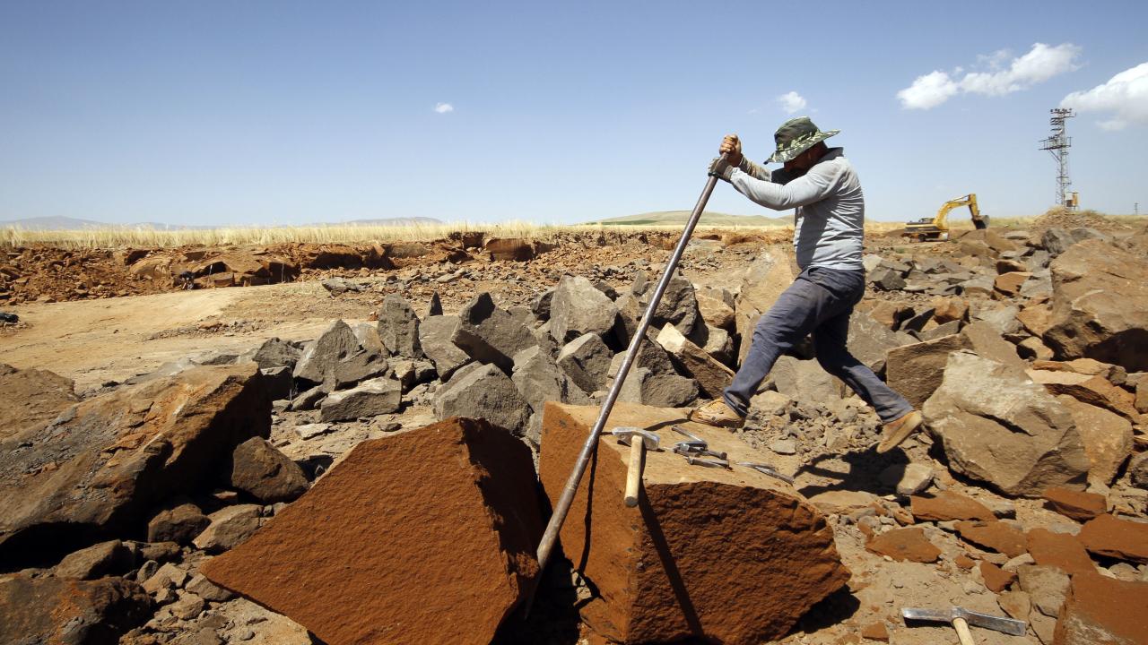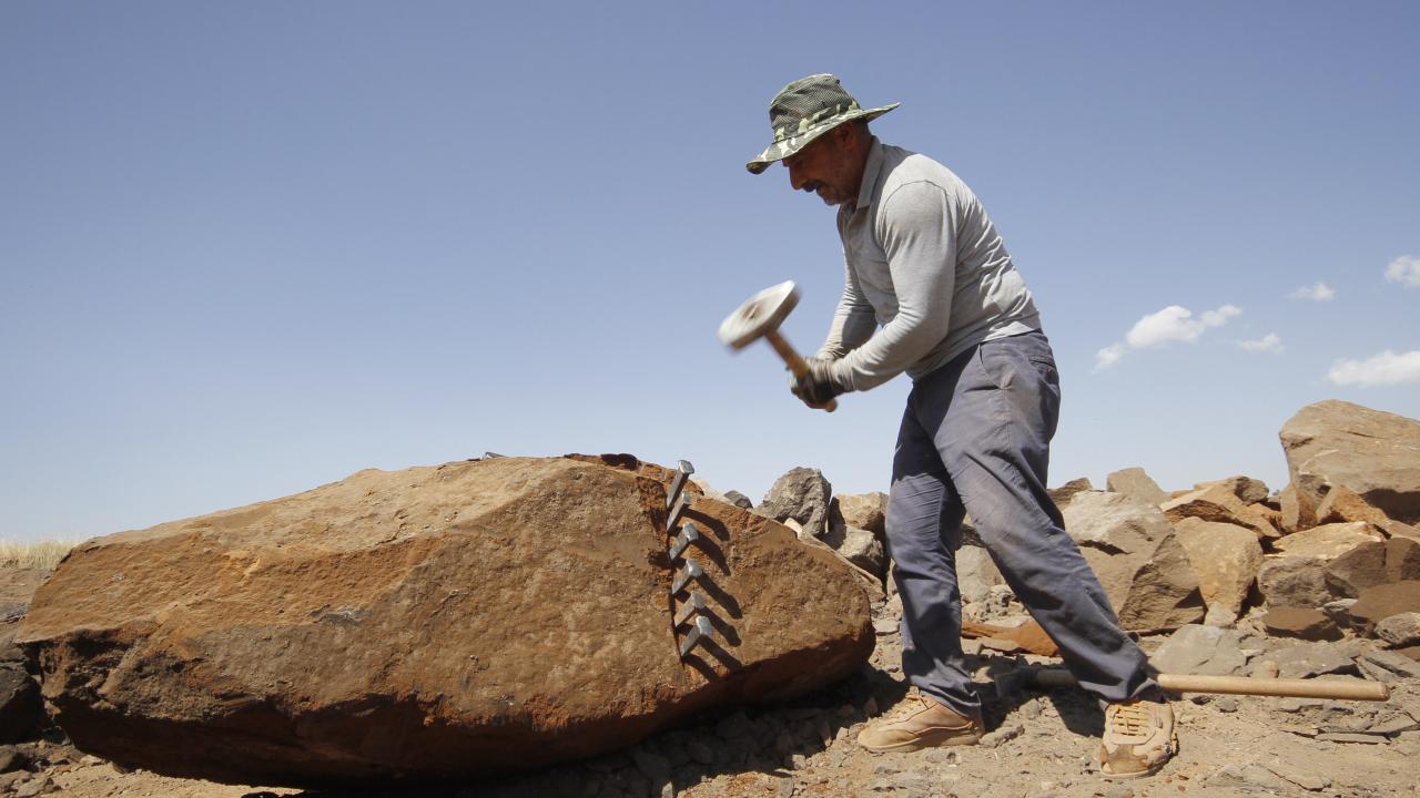Bitlis'in Ahlat ilçesinde taş işçileri, kavurucu sıcakta Nemrut Dağı eteklerinde çıkardıkları volkanik kaya kütlelerini parçalayarak ekmeklerini kazanmanın mücadelesini veriyor.