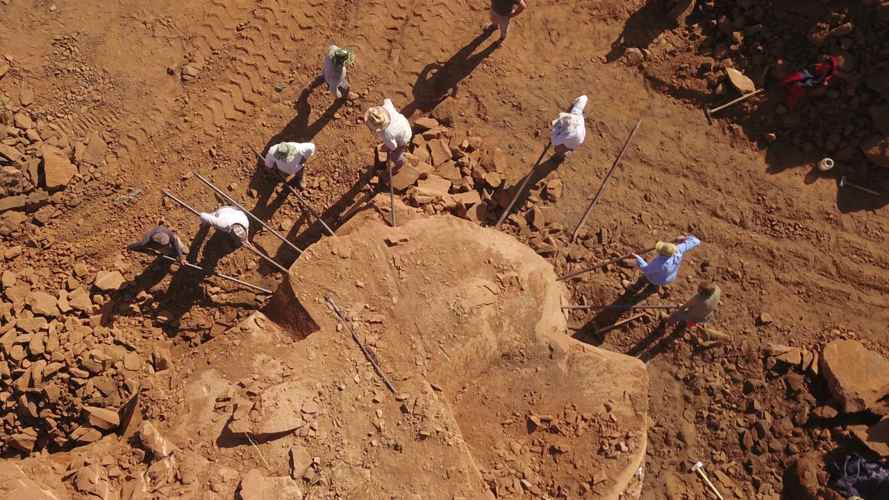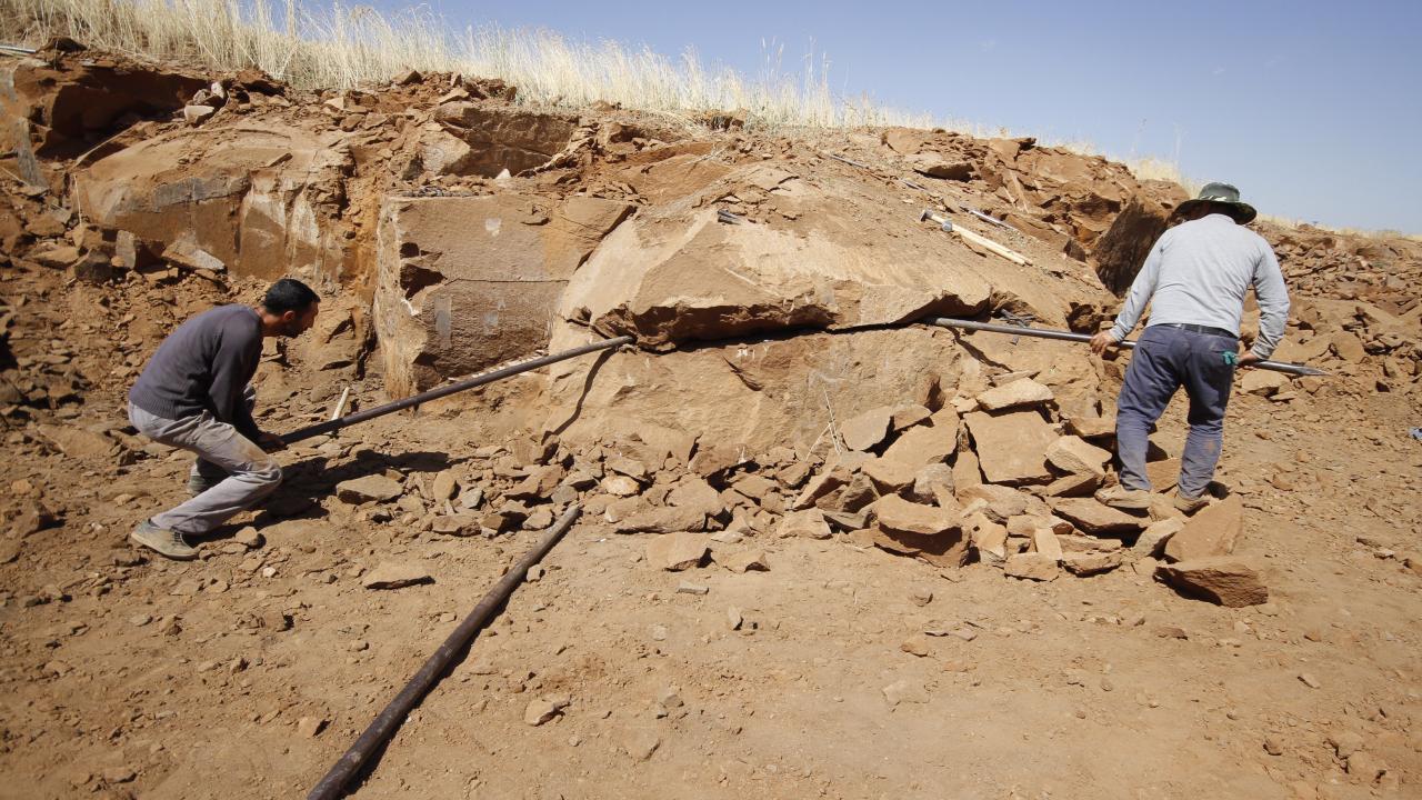 Yerinden koparılan kaya kütlesi parçalara ayrılarak yapı için ham hale getiriliyor.