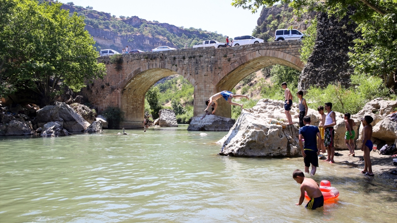 Diyarbakır'da bulunan tarihi Taşköprü, doğal güzellikleri ve berrak suyu ile bölgenin kavurucu sıcaklarından bunalan vatandaşları ağırlıyor.