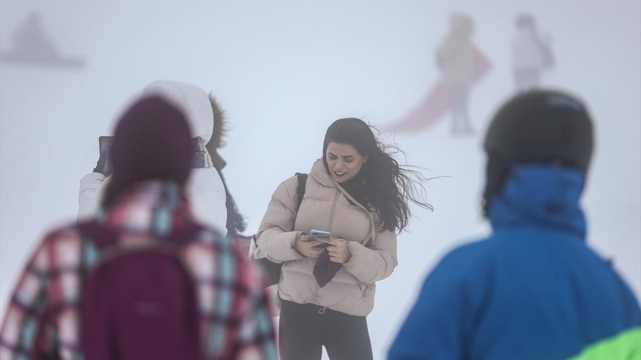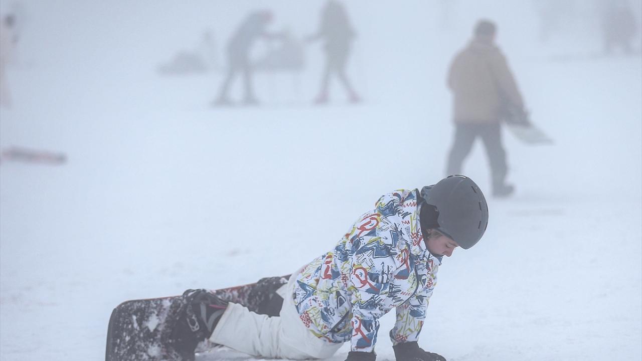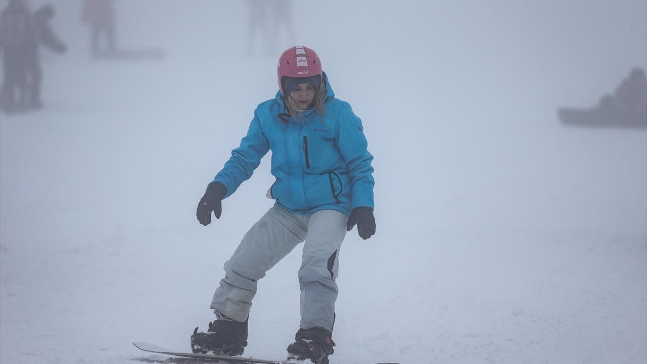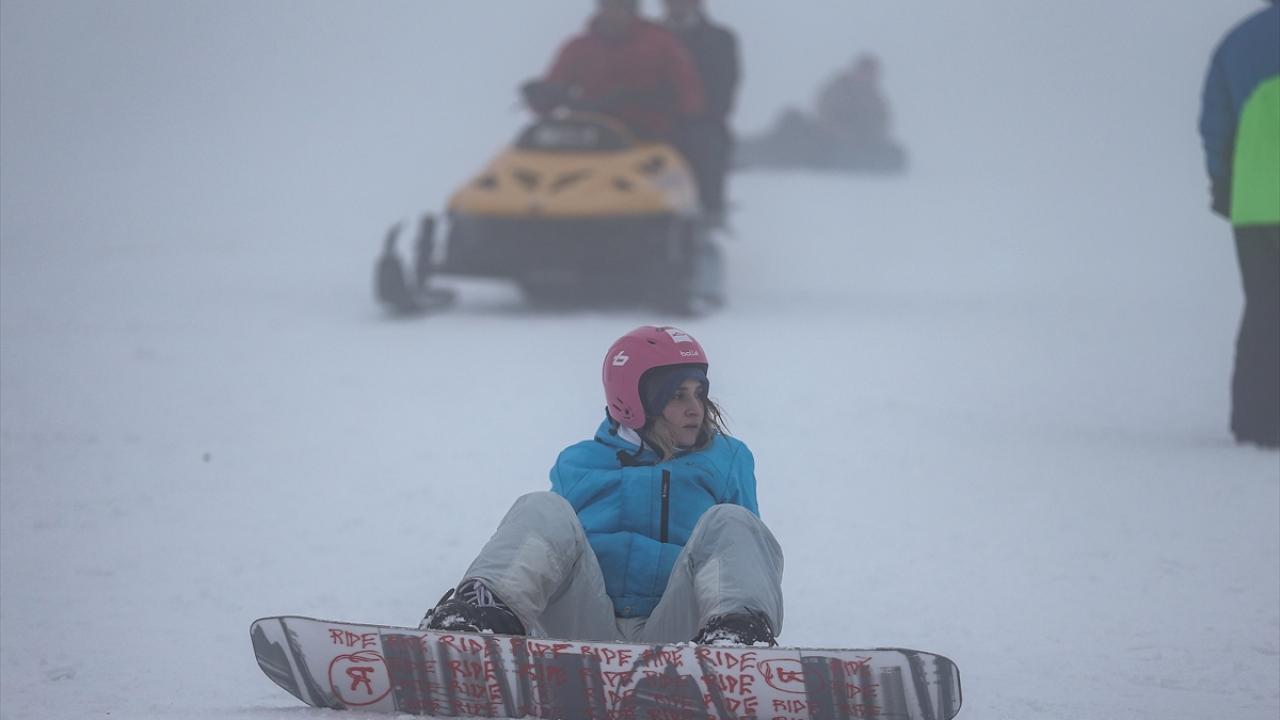 Sis ve rüzgarın etkili olduğu, kar kalınlığının 58 santimetreye ulaştığı Oteller Bölgesi`nde kayak ve snowboard yapanlar zaman zaman zorluk yaşıyor.