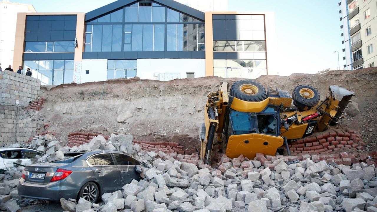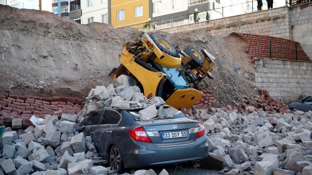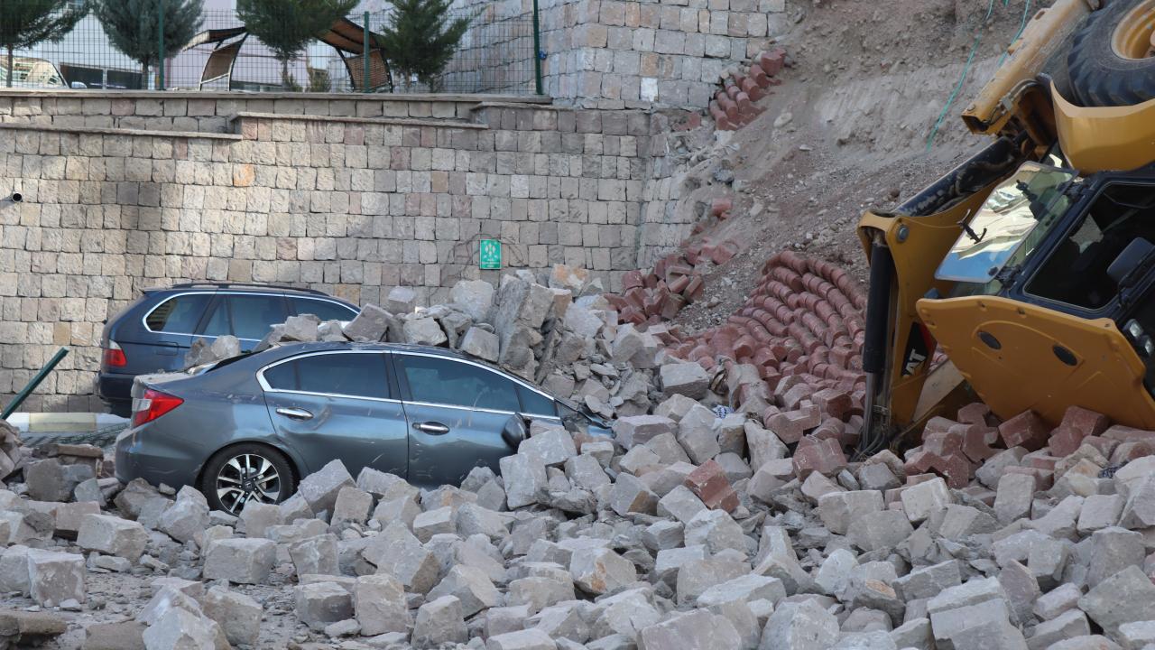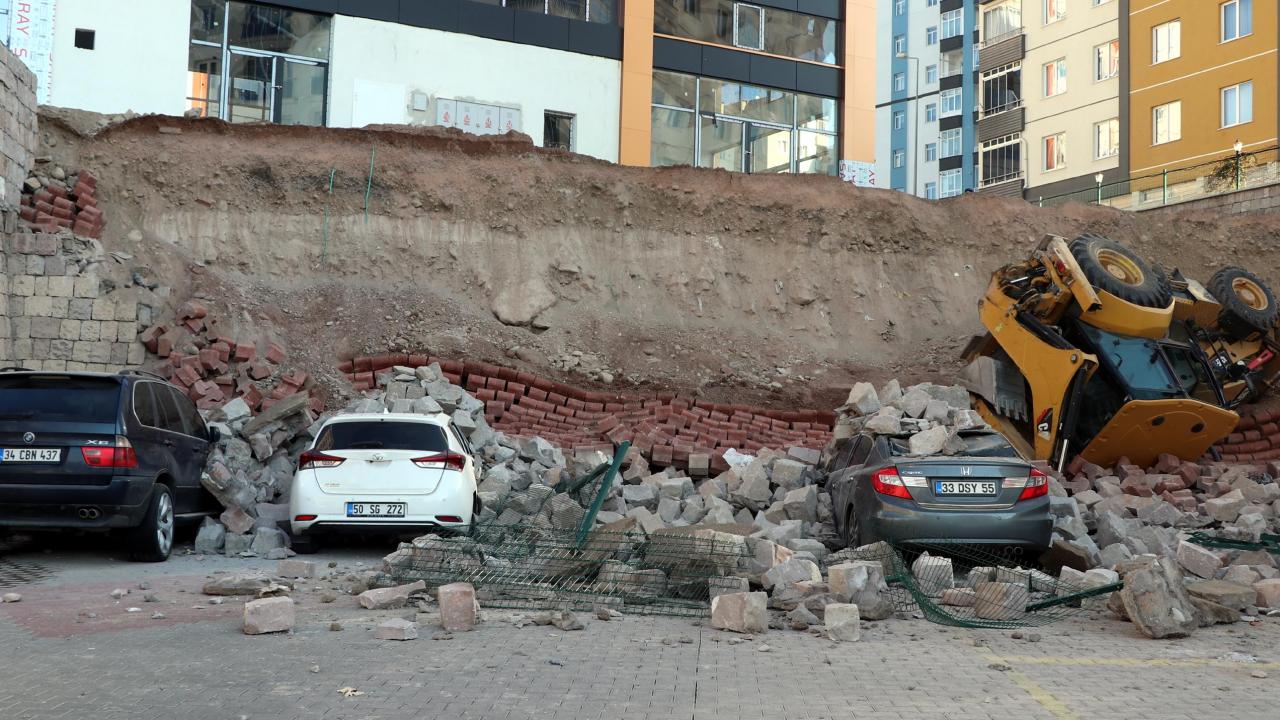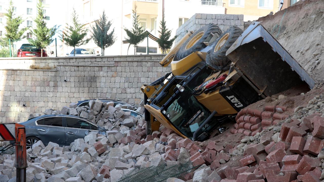 Kayseri'de çevre düzenlemesi sırasında istinat duvarı çöktü. Devrilen iş makinesinin operatörü yaralandı. Park halindeki 4 otomobil ise hurdaya döndü.