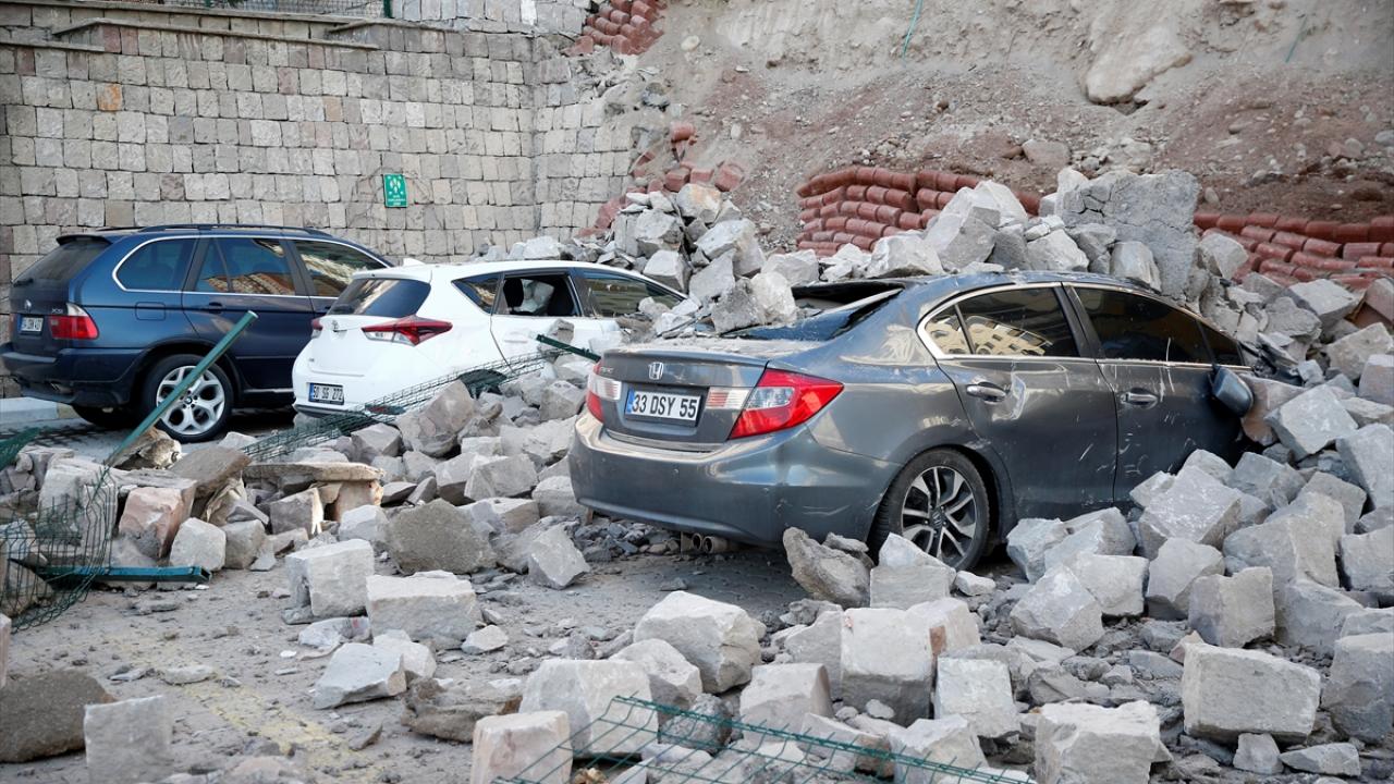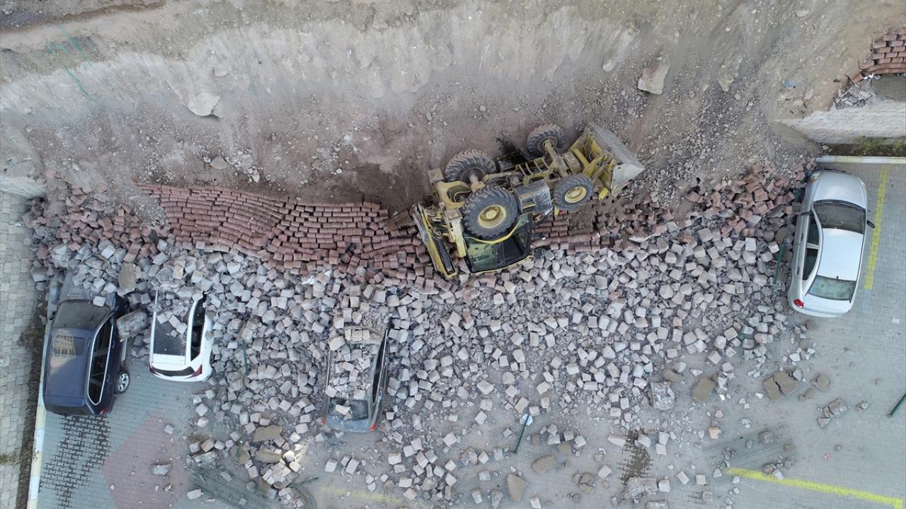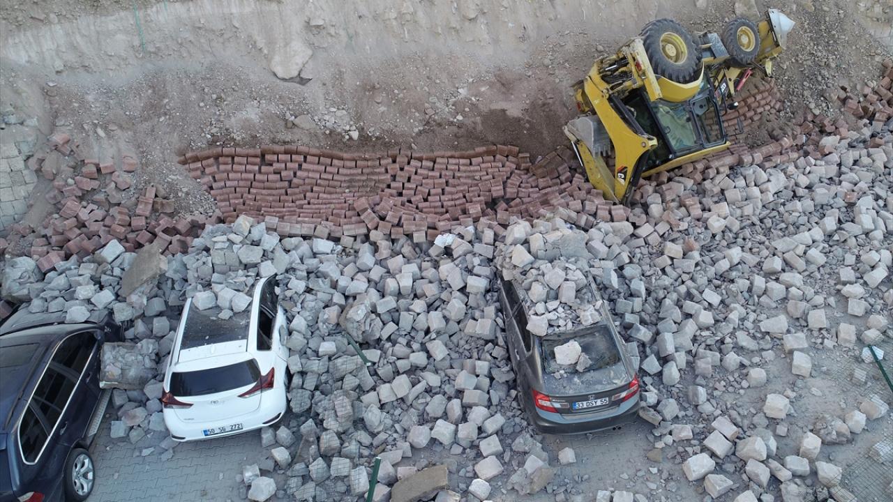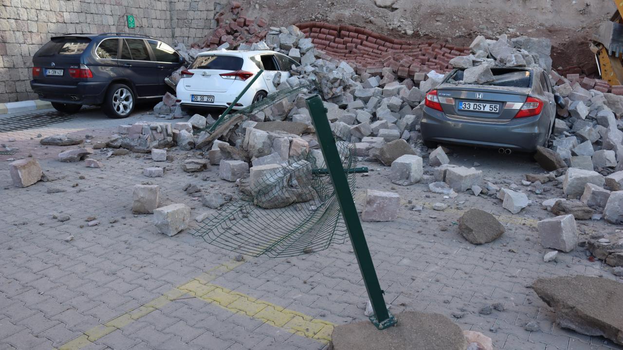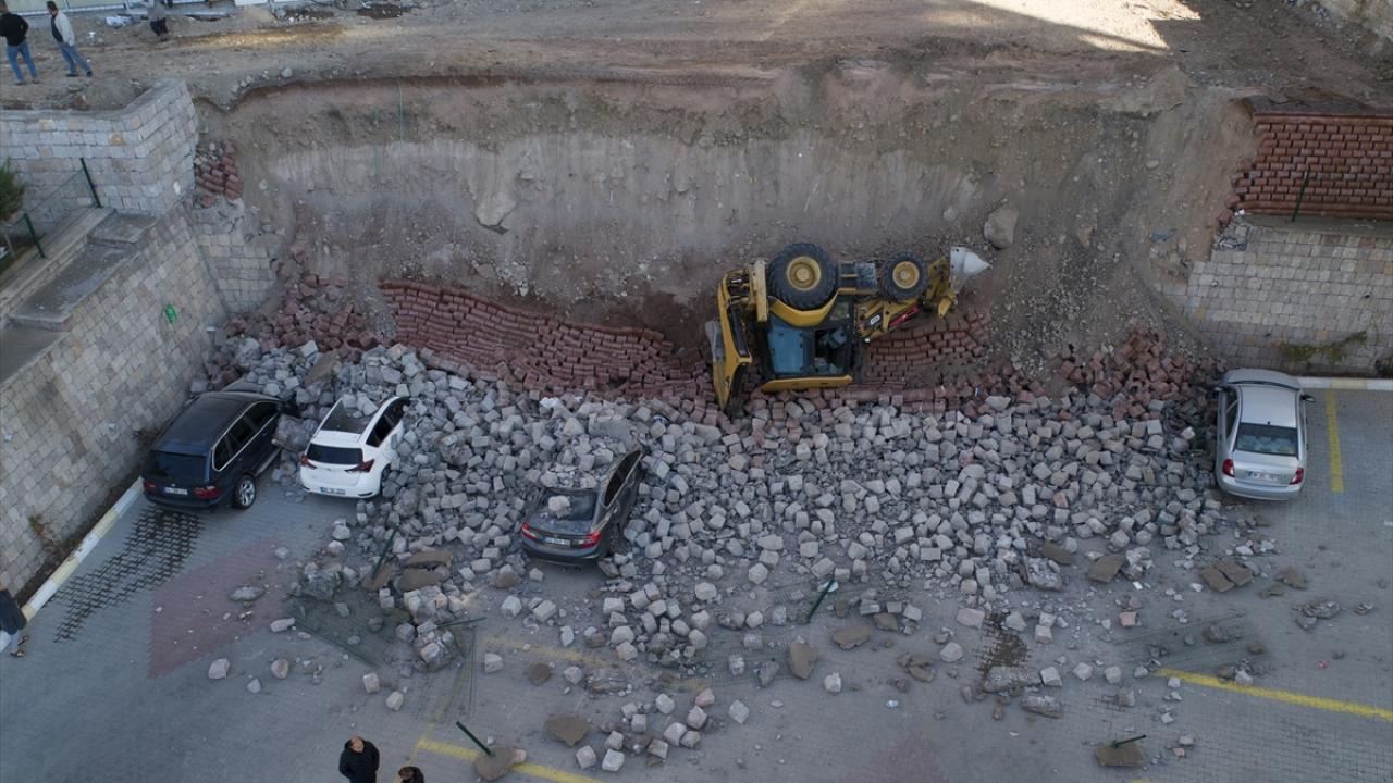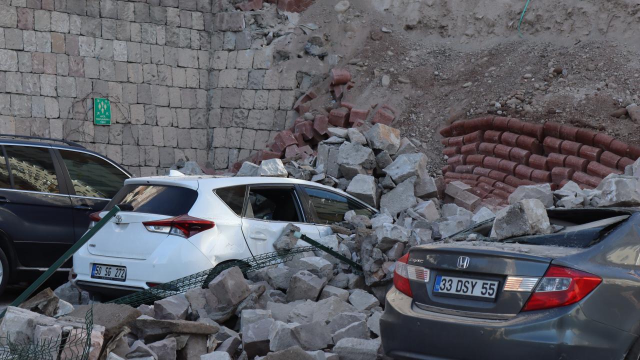 Kayseri'de çevre düzenlemesi sırasında istinat duvarı çöktü. Devrilen iş makinesinin operatörü yaralandı. Park halindeki 4 otomobil ise hurdaya döndü.