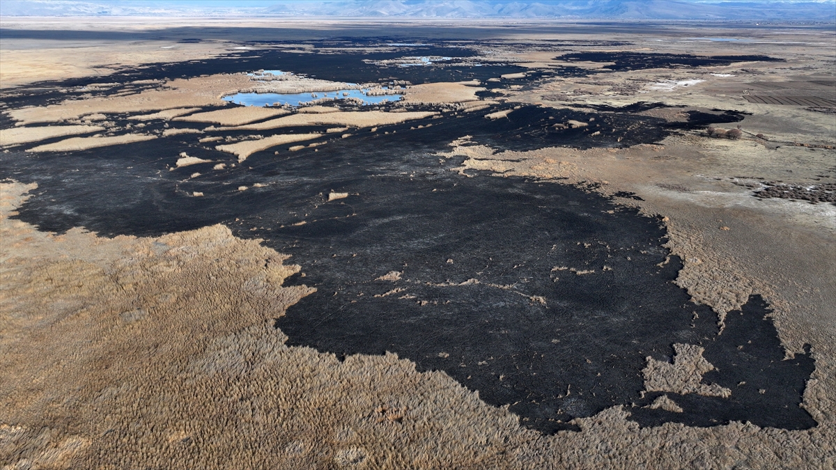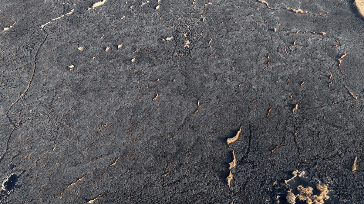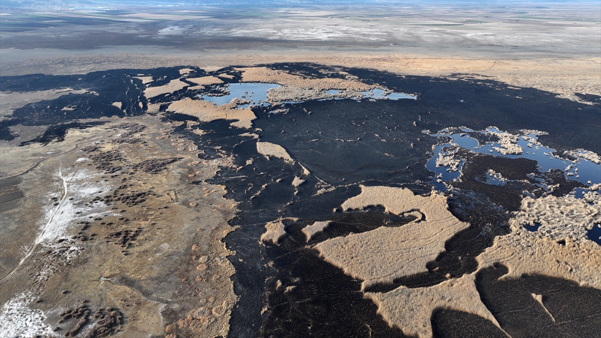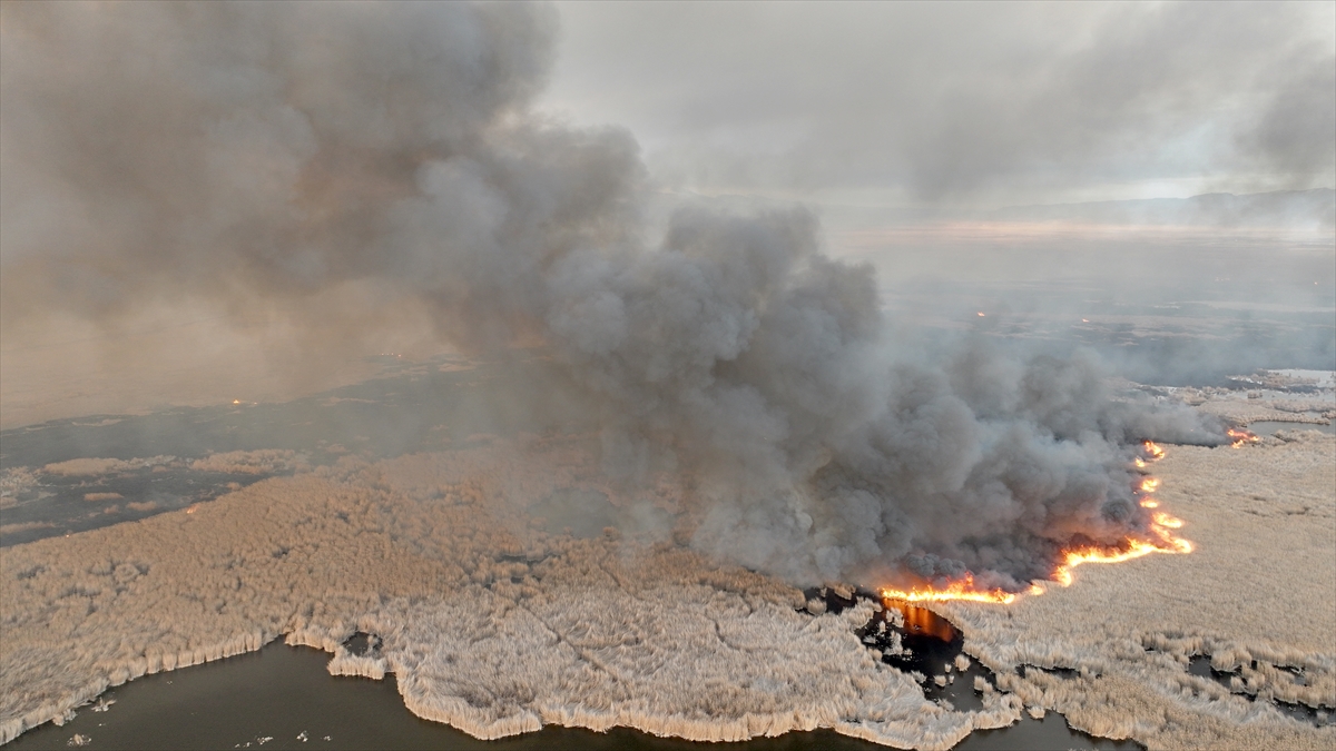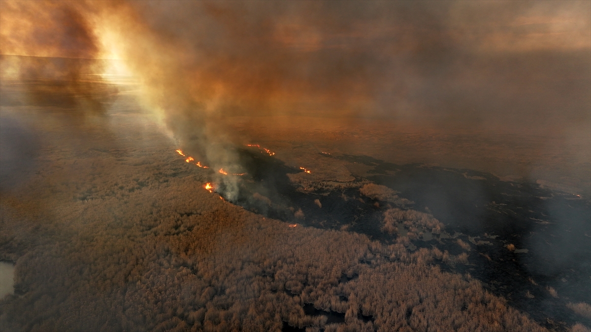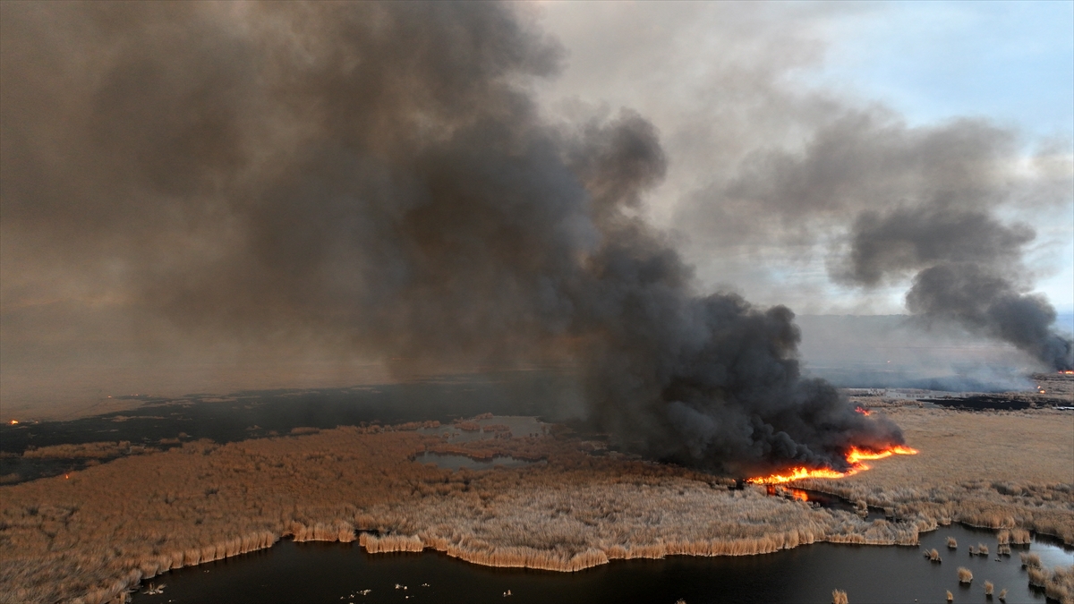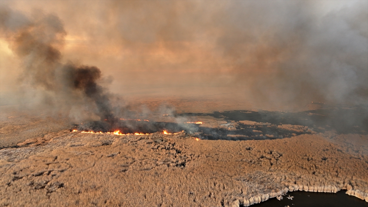 Görüntülerde farklı noktalarda geniş alanların yandığı, bazı bölgelerde ise sulak alanların yangının yayılmasını engellediği görülüyor.