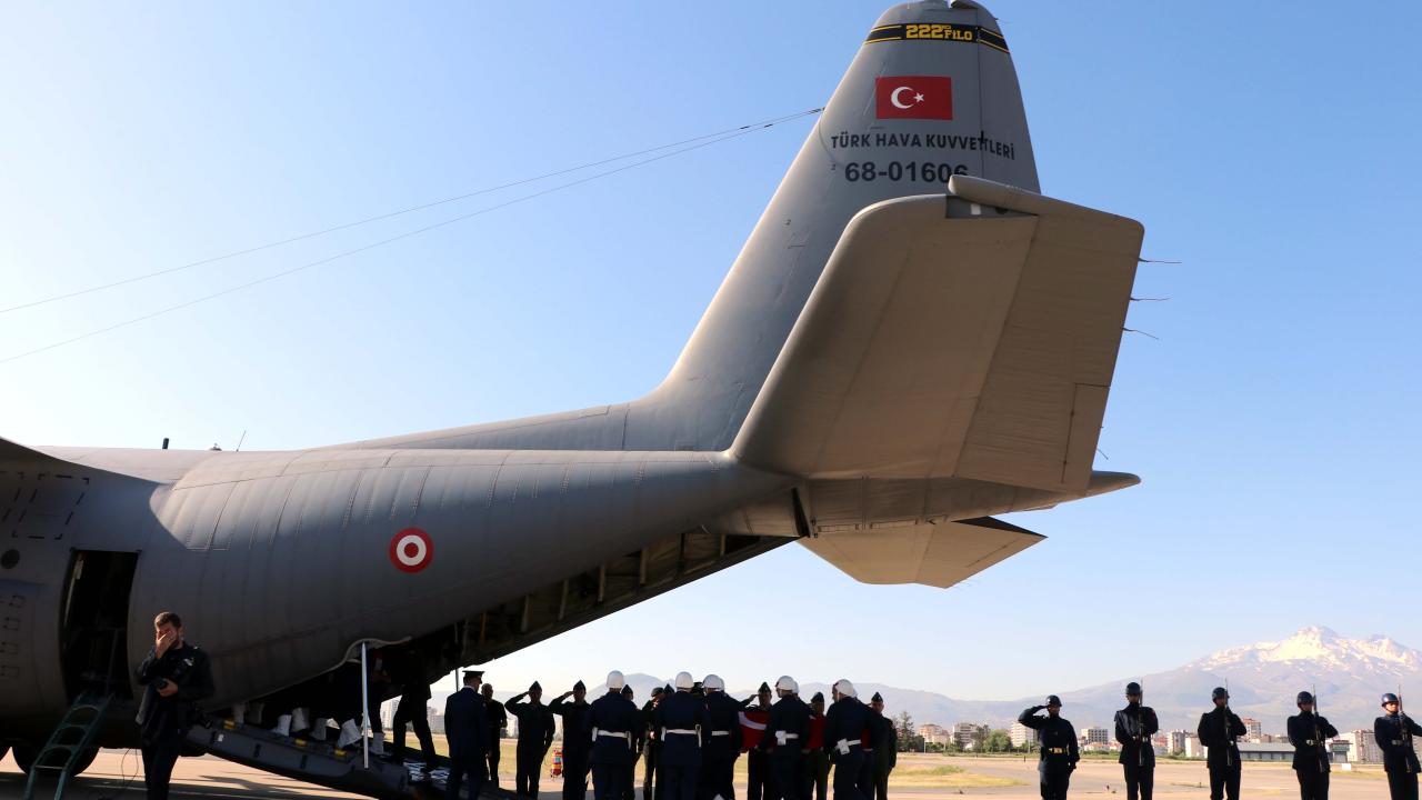 Şehit albaylar Yıldız ve Özen`in Türk bayrağına sarılı naaşları, Kayseri Devlet Hastanesi morgundan alınarak 12`nci Hava Ulaştırma Ana Üs Komutanlığına getirildi.
