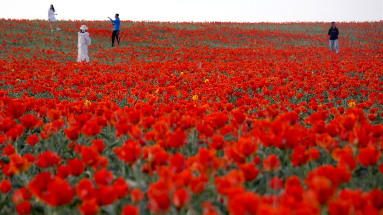 Bu yıl da doğaseverler ve fotoğrafçılar, adeta kırmızı bir halıyı andıran manzaralar sunan lale tarlalarına yoğun ilgi gösteriyor.