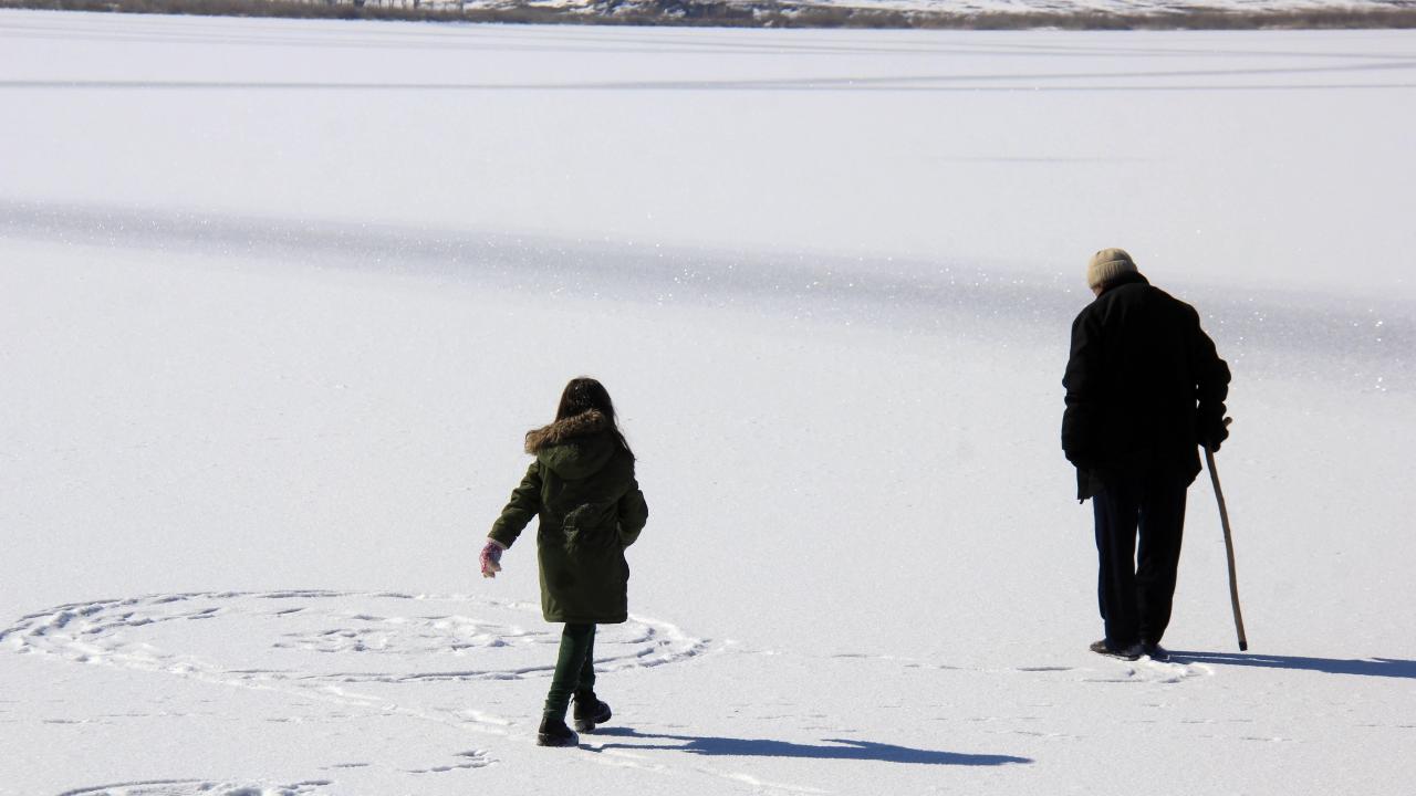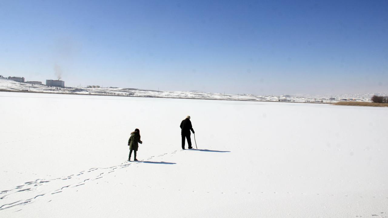 Bazı vatandaşlar buzla kaplanan gölün yüzeyinde yürüdü.