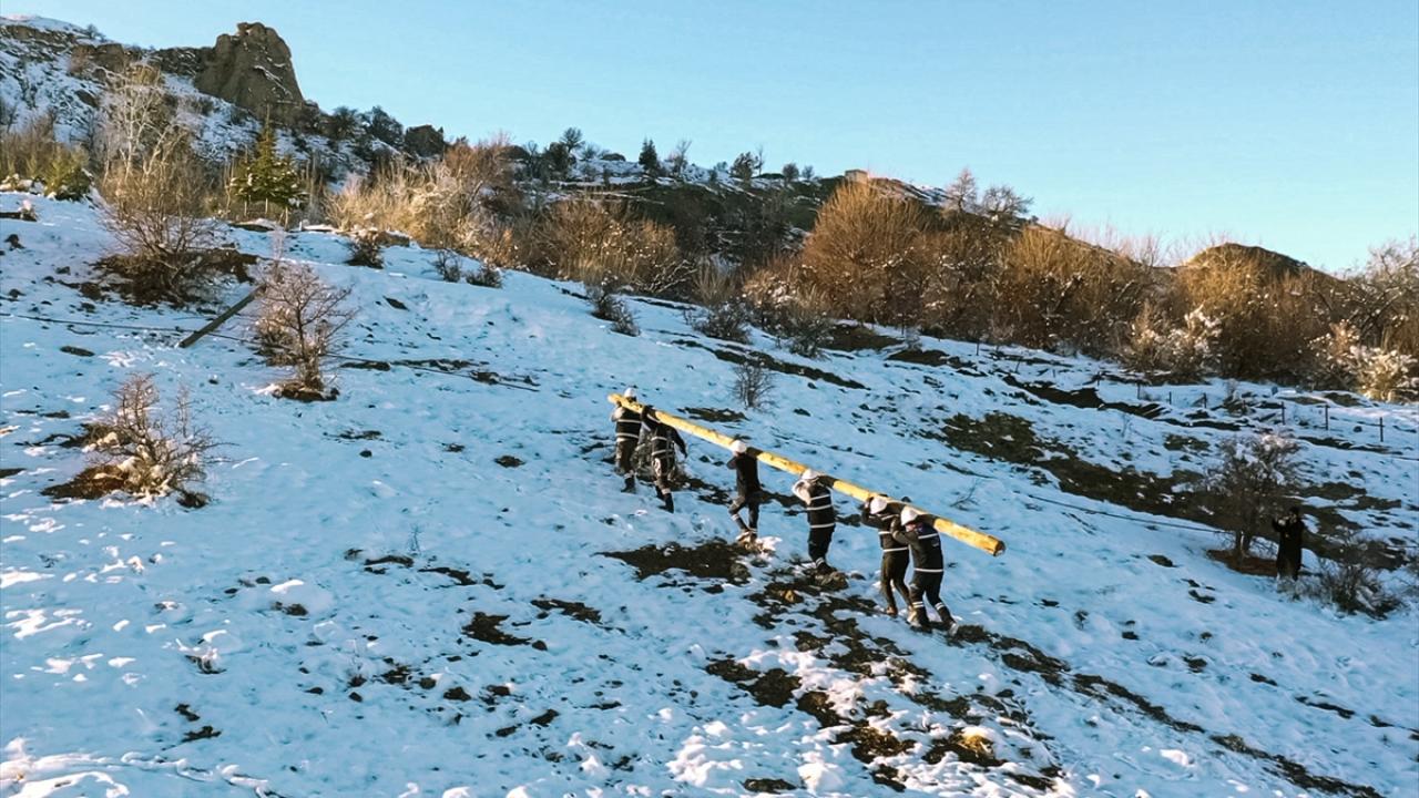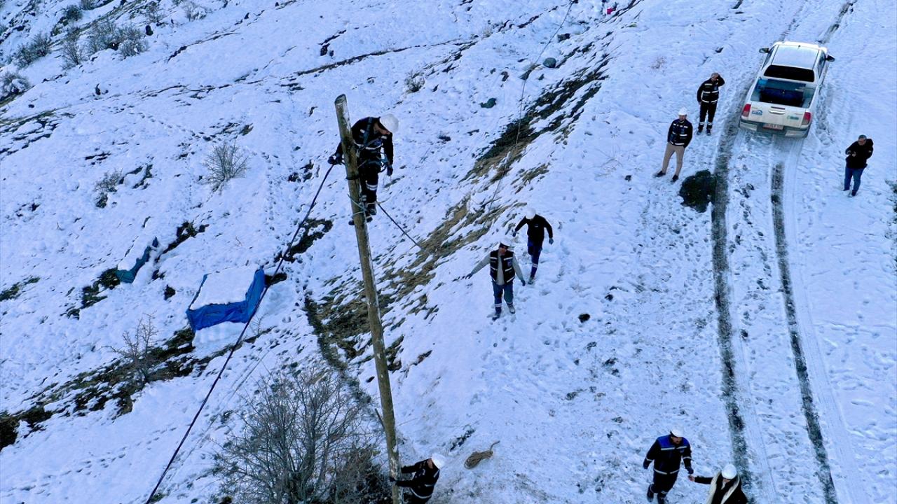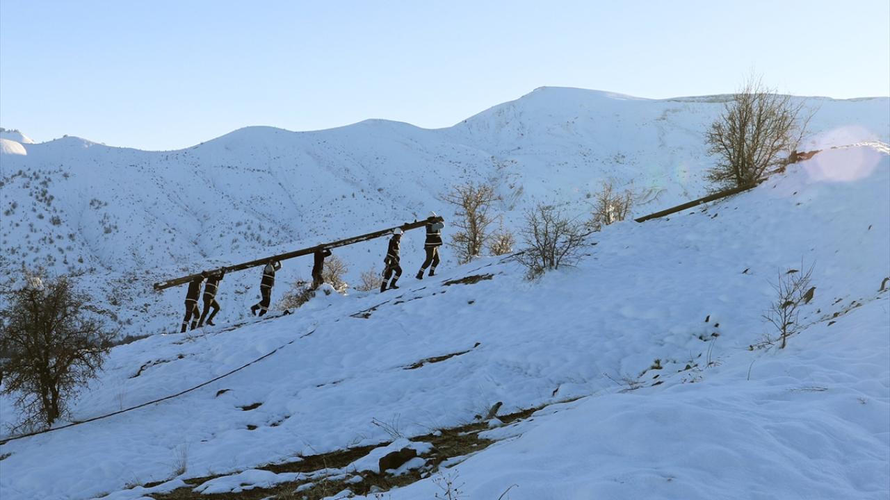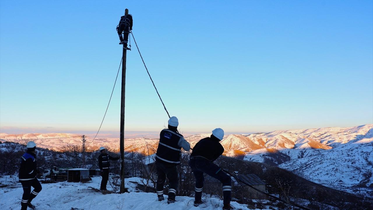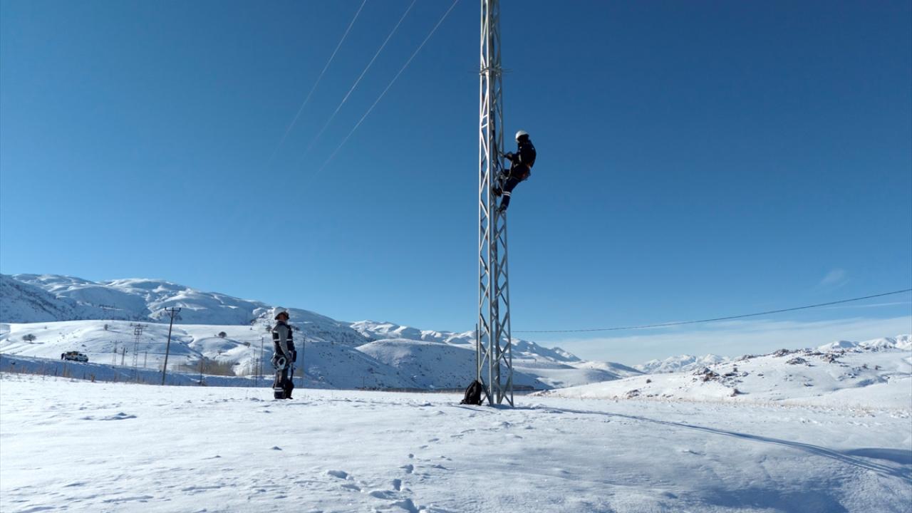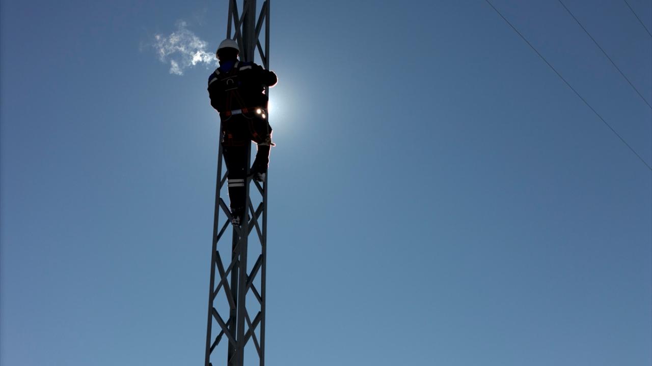 Yoğun kar yağışı nedeniyle zaman zaman ulaşımın kesintiye uğradığı ve arızanın meydana geldiği bölgeye yürüyerek güçlükle ulaşan ekipler, dondurucu soğukta elektrik direklerine çıkıp kesintisiz enerji sağlamak için uğraş veriyor.