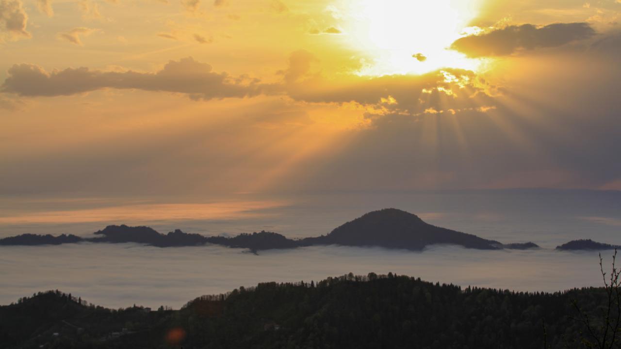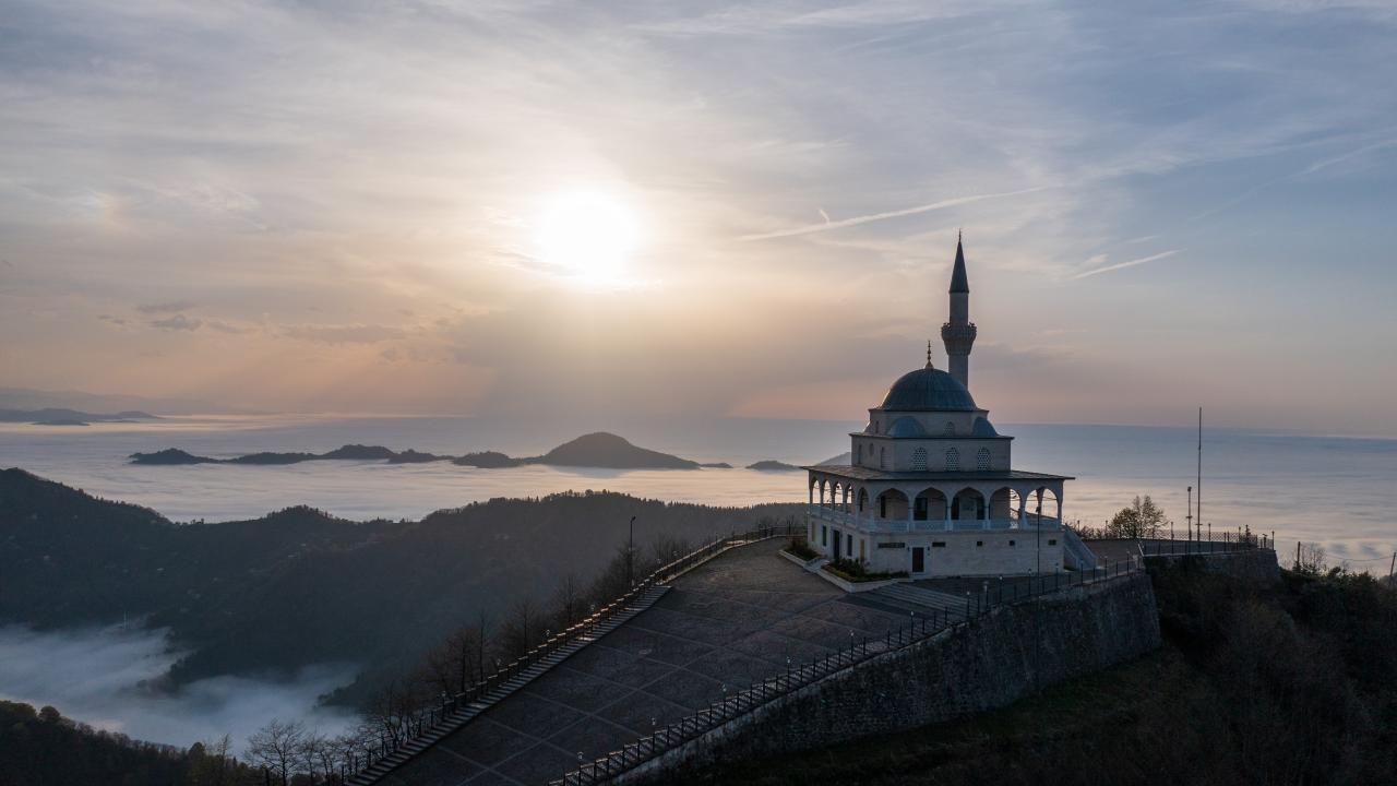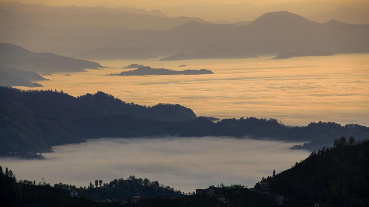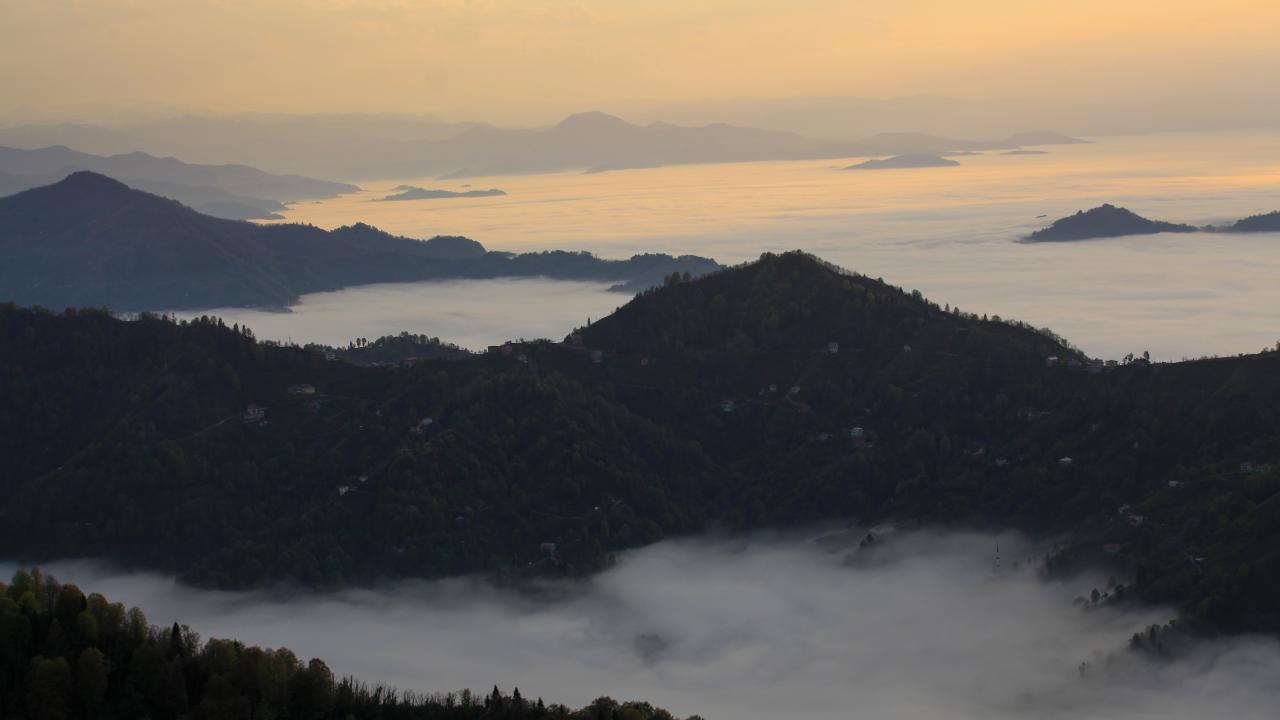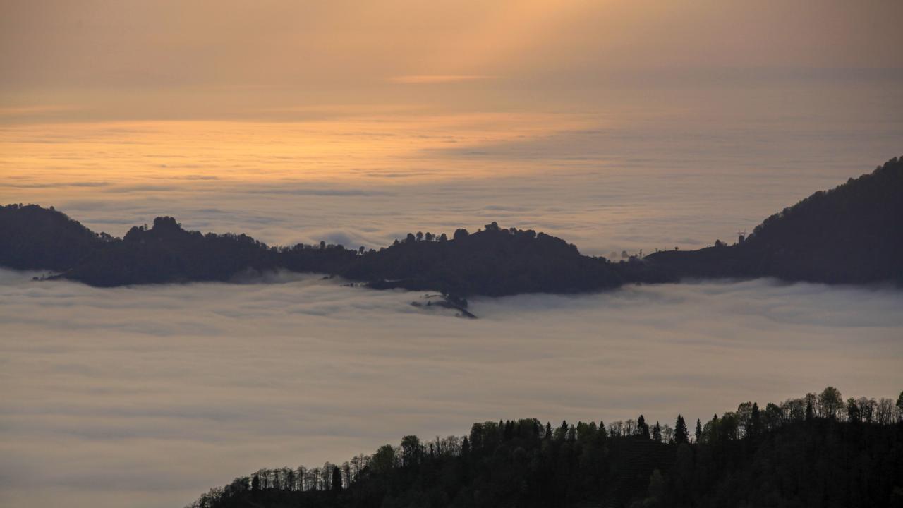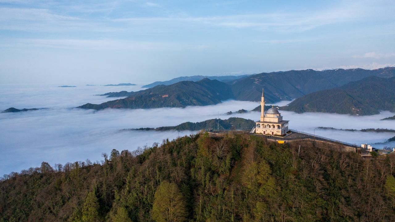 Rize’nin Güneysu ilçesinde yer alan Kıble Dağı’nın 1130 rakımlı zirvesi, etrafını saran sis bulutlarıyla birlikte görüntülendi.
