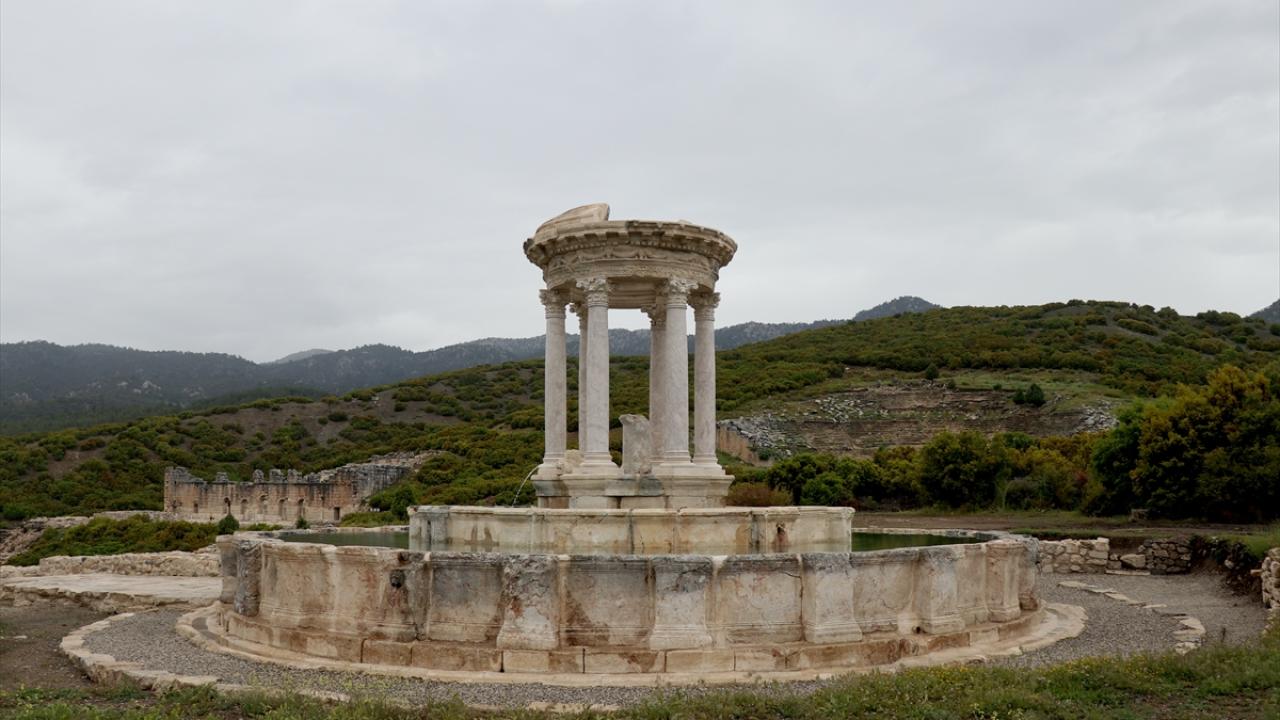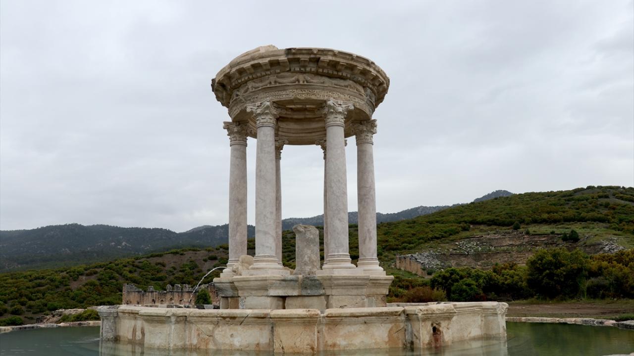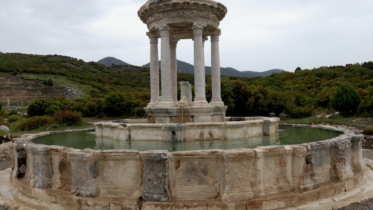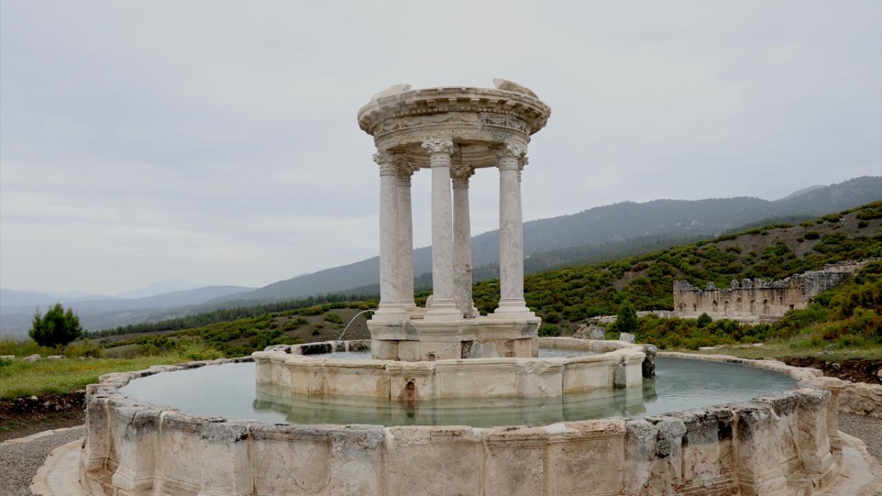 Burdur'un Gölhisar ilçesindeki Kibyra Antik Kenti'nde restorasyon sonucu ayağa kaldırılan yuvarlak planlı 2 bin yıllık anıtsal çeşmeye, antik kaynağın suyu verildi.