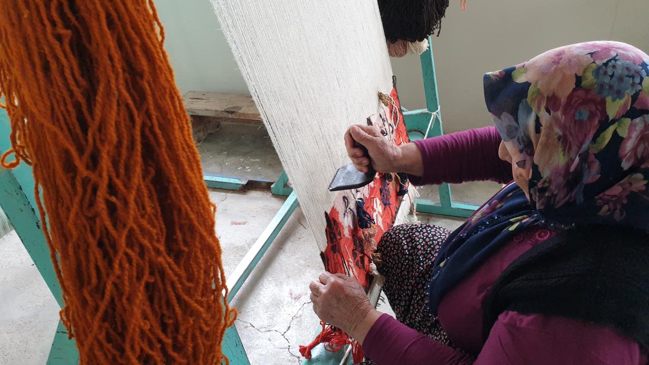 Cafri, kooperatifte açılan ve şu an 15 kursiyerin bulunduğu tescilli Karatepe kilimi dokuma kursunda genç kızlara işin inceliklerini öğretiyor.